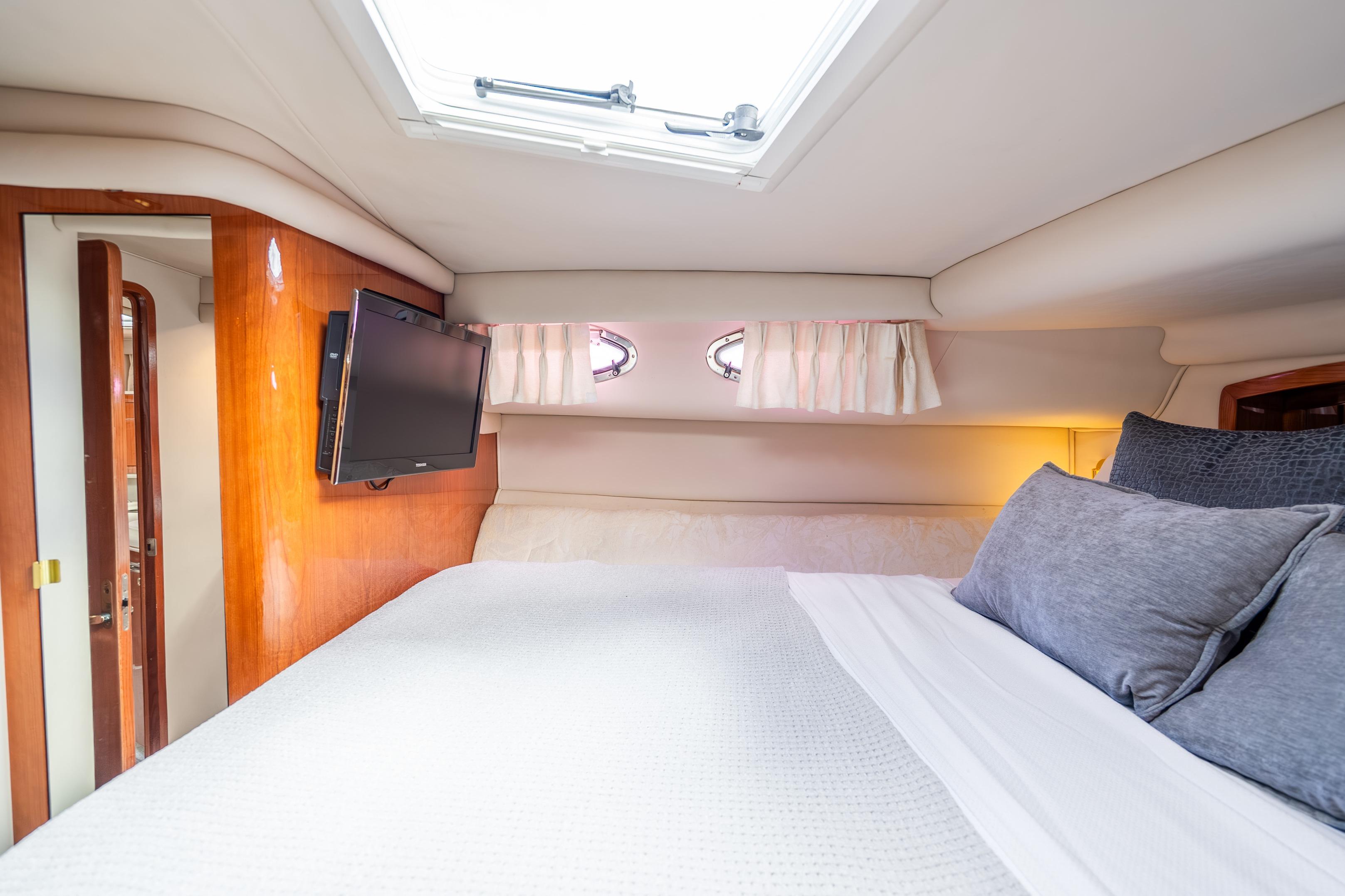 The Sea Ray 450 Sundancer "Knot EZ II" is a well maintained and mechanically sound vessel with all the amenities a family might need for coastal cruising, overnight trips, or just a day at the sandbar. The cockpit provides wonderful space for relaxing, with a spacious circular aft-facing seat, U-shaped seating, and Euro cockpit tables that convert to a sunpad. The aft sunpad turns into a useful chart table. If water toys are a part of the game plan, the 450 Sundancer has plenty of room for storing them. The oversize integral TNT swim platform is large enough to hold a personal watercraft and is remote actuated for convenience, while the aft wall fender storage neatly organizes docking equipment. The standard Lofrans Progress I rope - chain windlass makes anchoring easy. Four lockable translucent deck hatches with screen covers, sliding windows and ten opening port lights provide natural light and fresh air throughout the cabin on mild days. The vessel is outfitted with central heating and recently serviced air conditioning. In the salon, a sleeper sofa, hi-lo dining table, and entertainment center provide comfort and cool air away from topsides exposure. Amidships, the Sundancer berth functions as a conversation area by day and, by night, sleeping quarters for two in the double berth. There's also a cedar-lined hanging locker, vanity with drawers, and space for a TV - VCR - radio. The midships guest head has a VacuFlush toilet, vanity with sink, and fiberglass shower stall with curtain. The private master stateroom has a full-size bed with storage underneath, three cedar-lined hanging lockers with mirrored doors, vanity, pocket privacy door, and a flat screen television. The master head features a VacuFlush toilet, vanity with sink and mirrored medicine cabinet, and fiberglass shower stall with circular acrylic door. It's accessible from the salon or master stateroom. Faux-granite countertops highlight the full galley, with refrigerator - freezer, three-burner electric stove, and microwave. The galley includes ample cabinet space, a coffeemaker and blender.