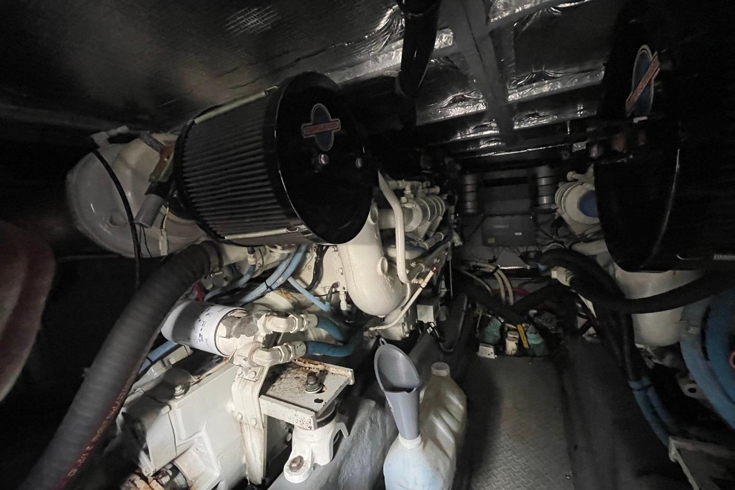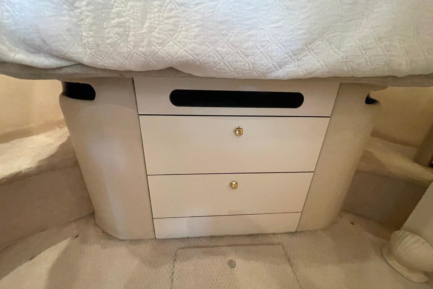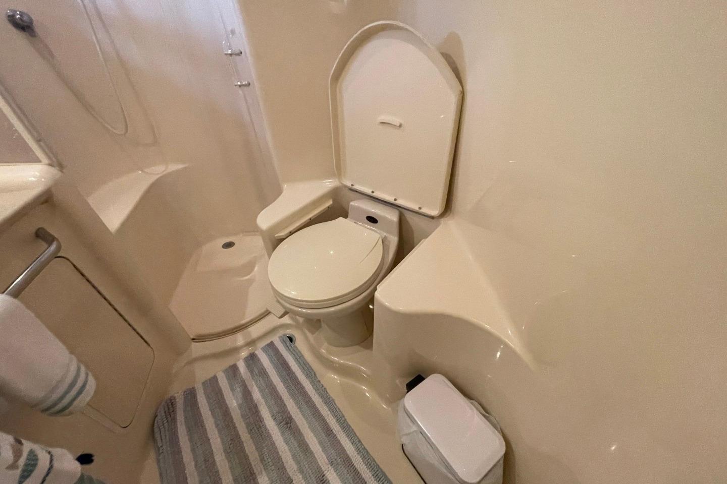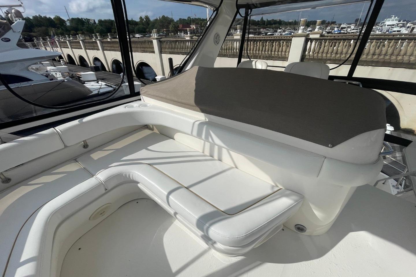 Starting as you board her from the large Swim Platform, you enter her cockpit which has been enclosed to make a great outdoor sitting area. She has a large storage hatch in the transom along with a bench seat. Her engine access is through a large hatch in the cockpit sole. Her cockpit, stairway to the bridge and bridge deck is on the port side. The stairway to the bridge is wide and easy to navigate. Her bridge is large and has her helm station with two swivel seats, a wet bar and l-shaped lounge forward, all kept comfortable by the reverse cycle heat and air. From the cockpit you enter her cabin via a sliding glass door and the first area is the salon, dinette and galley area. She has a settee along the port side that is electronically converted into a berth with the dinette forward. Her starboard side has an occasional chair and entertainment center, a country kitchen bar and galley forward. You move down the companionway steps and her guest cabin is to starboard and features an upper and lower berth that converts to a settee and is home to her washer/dryer. Her VIP Stateroom is to port and features a queen berth and entrance to the Guest Head (it also has an entrance from the companionway). All the way forward is her Master Stateroom which has an Island Queen Berth, Storage and entrance to the Master Head which is very impressive.