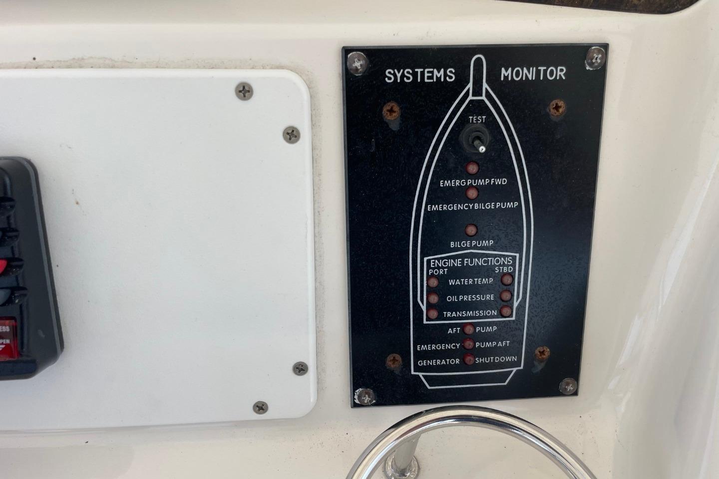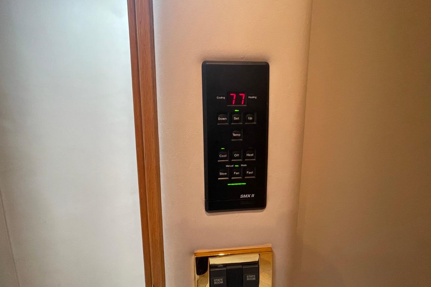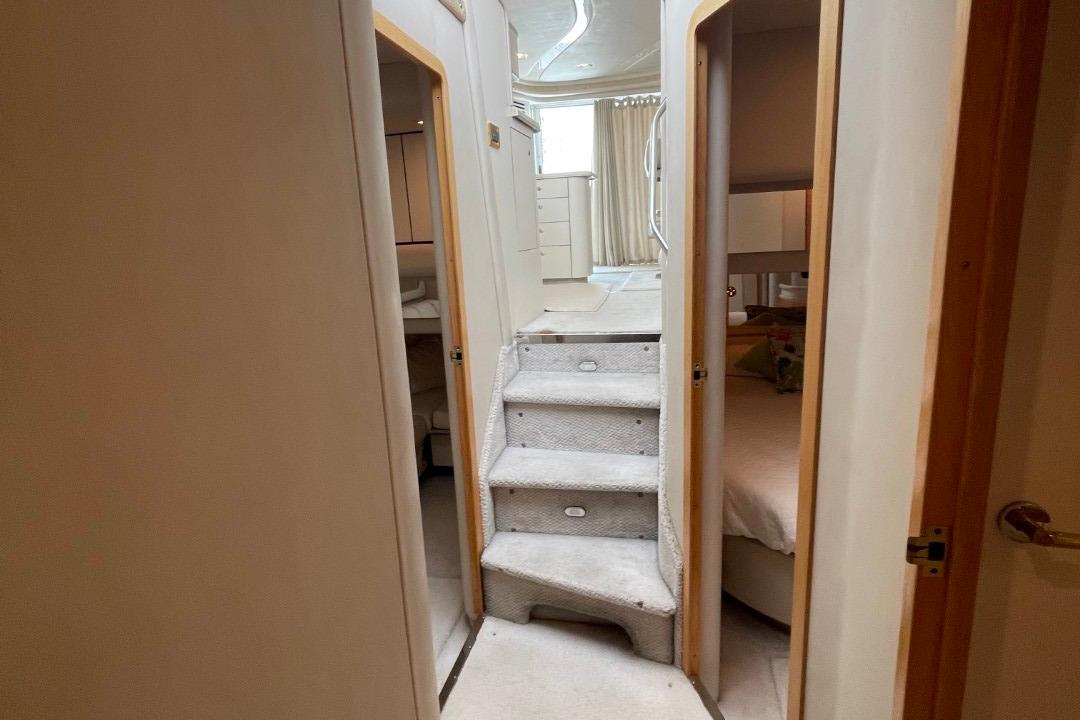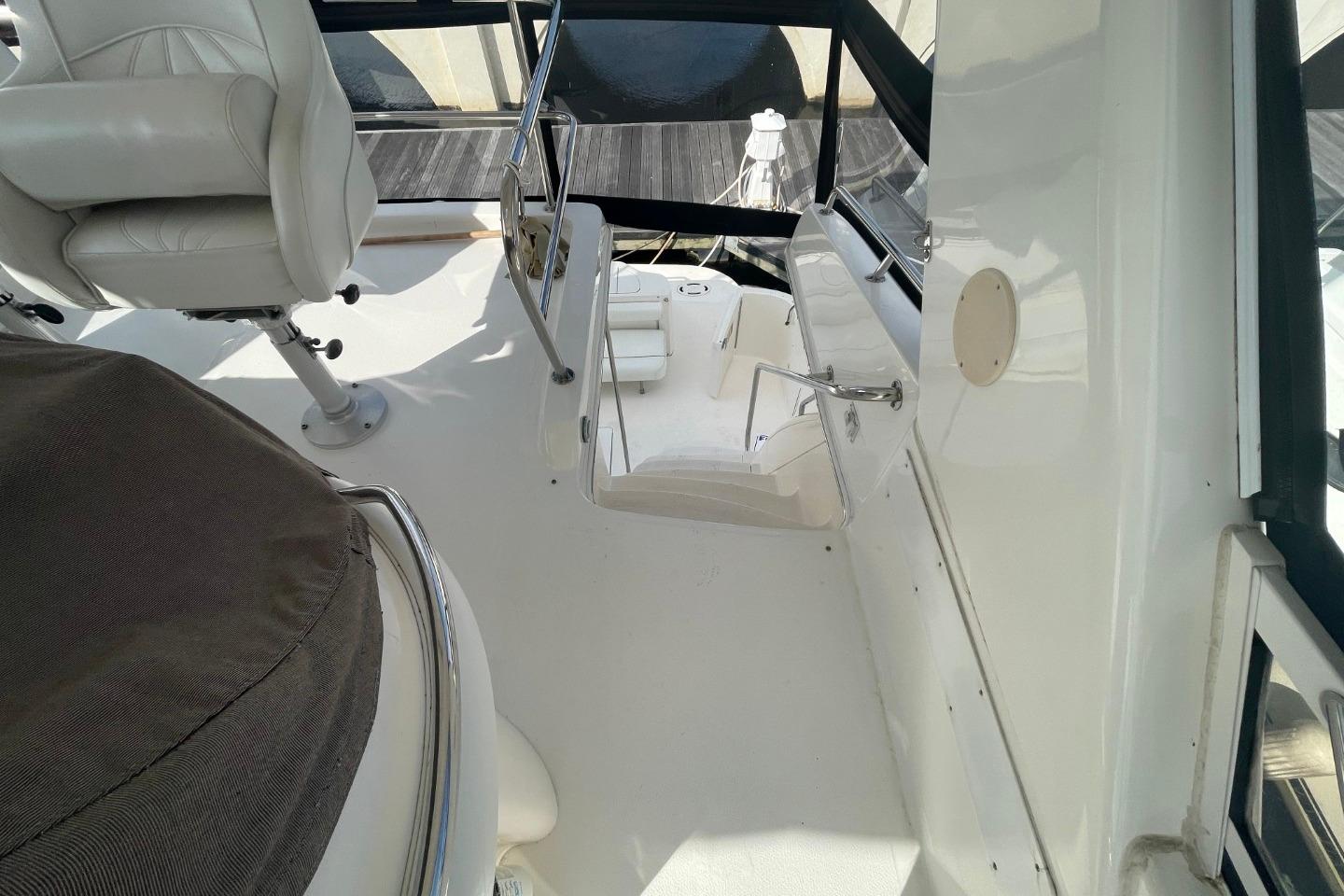 Starting as you board her from the large Swim Platform, you enter her cockpit which has been enclosed to make a great outdoor sitting area. She has a large storage hatch in the transom along with a bench seat. Her engine access is through a large hatch in the cockpit sole. Her cockpit, stairway to the bridge and bridge deck is on the port side. The stairway to the bridge is wide and easy to navigate. Her bridge is large and has her helm station with two swivel seats, a wet bar and l-shaped lounge forward, all kept comfortable by the reverse cycle heat and air. From the cockpit you enter her cabin via a sliding glass door and the first area is the salon, dinette and galley area. She has a settee along the port side that is electronically converted into a berth with the dinette forward. Her starboard side has an occasional chair and entertainment center, a country kitchen bar and galley forward. You move down the companionway steps and her guest cabin is to starboard and features an upper and lower berth that converts to a settee and is home to her washer/dryer. Her VIP Stateroom is to port and features a queen berth and entrance to the Guest Head (it also has an entrance from the companionway). All the way forward is her Master Stateroom which has an Island Queen Berth, Storage and entrance to the Master Head which is very impressive.