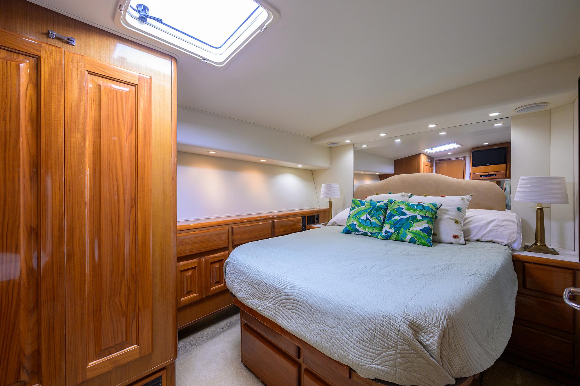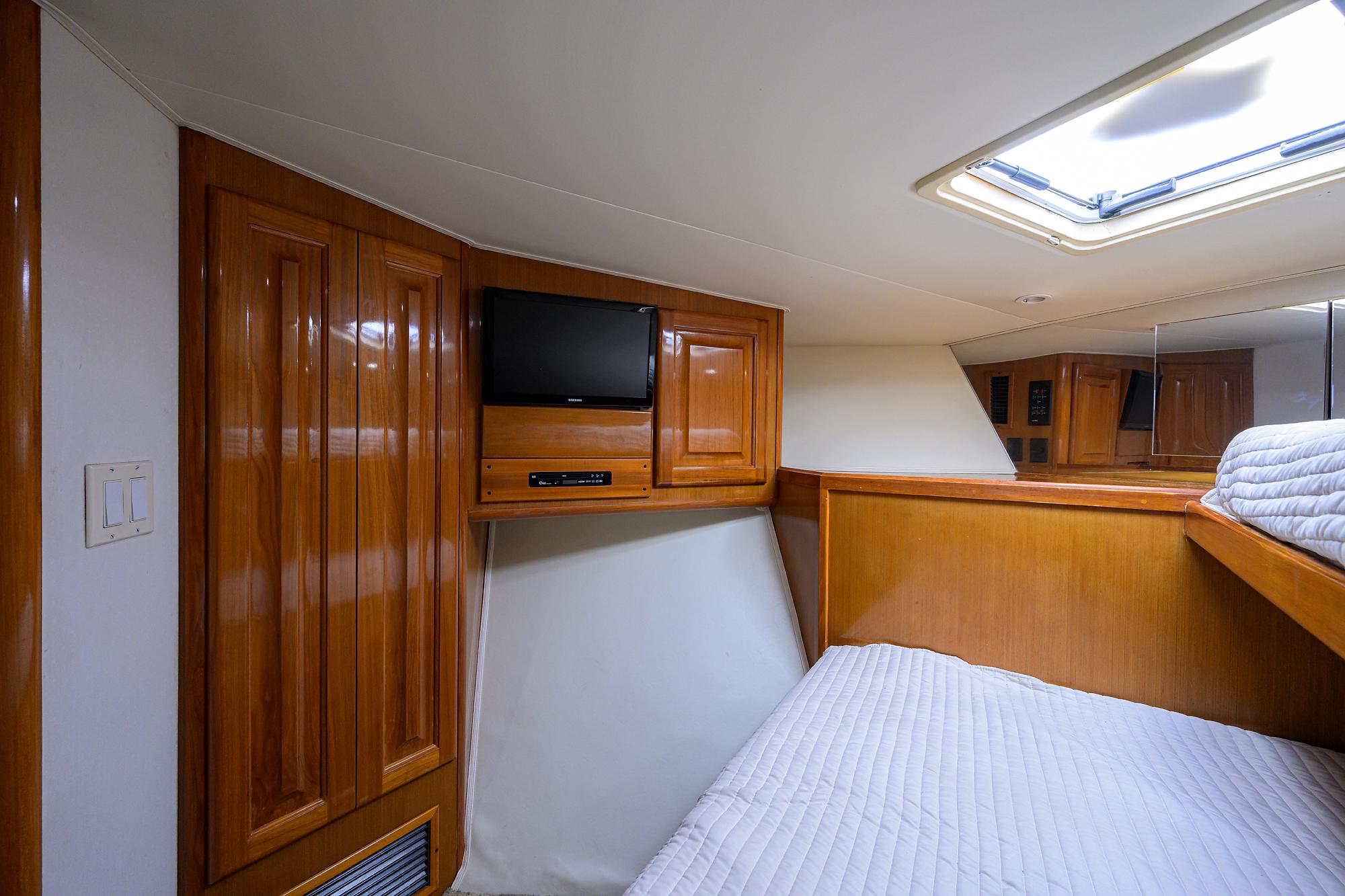 In the cabin is a hanging locker and sideboard/cabinet storage outboard, while to starboard is a fixed cabinet drawer/shelf module, with a bulkhead flat-screen TV forward of the door. Moving aft in the master cabin is a transverse queen berth with end table modules, lamps, and drawer/open storage below, and full-width mirror over hardwood bulkhead.
