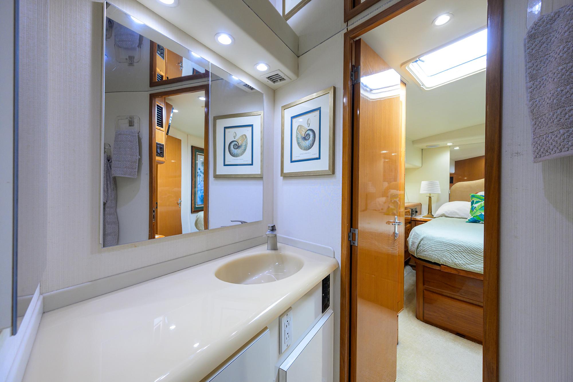 Forward in the cabin is an enclosed master head, with a molded beige Corian counter and mirrored vanity, beige porcelain toilet, and a molded shower enclosure with a massage wand, and hinged bi-fold door.