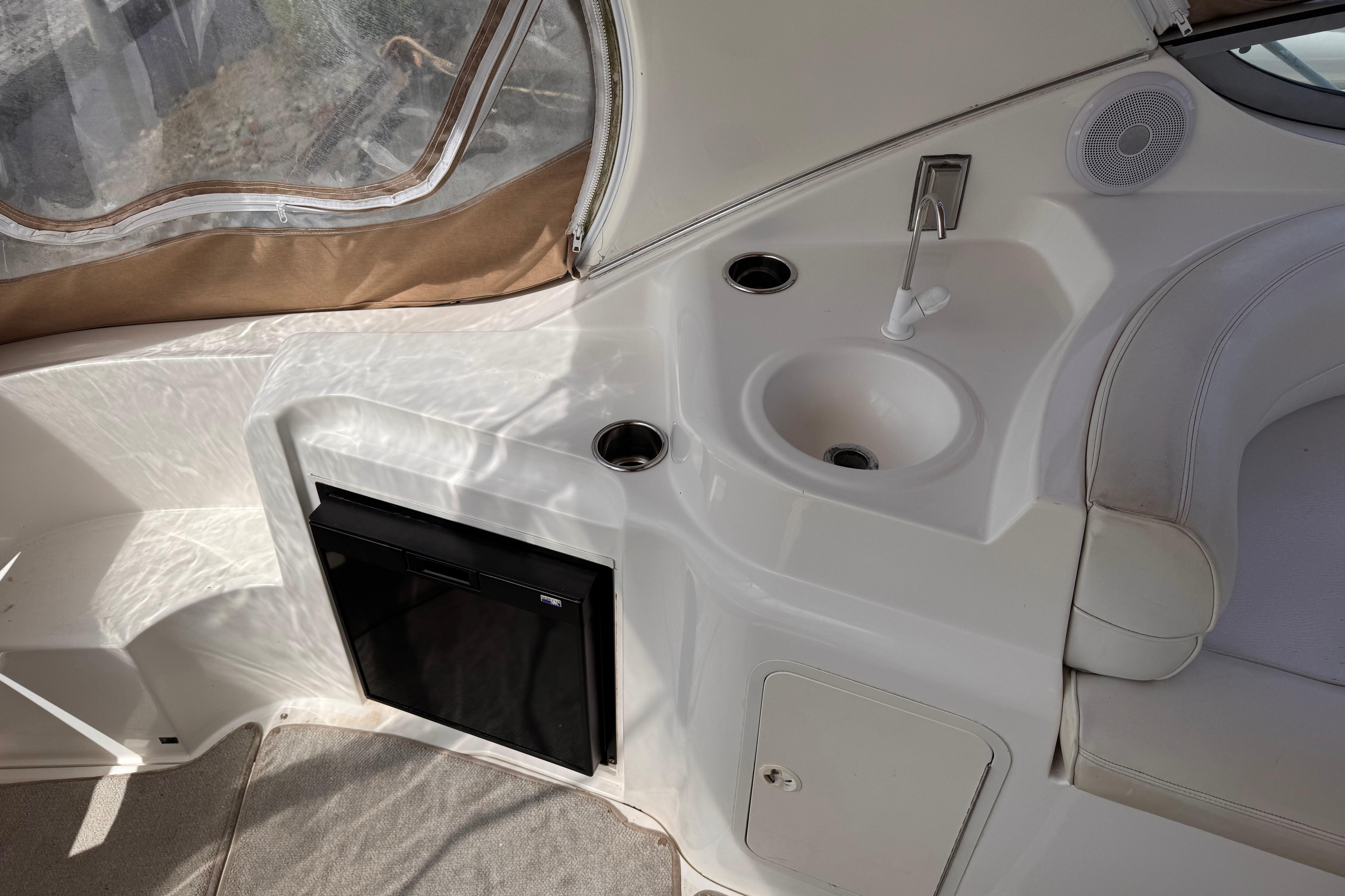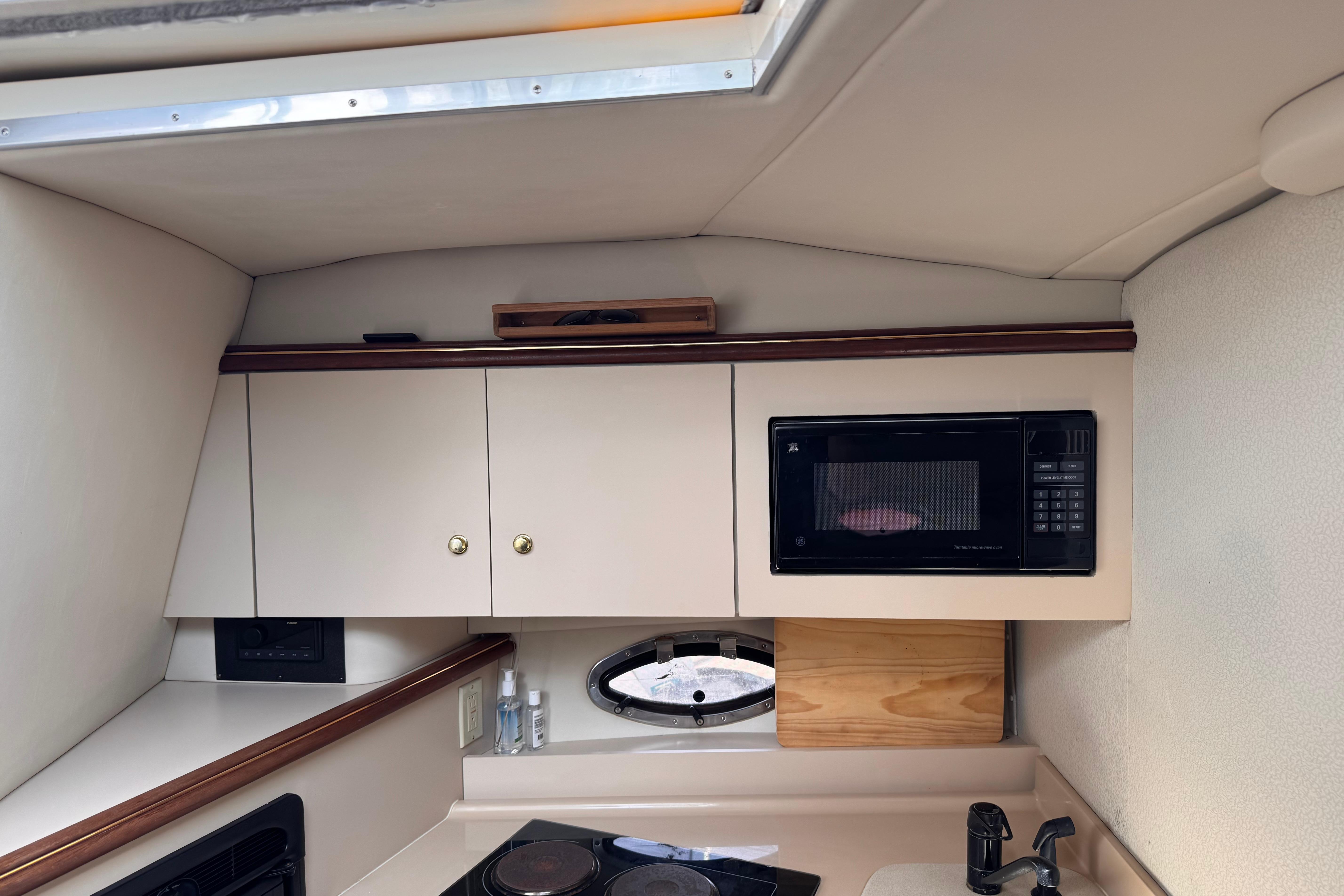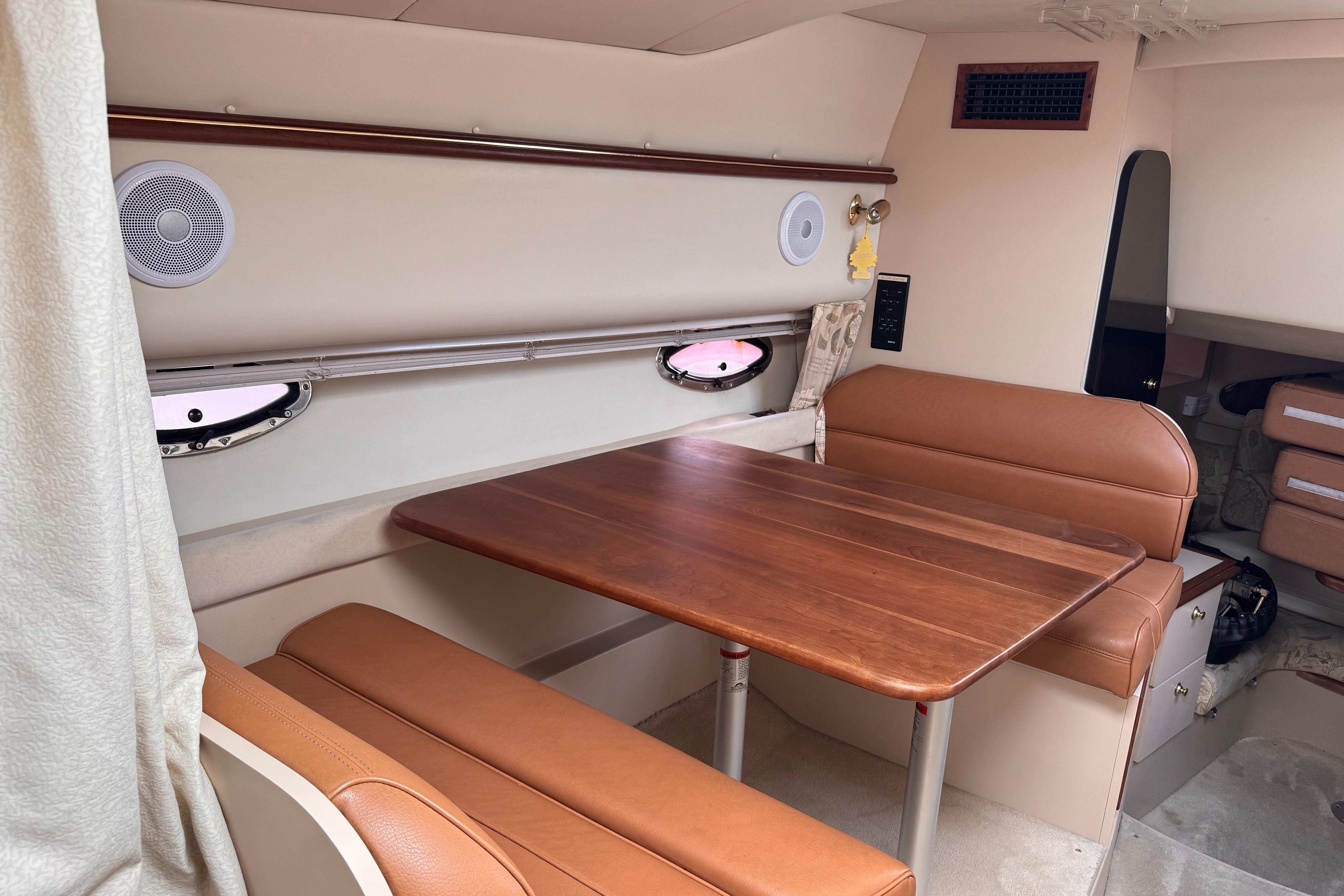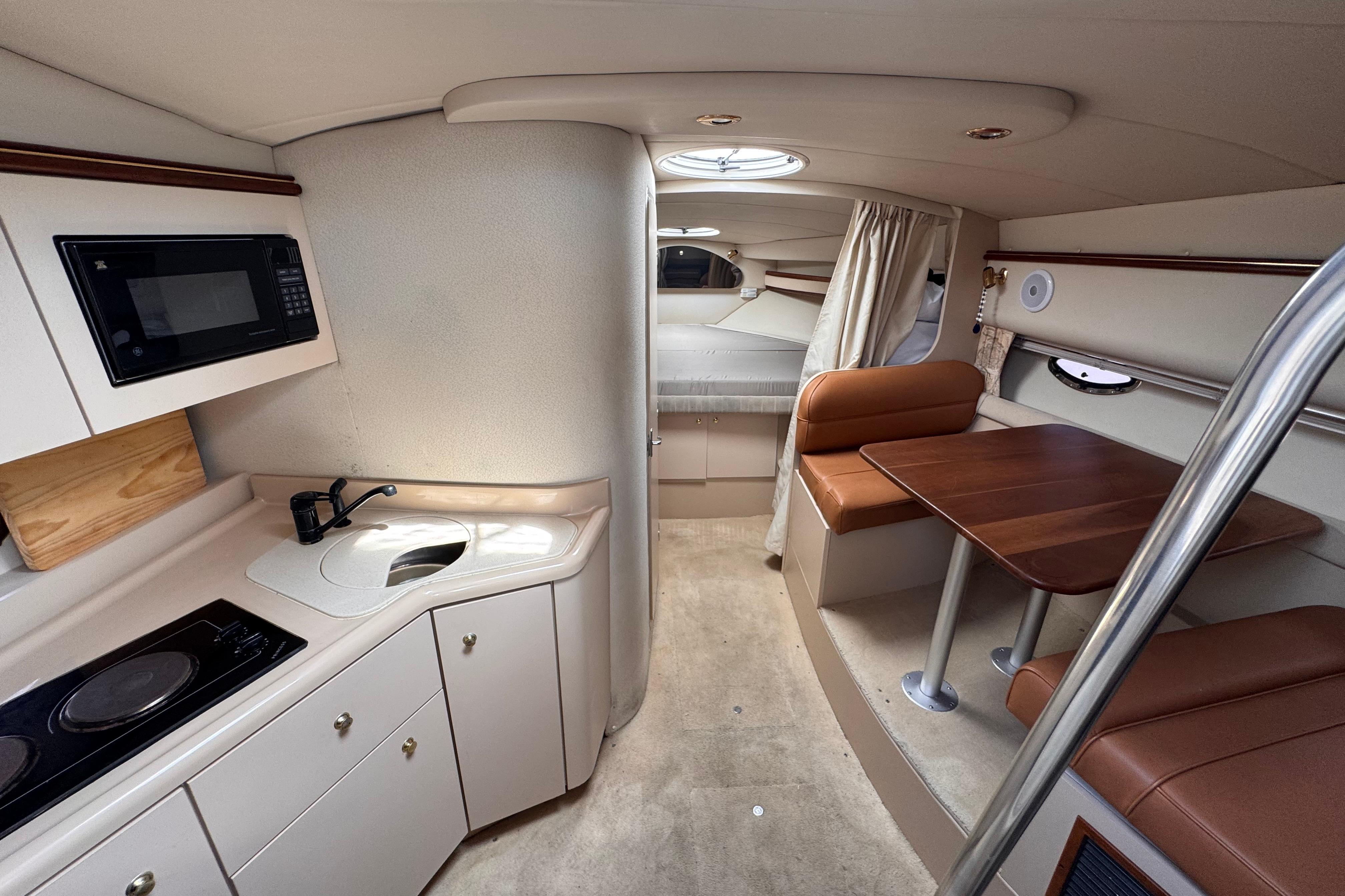 This yacht comfortably sleeps up to six people, boasting a roomy mid cabin, a dinette that converts easily to a double berth, and a forward double berth. The 11-foot, 8-inch beam contributes to ease of movement, while the ample locker storage and stand-up shower add to overall livability and convenience. The 3375's interior offers a spacious layout with generous 6-foot, 4-inch headroom. The functional dinette and full galley come equipped with an extra large refrigerator and freezer, a sink, a microwave oven, and an alcohol - electric stove.