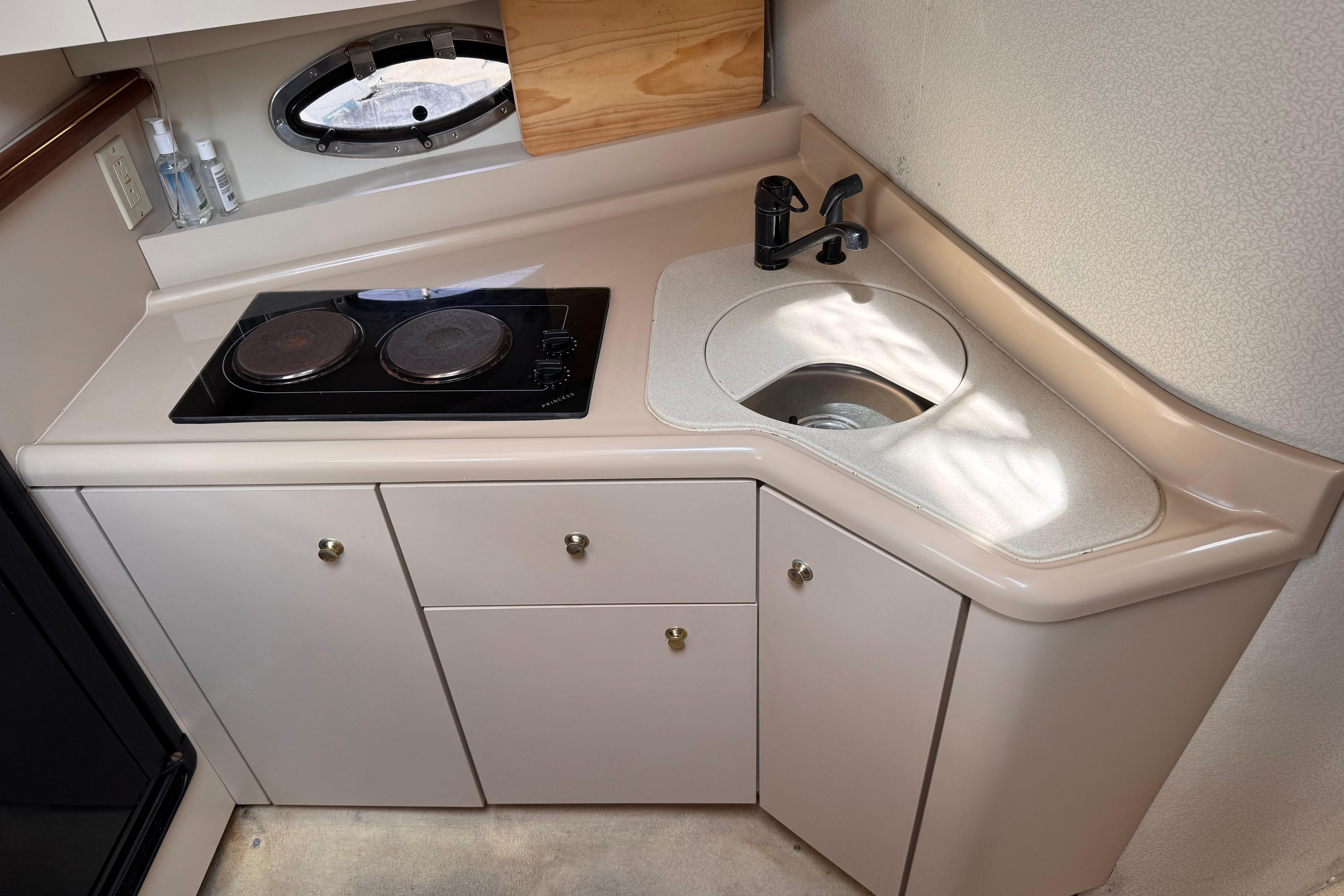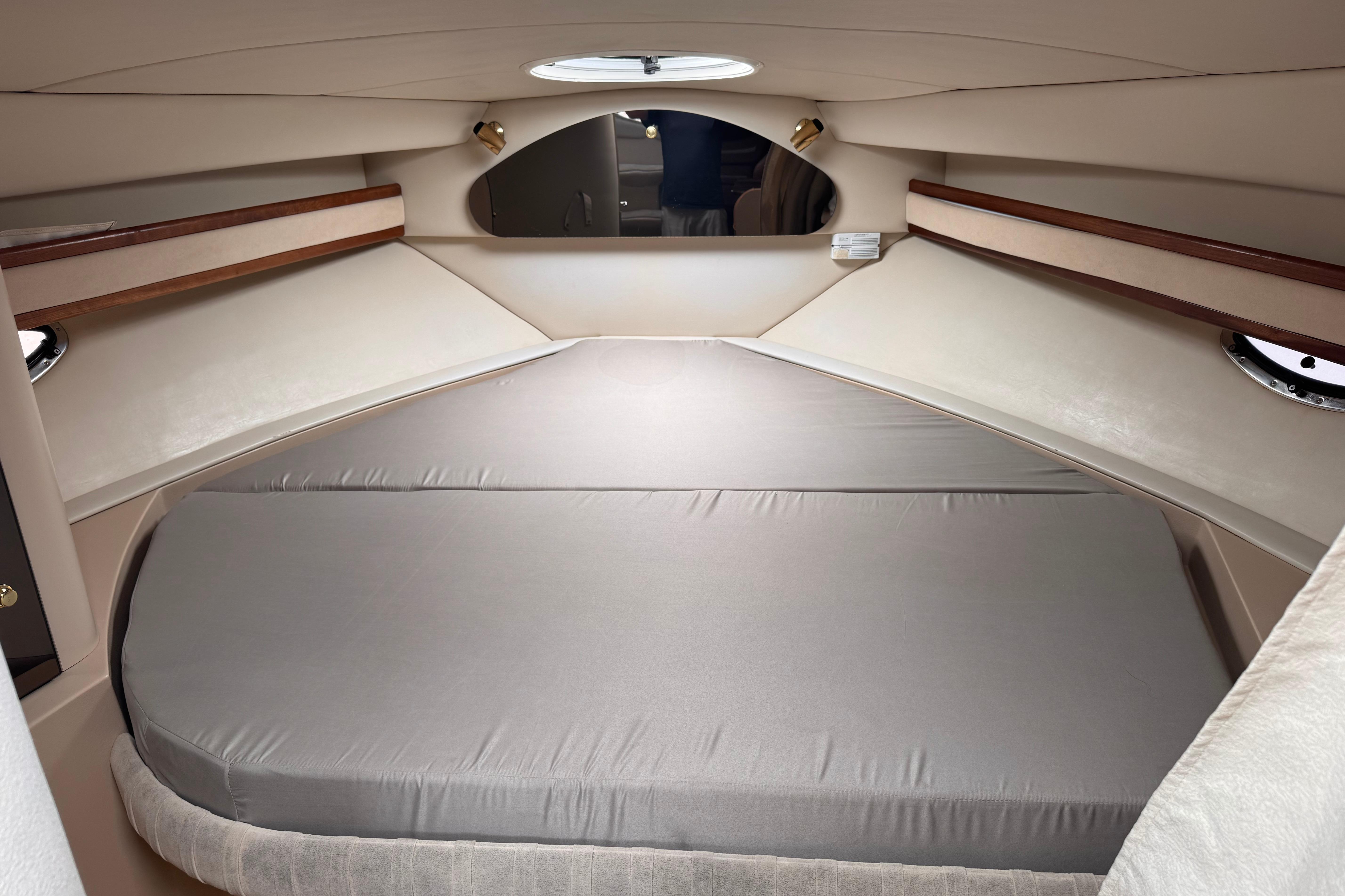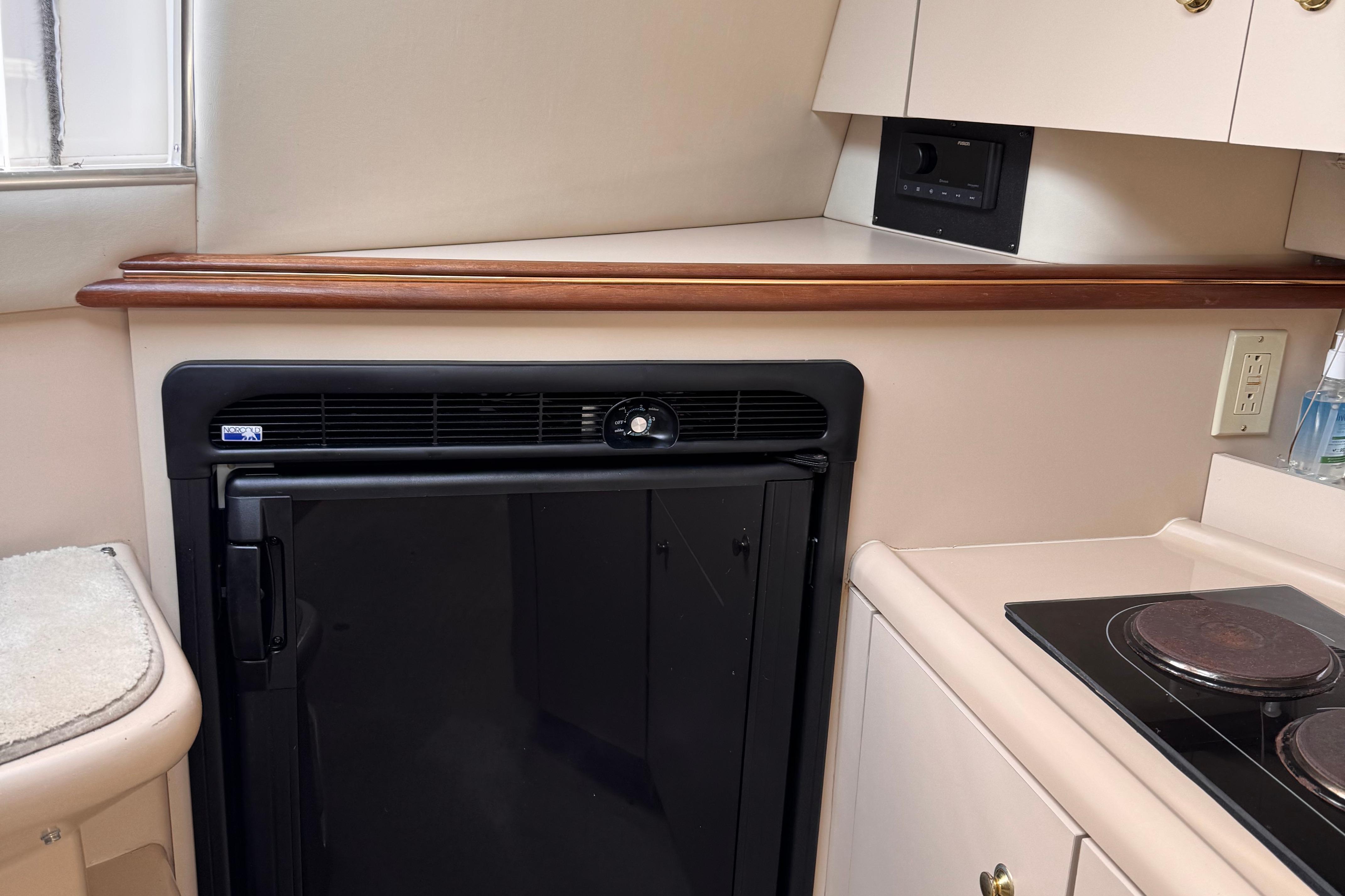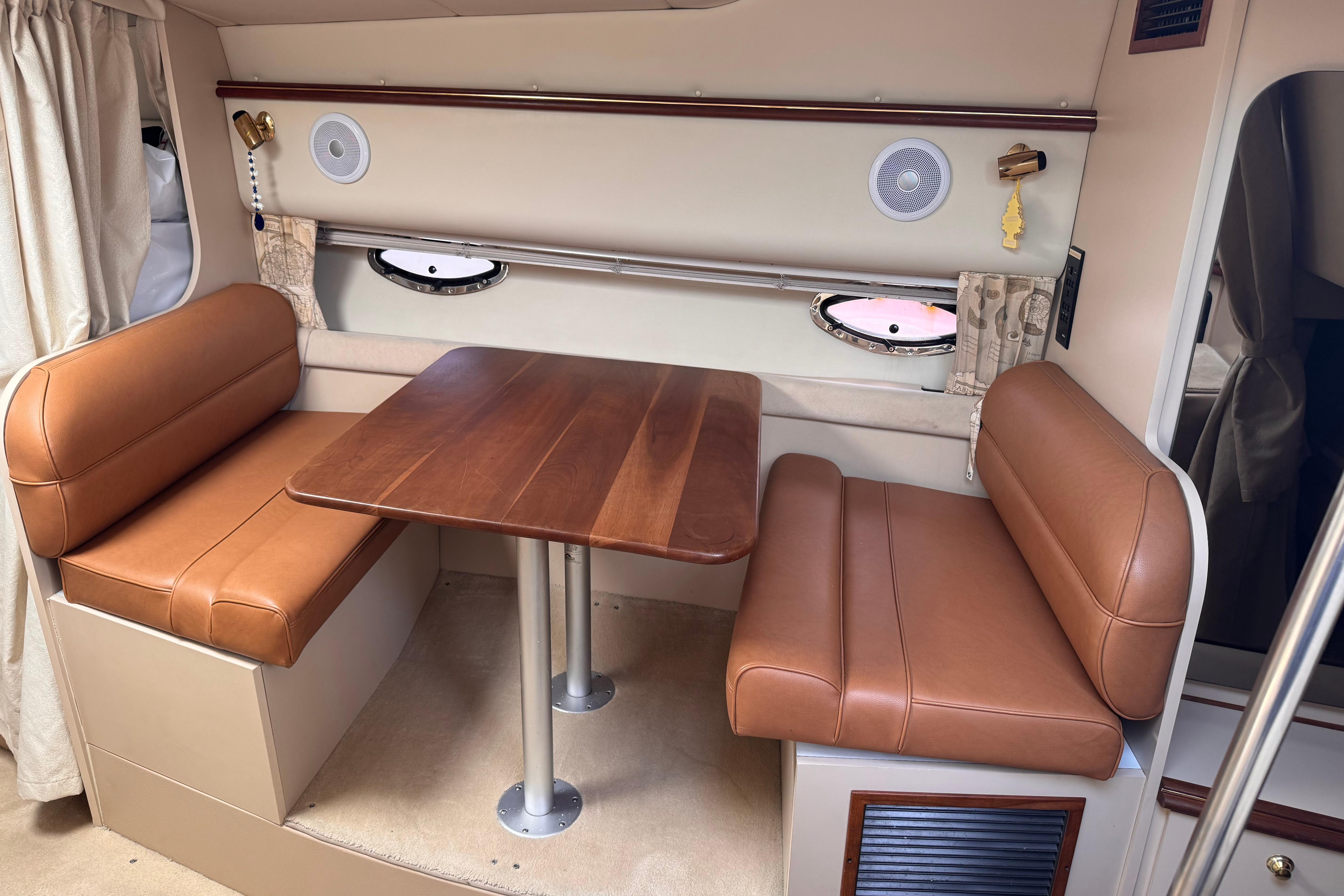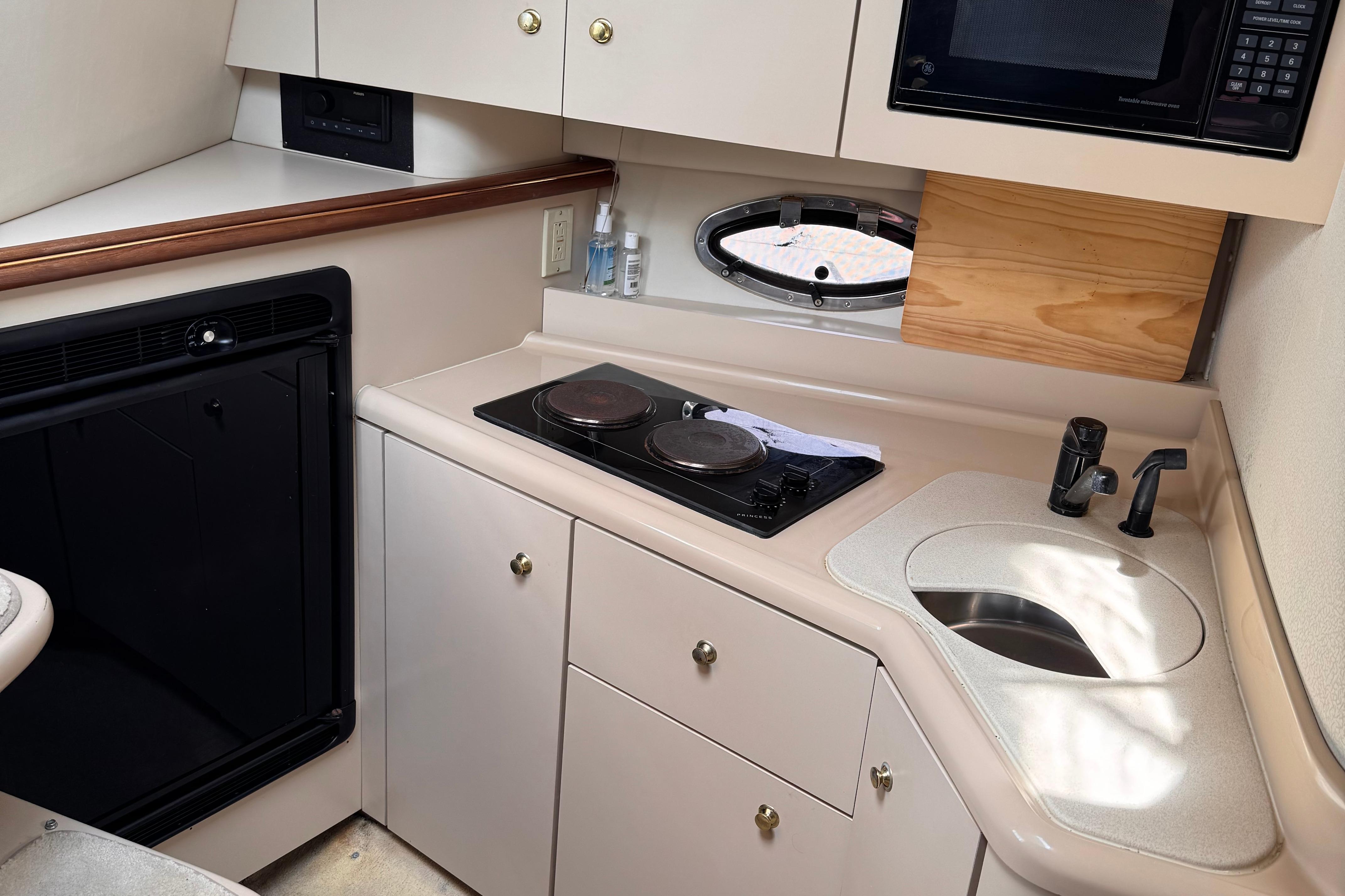 This yacht comfortably sleeps up to six people, boasting a roomy mid cabin, a dinette that converts easily to a double berth, and a forward double berth. The 11-foot, 8-inch beam contributes to ease of movement, while the ample locker storage and stand-up shower add to overall livability and convenience. The 3375's interior offers a spacious layout with generous 6-foot, 4-inch headroom. The functional dinette and full galley come equipped with an extra large refrigerator and freezer, a sink, a microwave oven, and an alcohol - electric stove.