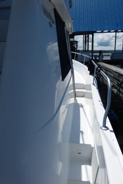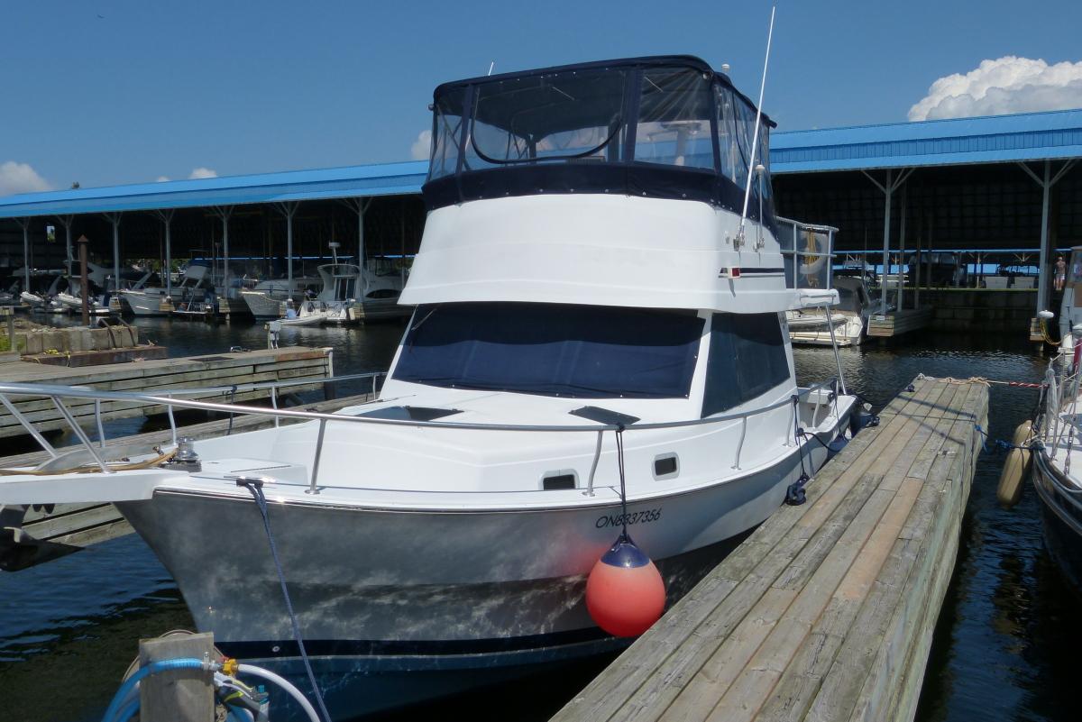 The Power Boat Guide says "The Mainship 350 Trawler (called the Mainship 390 in 1999–2005) is a stylish, moderately priced coastal cruiser with classic trawler lines and a good turn of speed. Unlike a true trawler with a full-displacement hull, the 350/390 is built on a faster modified-V hull with flat aft sections and a shallow, full-length keel. She’s a very roomy boat inside thanks to her wide 14-foot, 2-inch beam, and the floorplan manages to include double berths in both staterooms as well as a separate stall shower in the head. (Note that the guest stateroom is partially tucked beneath the galley.) Visibility from the lower helm is excellent, and a deck door provides easy access to the foredeck. Aft, a sliding glass door opens to the covered cockpit where a series of molded steps (instead of a ladder) ascends to the extended fly bridge. Additional features include deep, well-protected side decks, an integral swim platform, transom door, a full teak interior, and a radar/antenna mast."