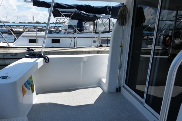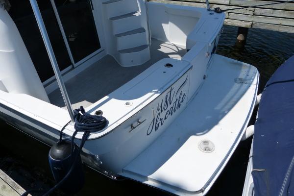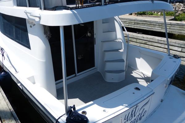 Aft Cockpit: Molded steps to bridge, transom door, gunwale storage lockers, molded steps to sidewalks.