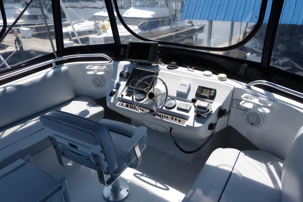 Command Bridge: Canvas enclosure, centerline helm with pedestal captains chair, port and starboard passenger seating for 6+ with storage under, folding table, electronics mast.