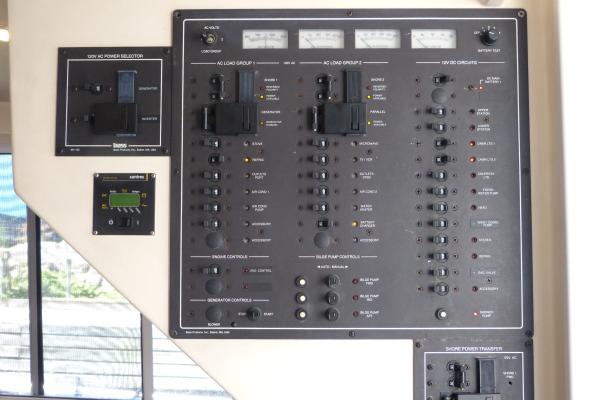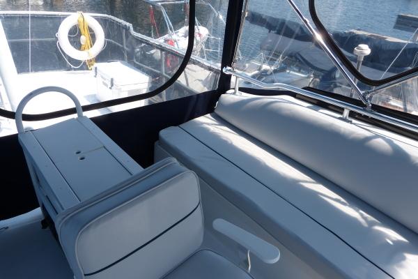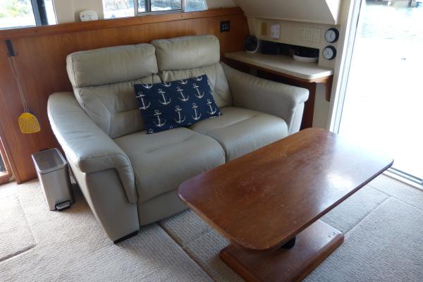 Salon: Full windshield with wiper/washer and sun curtain, opening centre window, lower helm station with full instrumentation, teak finishes and cabinetry, recliner sofa, hi-lo teak table with teak folding chairs, screened sliding windows, large screened sliding door to cockpit, starboard side sliding door to salon.
