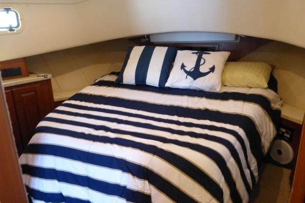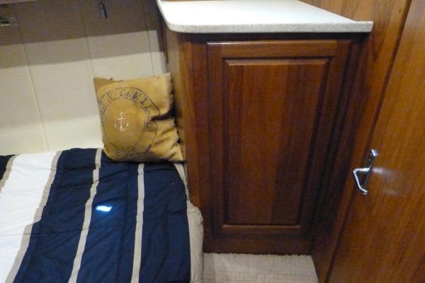 Master Stateroom: Centre island queen berth with storage under, cedar lined hanging lockers, overhead hatch with sunshade, opening portlight.