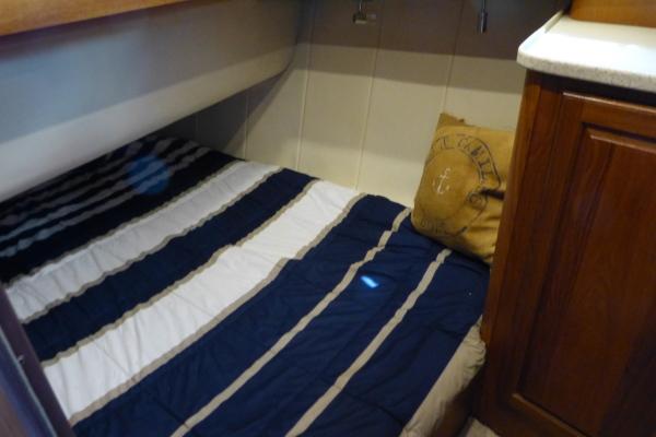 Guest Stateroom: Double berth, hanging locker, storage drawers, opening hatch with sunshade, portlight.