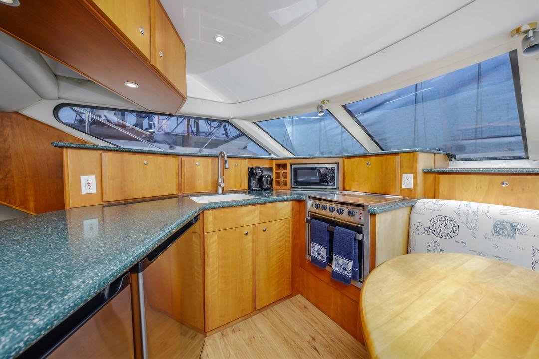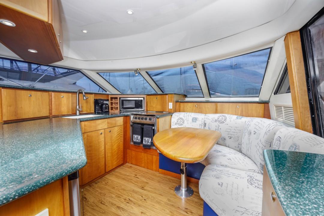 Galley is equipped with Corian countertops, and dinette seating