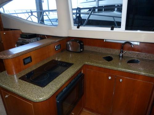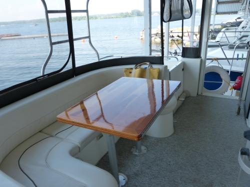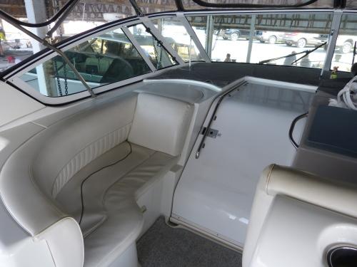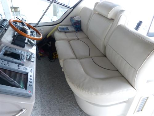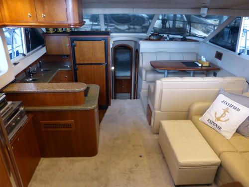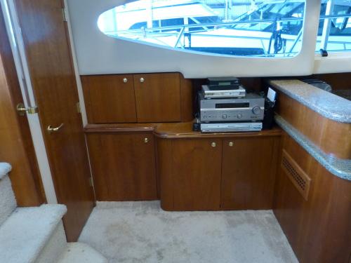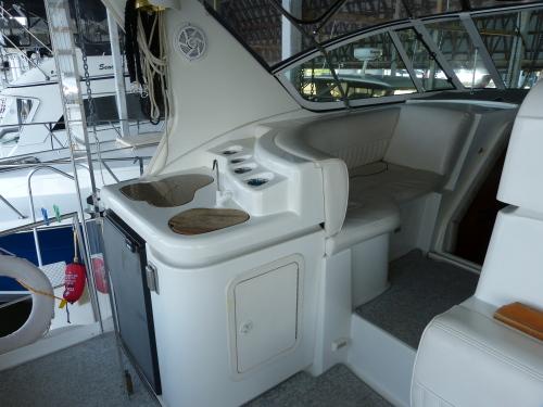 Cockpit/Helm: Hardtop with wing doors to side decks, full canvas enclosure, air and heat, fiberglass sliding cabin entry door with screen, triple-wide helm seating, passenger lounge, wet bar with refrigerator, aft cockpit area forward and aft-facing lounges, molded steps to swim platform, new OEM hydraulic swim platform (650 lbs capacity).