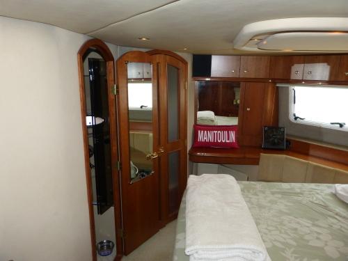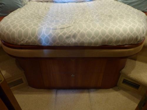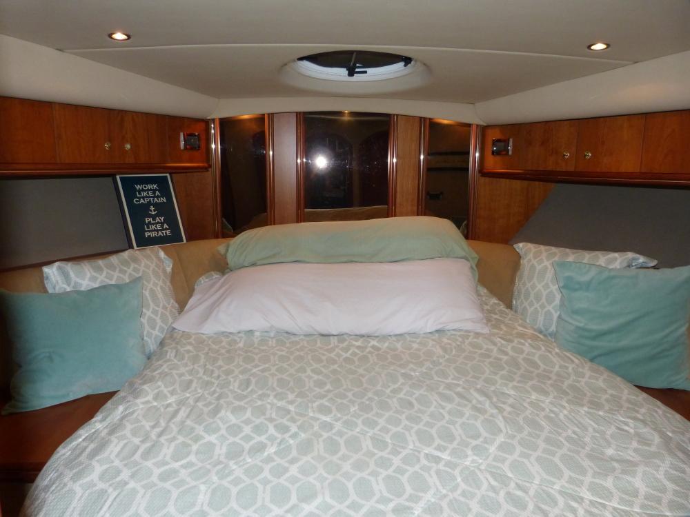 Forward Stateroom: Island berth with innerspring mattress and storage below, large walk-in closet, gunwale storage cabinets, TV, overhead hatch, portlights, privacy door.