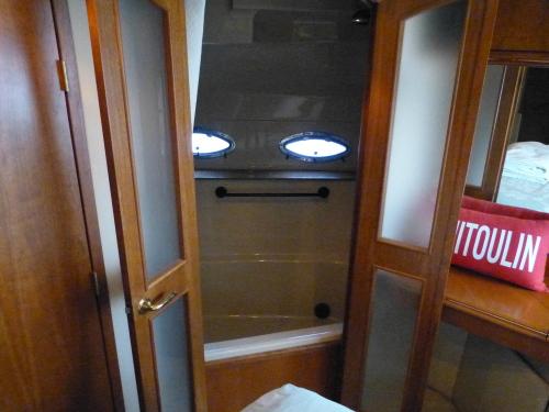 Guest Head:, Mirrored medicine cabinet, vanity with sink and storage below, Vacu-Flush, separate shower, privacy door access from hallway.