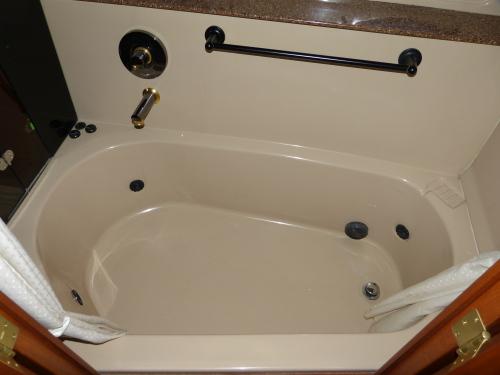 Master Stateroom: Island berth with innerspring mattress and ample space on either side for ease of movement, private head with Vacu-Flush, mirrored vanity with sink, whirlpool tub with hand shower accessed from head or directly from the aft cabin via French doors, upper and lower drawer storage, large hanging locker, direct and indirect lighting, privacy door.