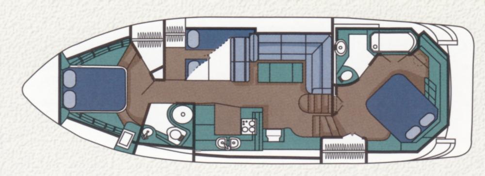 Produced from 2000 through 2003, the Cruisers 4450 combines the sleek styling of an express cruiser with the comforts of an aft-cabin motor yacht. Built on a beamy modified deep-V hull (18 deg. deadrise aft) , the three-stateroom layout puts salon, galley and dinette all on the same level. The forward cabin with walk-in closet is nearly as large as the aft stateroom and all interior spaces are finished in rich cherry wood veneers. A unique whirpool tub sits behind French doors that open to the aft stateroom. Above decks, a tiered helm and cockpit allow captain and passengers to remain in close proximity and enjoy the ride and surroundings in superb comfort.