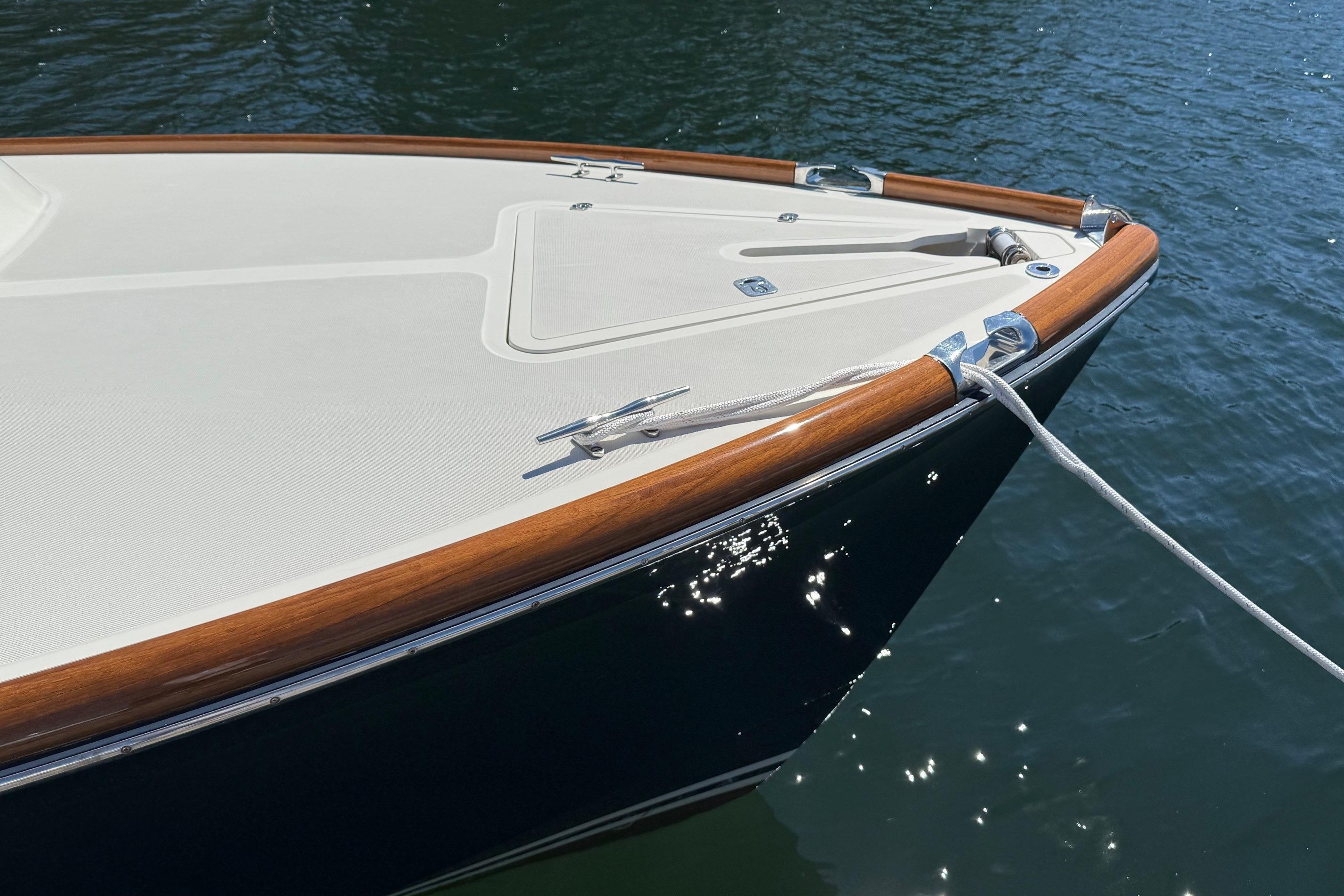 - Bull-nosed varnished teak toe rail with stainless chocks