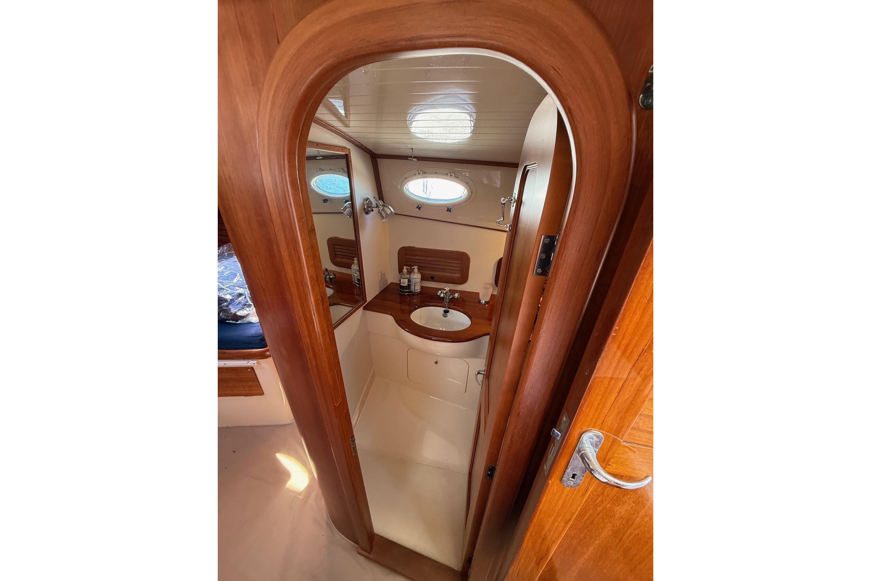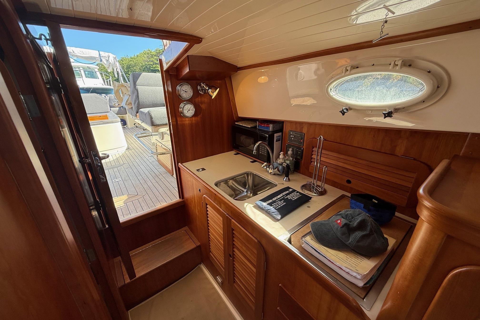 - Cockpit storage on port and stbd sides behind varnished teak louvered doors