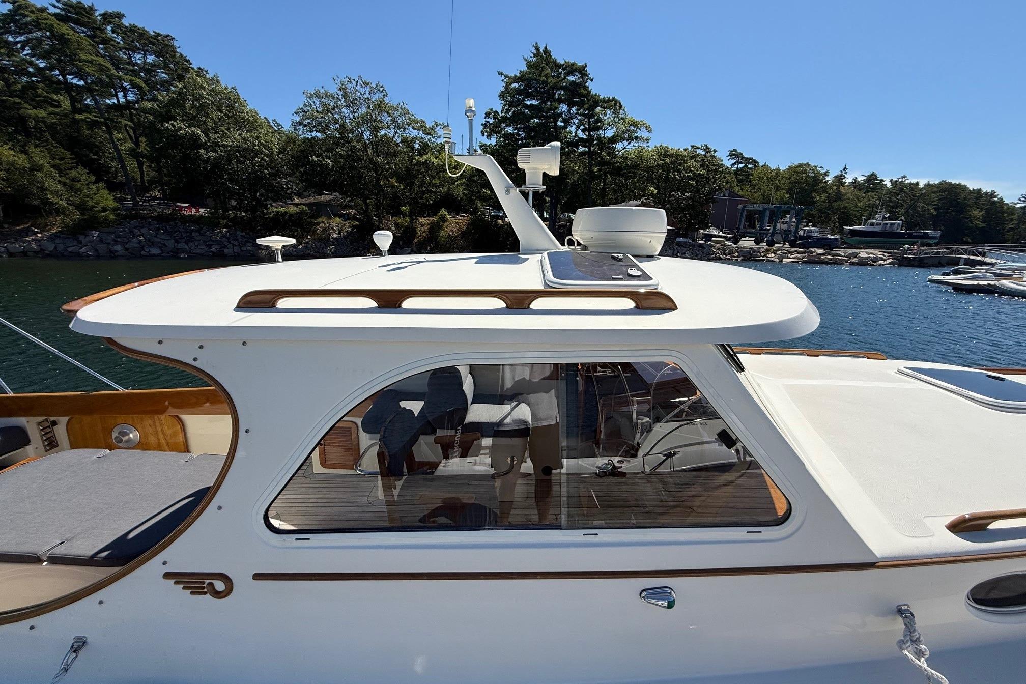 - Varnished teak handrails on cabin top and aft edge of pilothouse