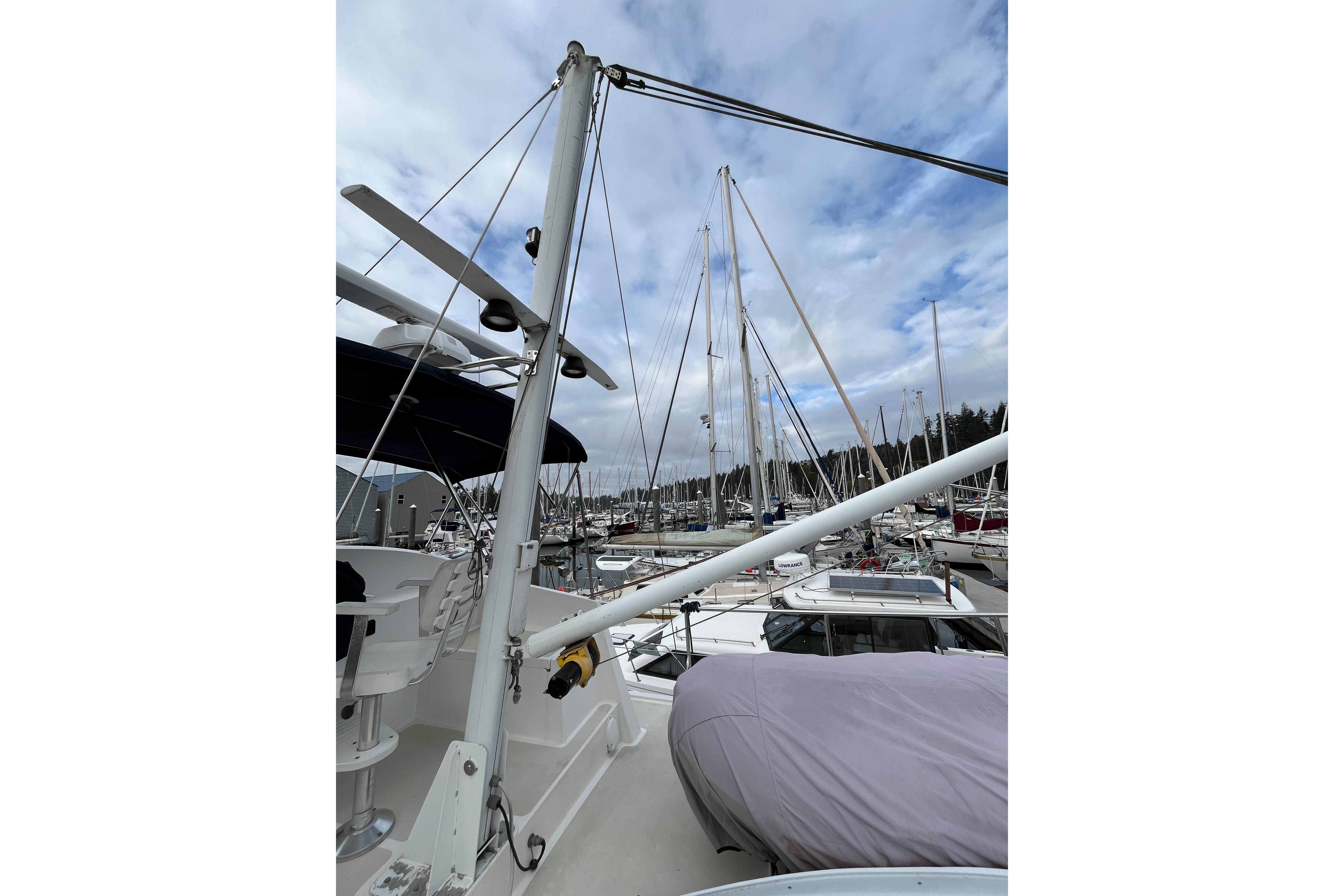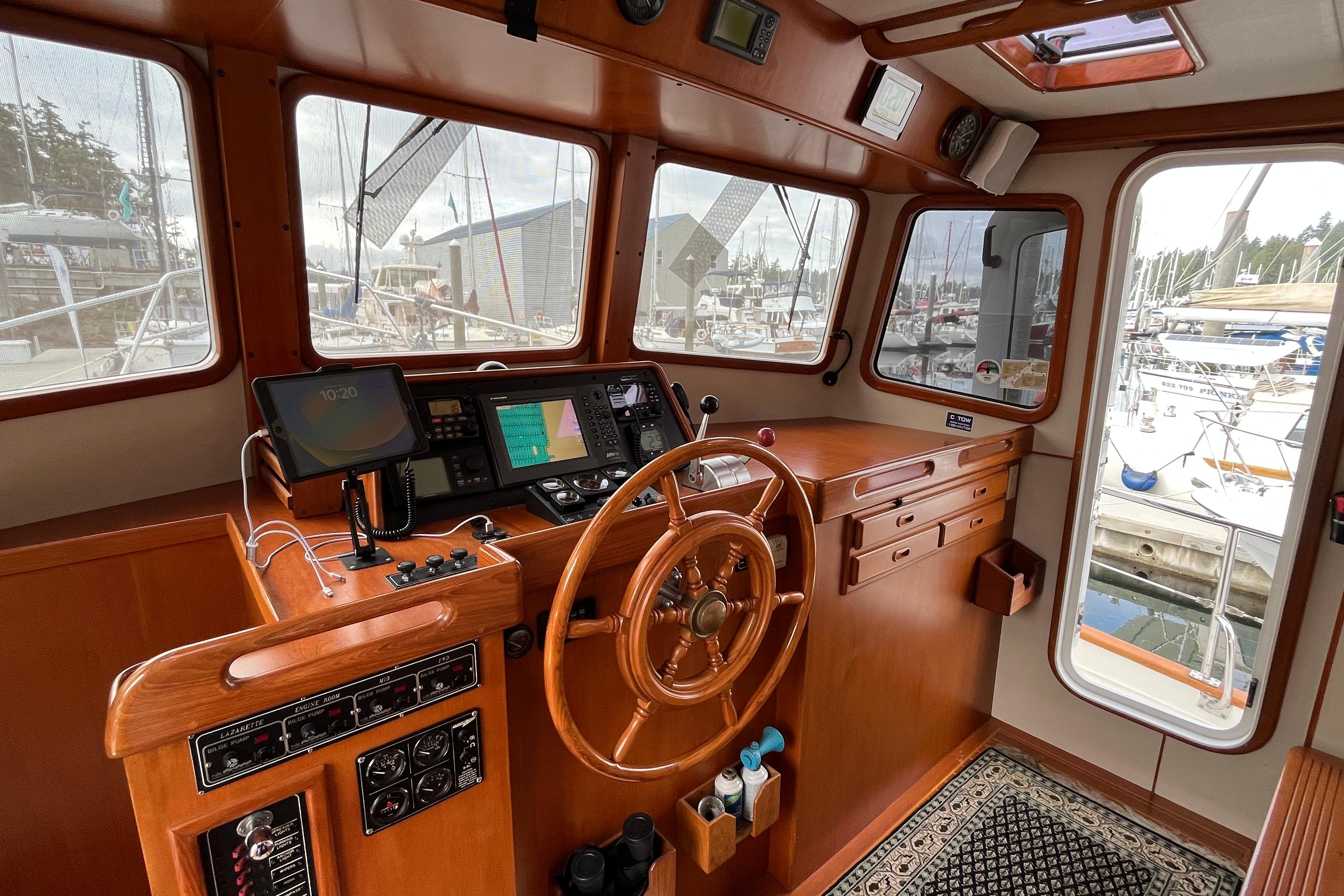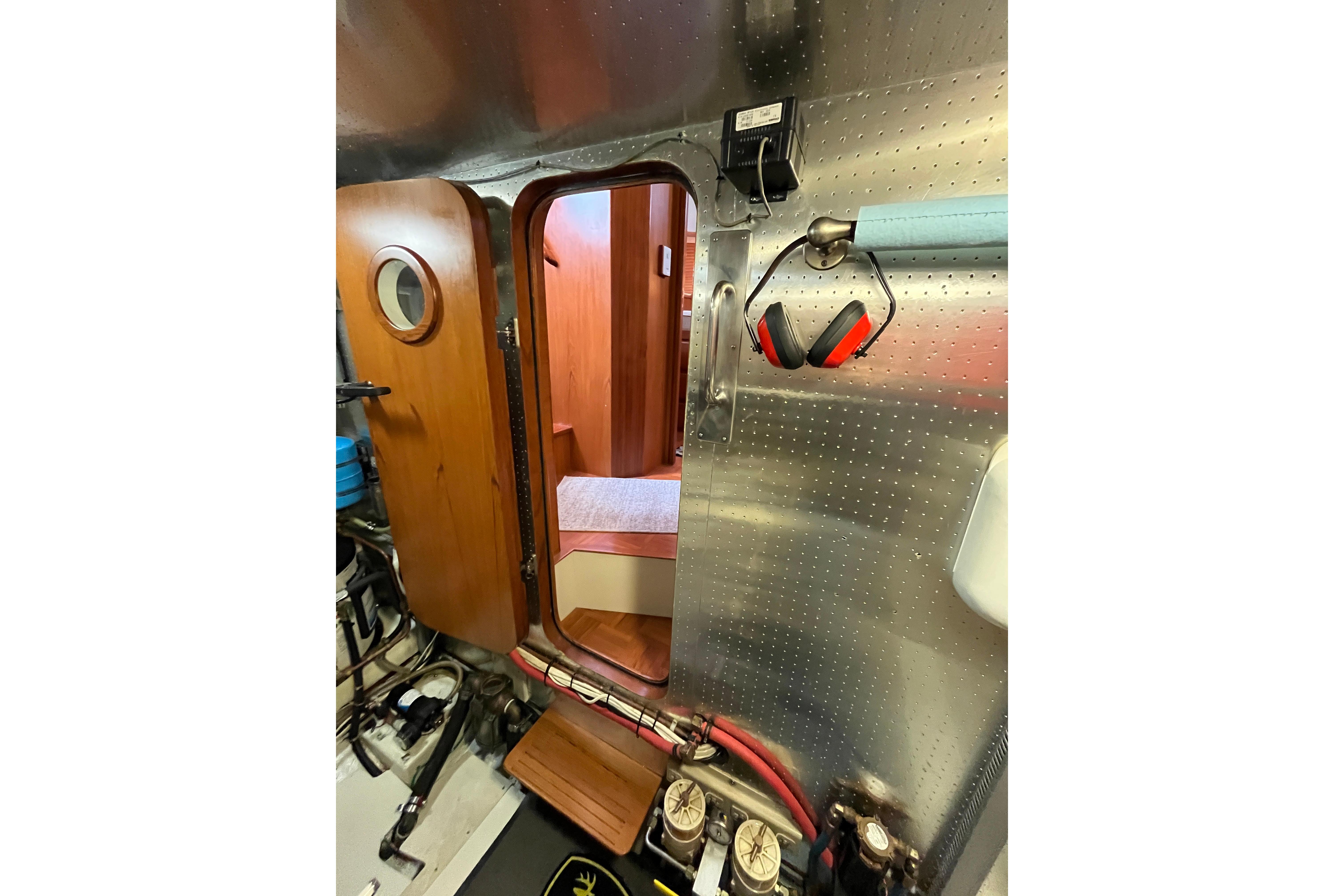 Stepping up into the pilothouse, the interior helm station is well appointed with easily visual gauges and electronics monitoring ship performance. Access to both the port and starboard decks is provided by Freeman aluminum dutch doors and an additional pilot berth is easily converted if needed.