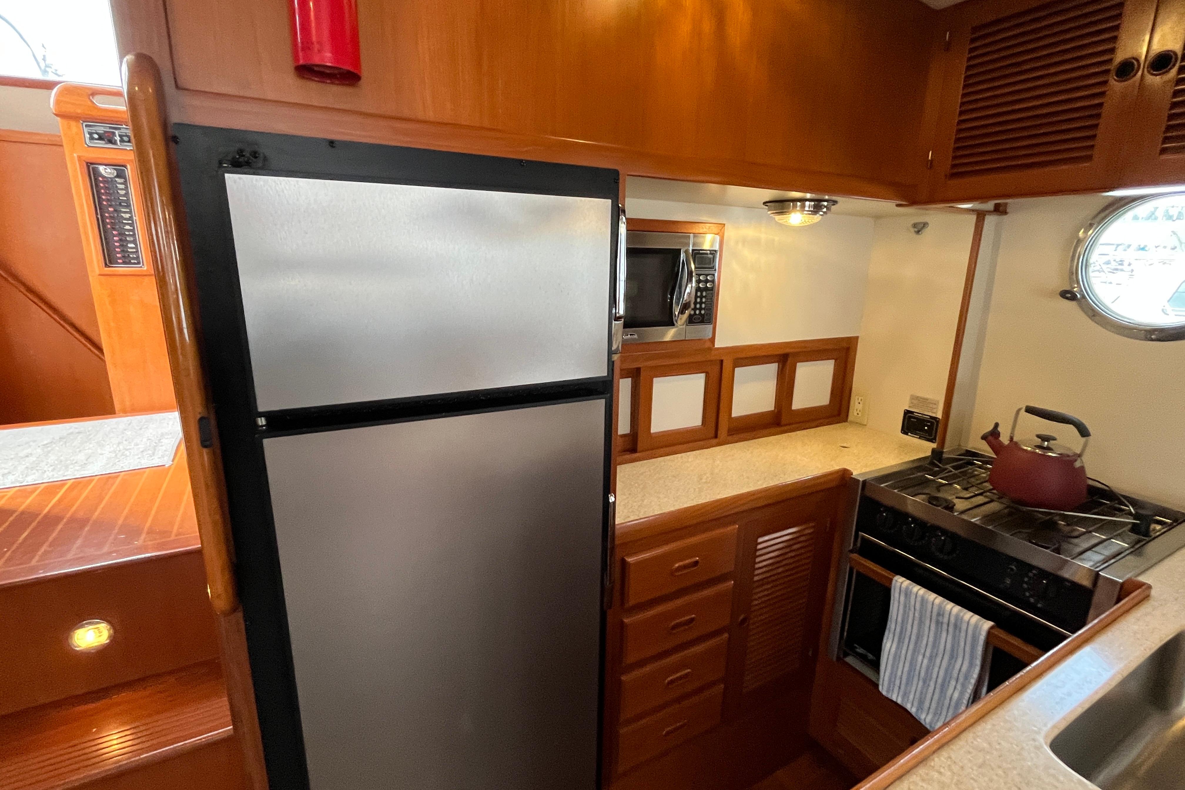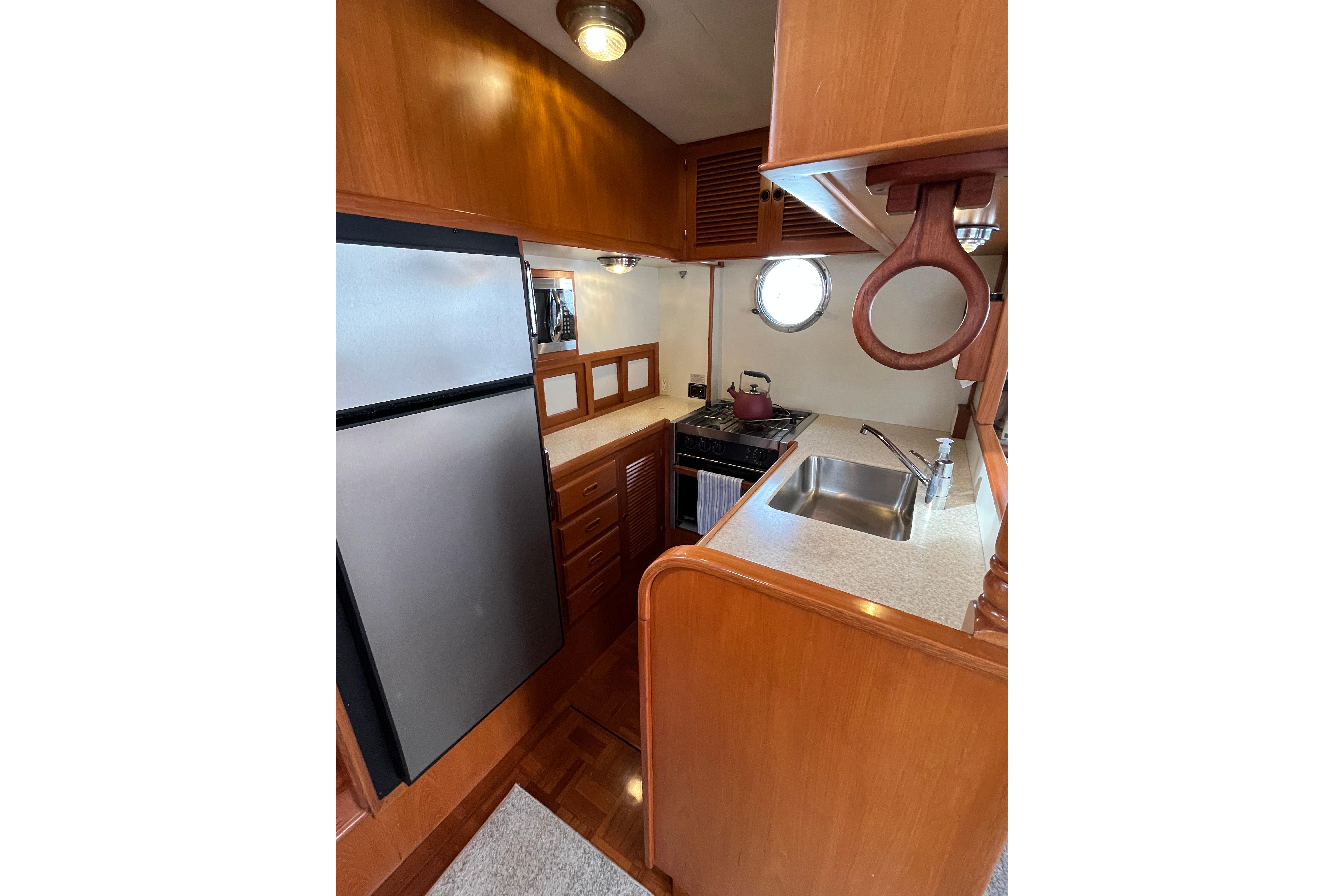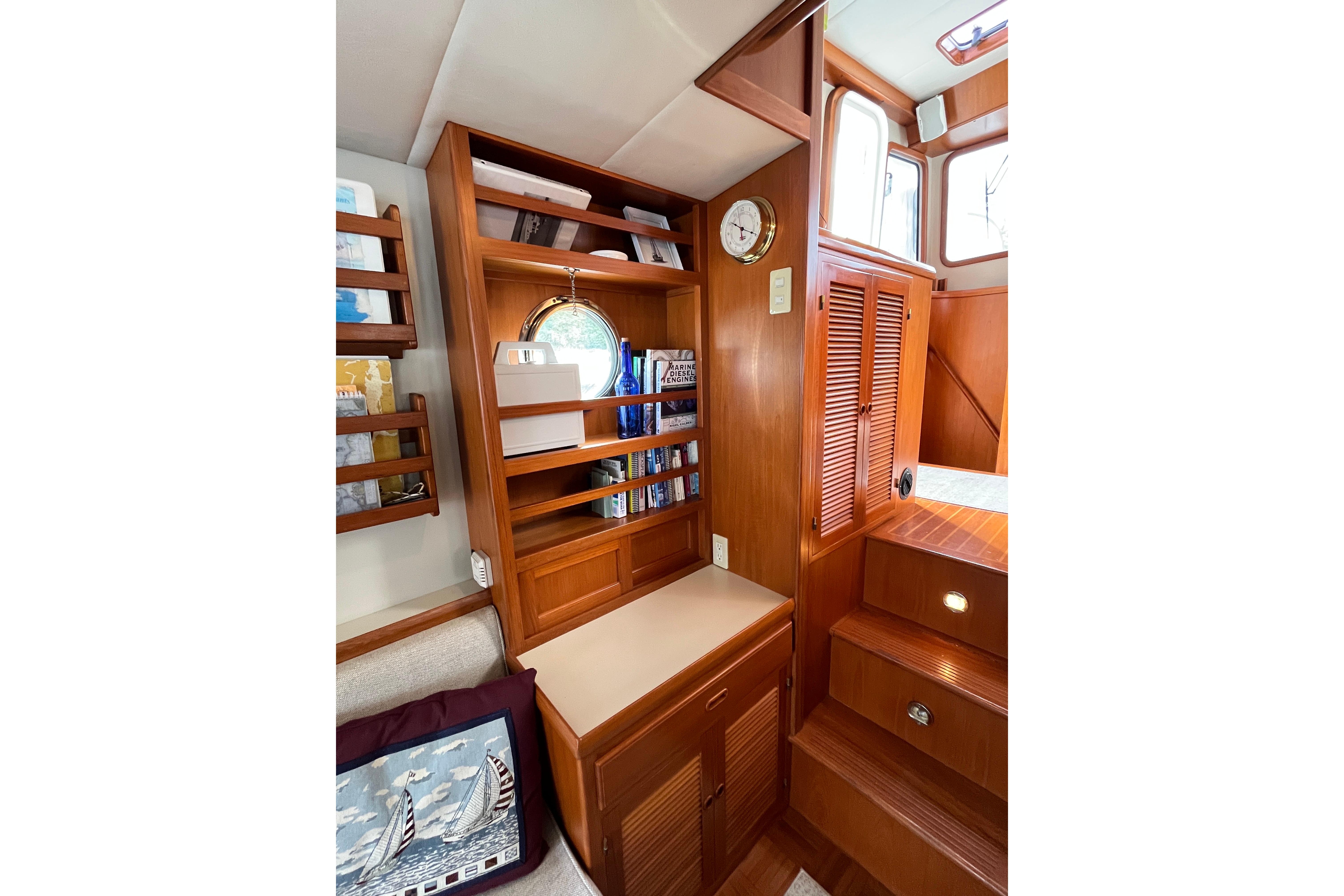 Stepping up into the pilothouse, the interior helm station is well appointed with easily visual gauges and electronics monitoring ship performance. Access to both the port and starboard decks is provided by Freeman aluminum dutch doors and an additional pilot berth is easily converted if needed.