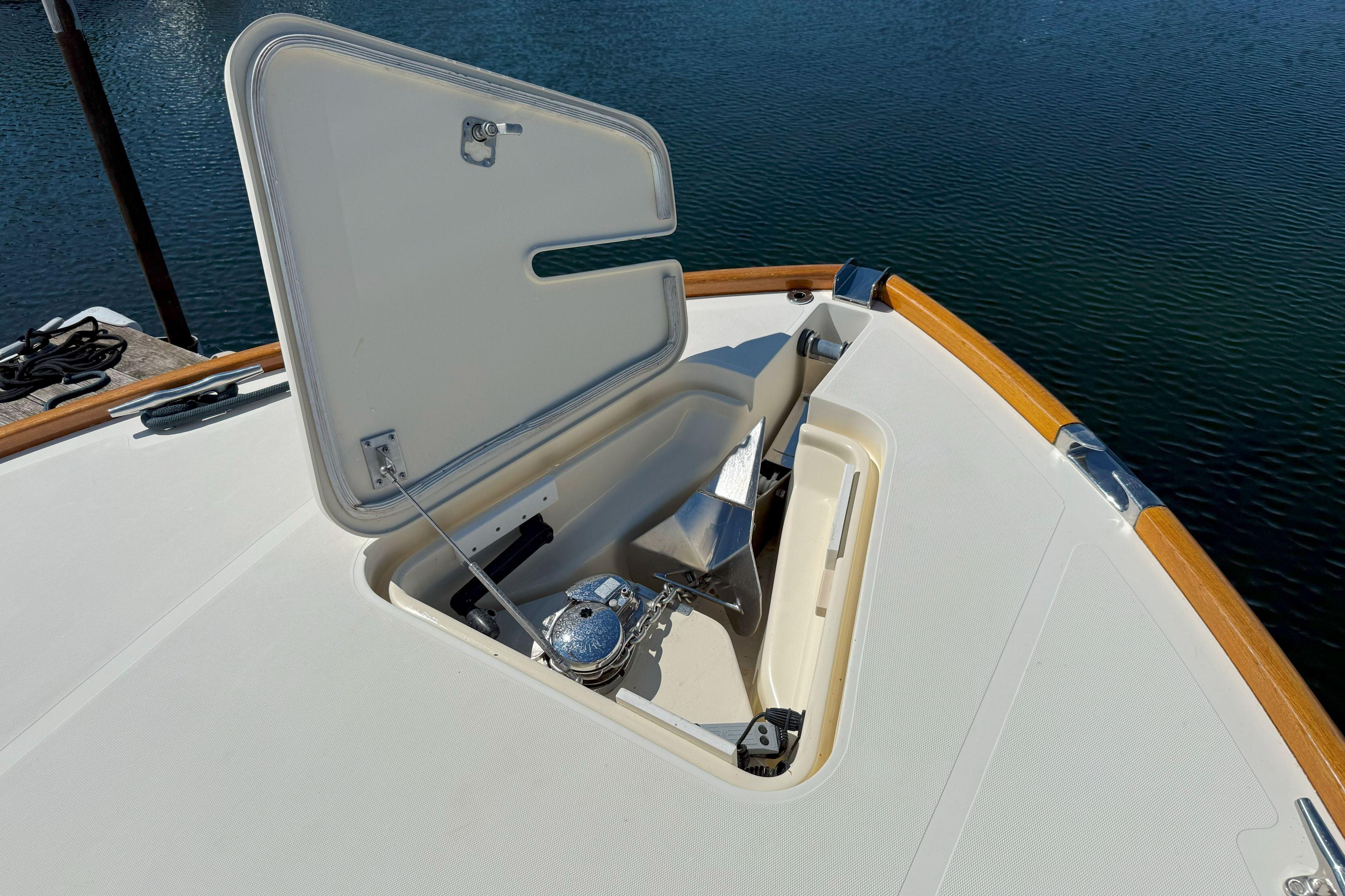 - Foredeck Anchor Locker - flush anchor locker has a pneumatic strut that holds open the anchor locker and a Hinckley-designed stowaway stainless steel anchor roller