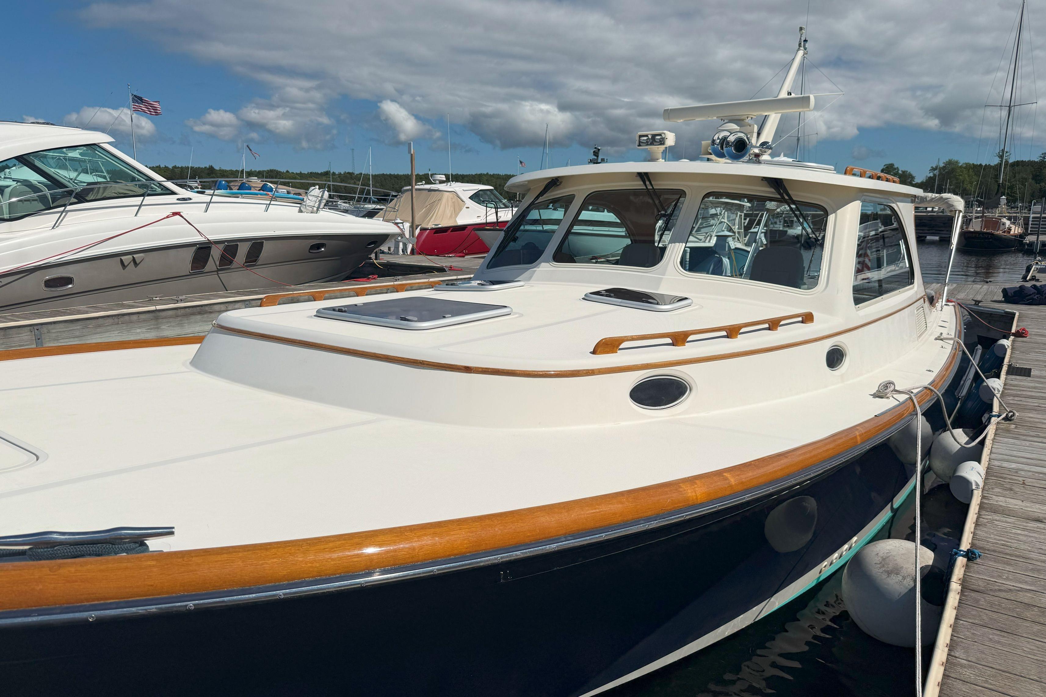 - Rounded, tapered, varnished teak toe rail with Hinckley profile.