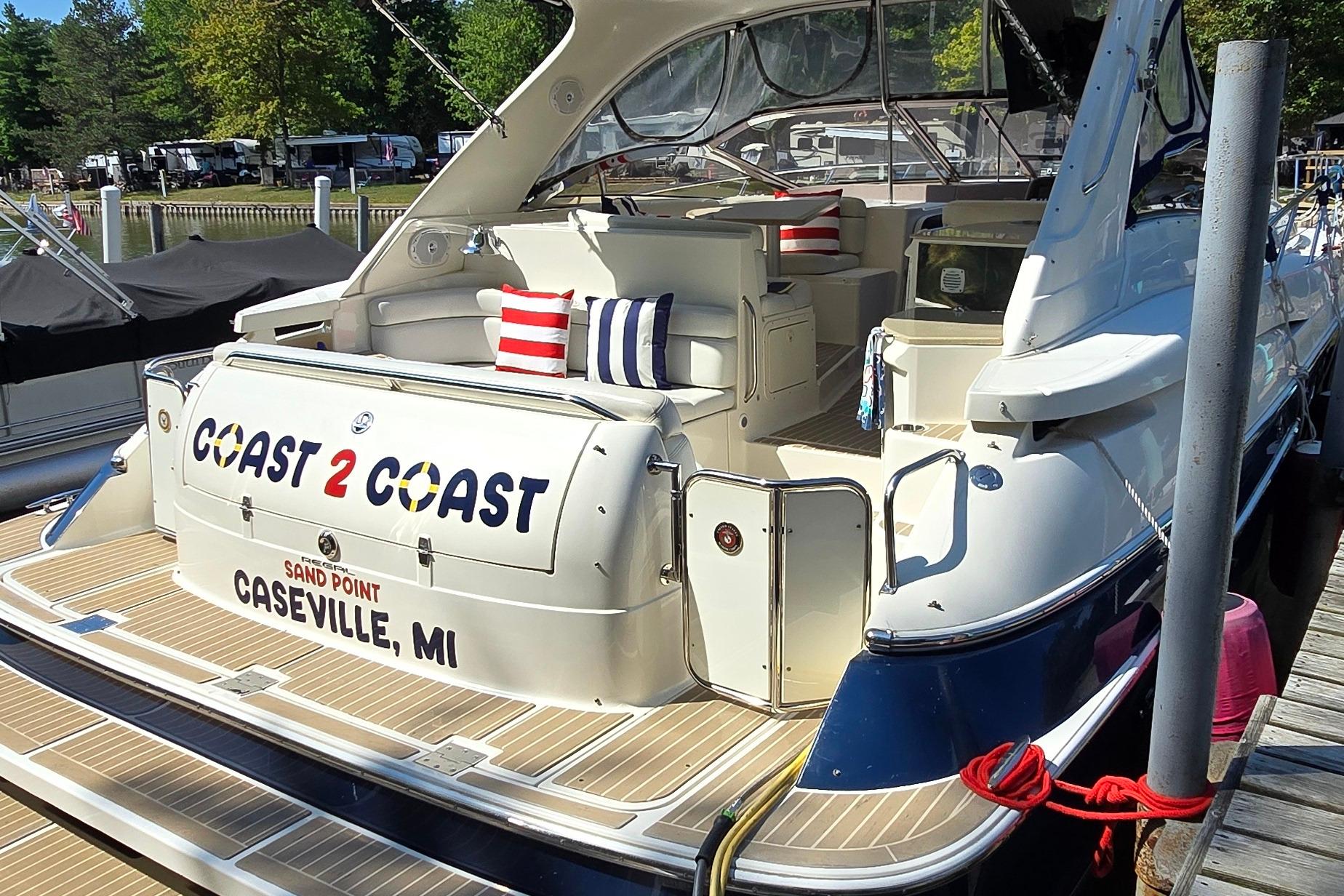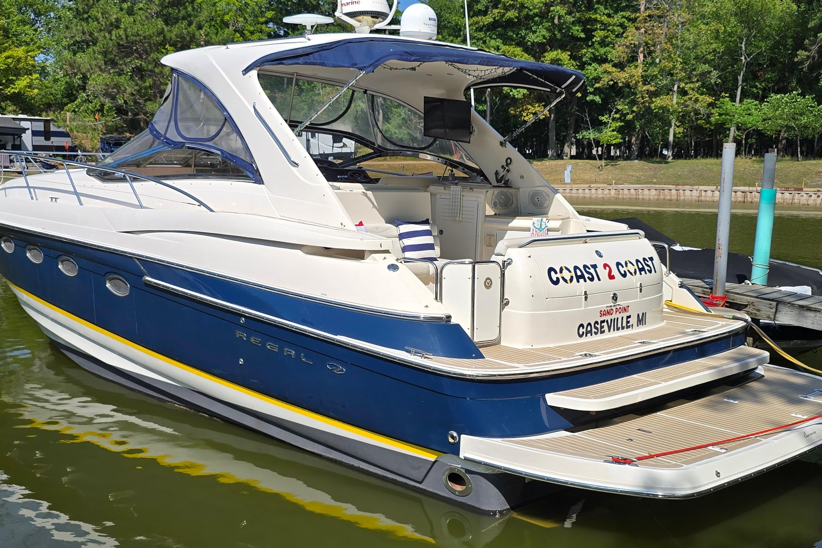 Flagship of the Regal fleet for several years, the 4160 Commodore (called 4260 Commodore in 2002–05; 4460 Commodore in 2006–09) is a high-style luxury sport yacht with a spacious, well-arranged interior and a particularly innovative cockpit layout. She rides on a beamy deep-V hull with propeller pockets, and her aggressive profile owes much to a gracefully integrated bow pulpit and a unique fore-and-aft arch design. Boarding from one of two transom gates, one is struck by the cockpit configuration—the aft section is small, but the elevated bridge deck is huge with a large U-shaped settee and table opposite the helm. This is a very social layout since most of the guest seating is centered near the doublewide helm rather than aft as it is on most express cruisers. The Regal’s plush two-stateroom interior is notable in that both cabins have pocket doors for privacy (rather than curtains) and each has its own head. Additional features include a walk-through windshield, cockpit wet bar, a power-assist windshield vent, foredeck sun pad, and a large transom storage locker. A good performer with optional 450hp Cummins (or 480hp Volvo) diesels, the Commodore will cruise at 28 knots (30+ top).