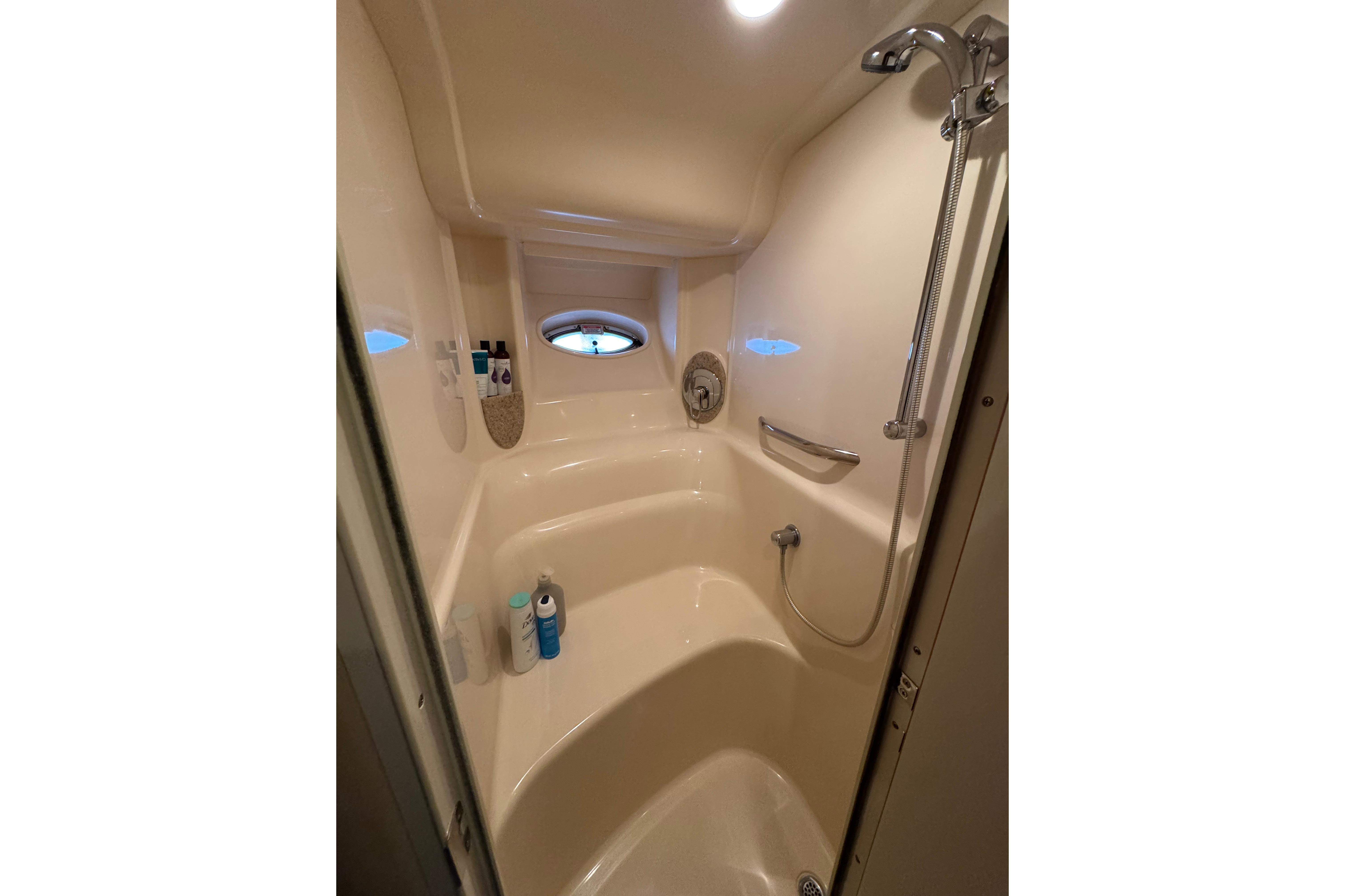 Accommodations include two private staterooms and two full heads, making this yacht exceptionally comfortable for family and guests. The forward master stateroom features a centerline berth, excellent headroom, and private head access, while the aft guest stateroom offers a roomy layout with its own head and seating area. Climate control throughout ensures comfort in all seasons.