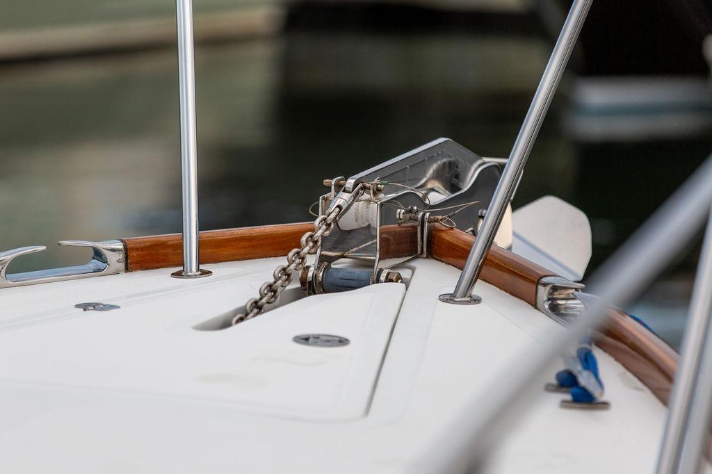 • Muir electric windlass pkg: Flush foredeck anchor locker houses a Muir electric windlass with Delta 22# anchor + 15” SS chain & 150’ anchor rode and stainless-steel bow roller. The windlass can be operated from the helm station or a handheld remote at anchor locker.