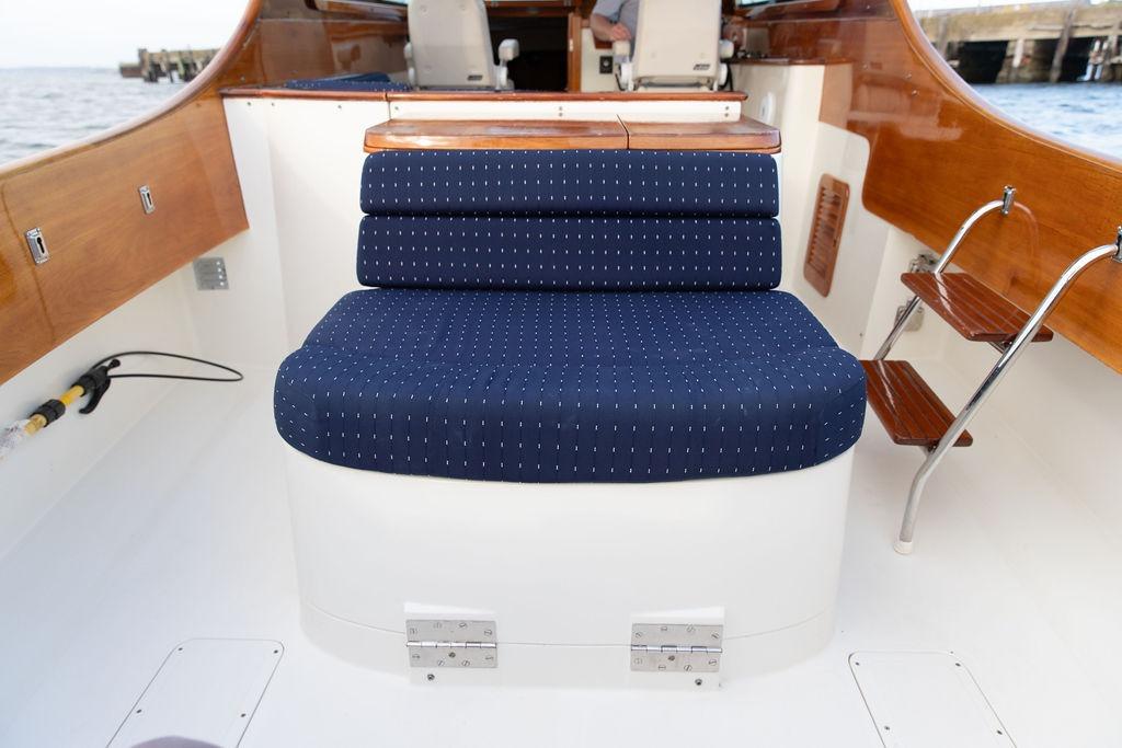Aft is a full-width settee with back and seat cushions finished in fabric that matches the pilothouse and cushions. Aft settee includes a hinged lid under the cushion to allow access to removable storage tub and to access bilge areas. There are port and starboard cup holders just forward of cushions.
