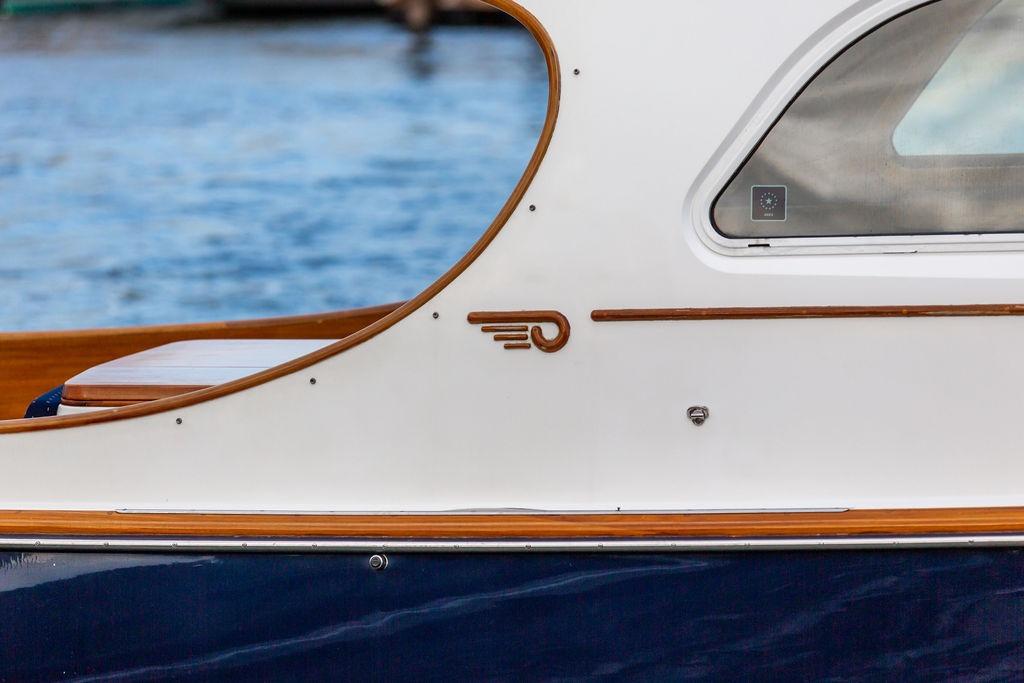 • Rounded, tapered, varnished teak toe rail with Hinckley profile
