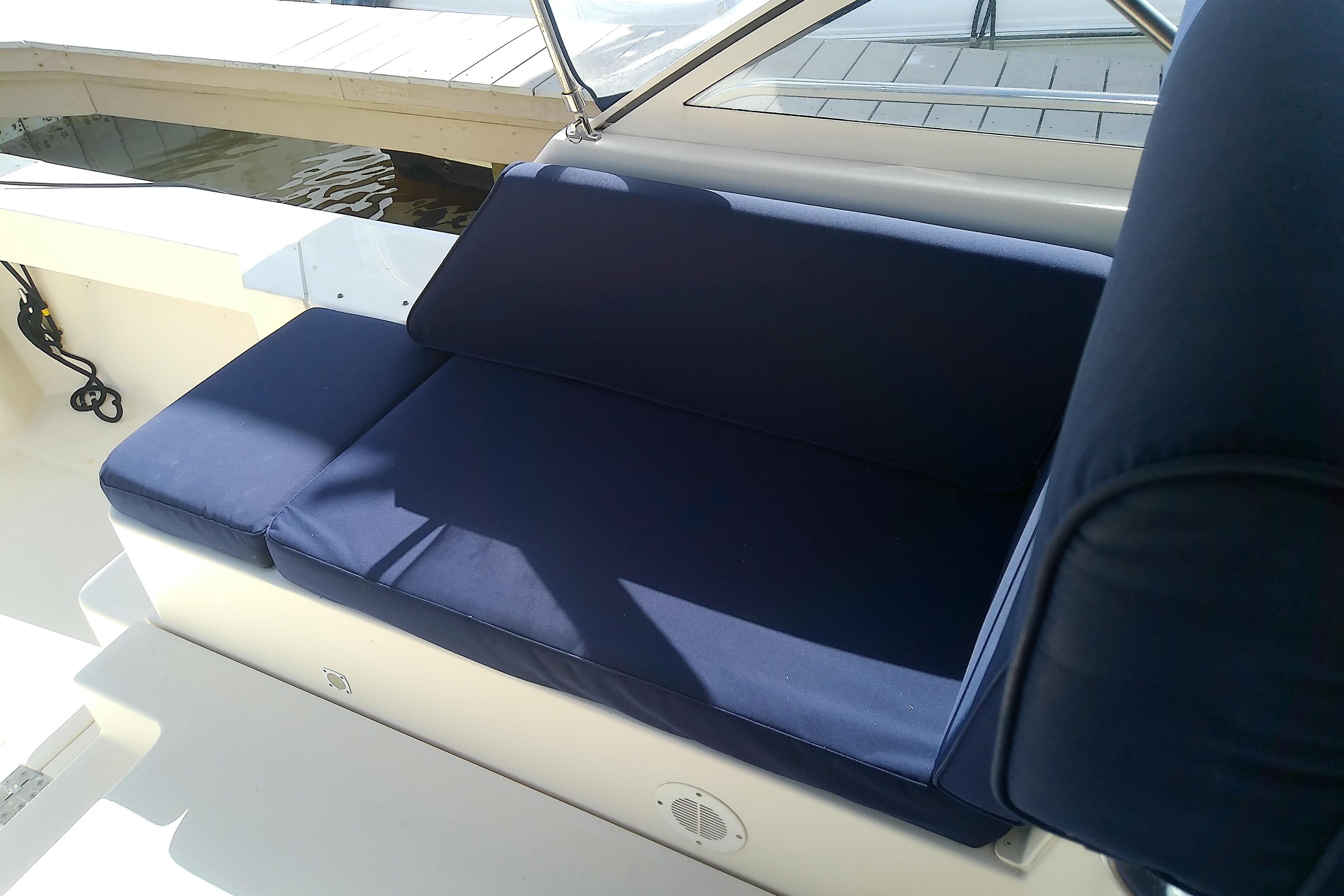 In the cockpit, facing bench seats behind the helm and companion seats can double as extra berths. A centerline hatch in the cockpit sole provides access to the engine. Additional features include a tilt-away helm, transom door, and wide side decks. The 34 rides on a semi-displacement hull with moderate beam. A single 350hp Yanmar diesel will cruise at 14 knots (16–18 top). Twin 240hp Yanmar diesels cruise at 18 knots.