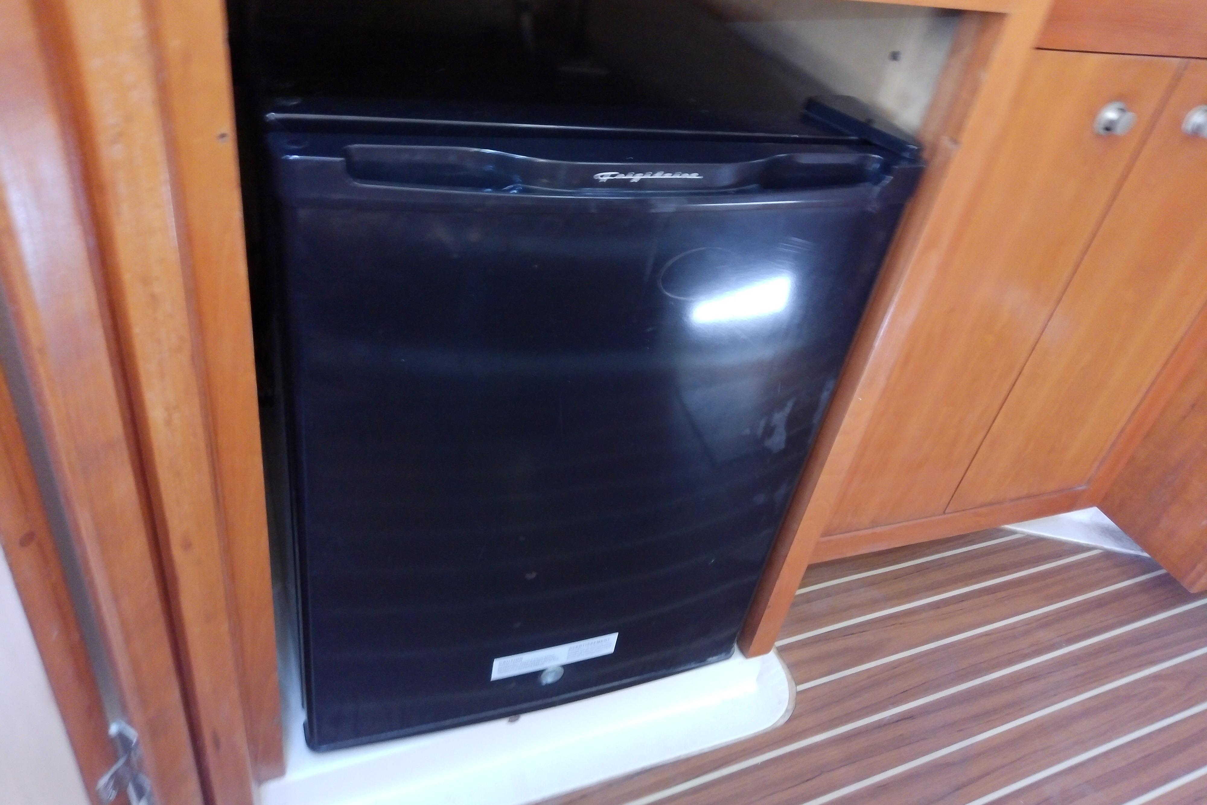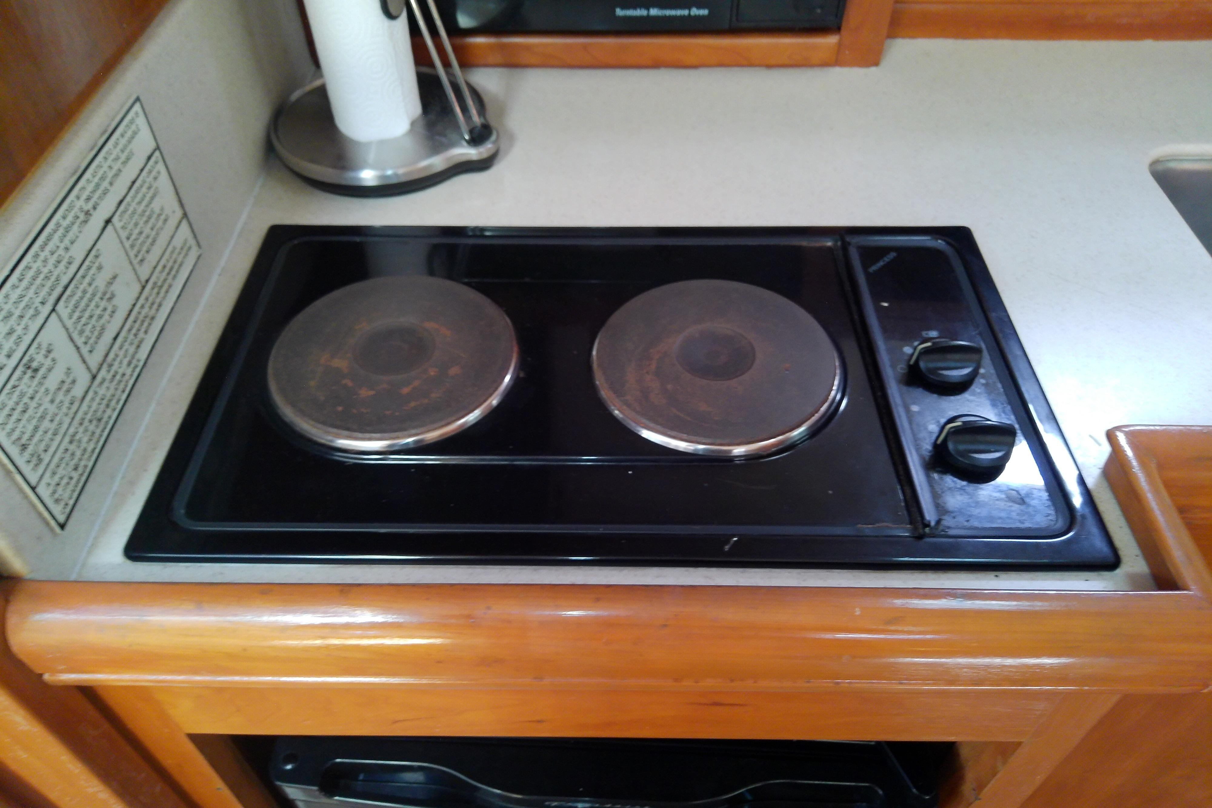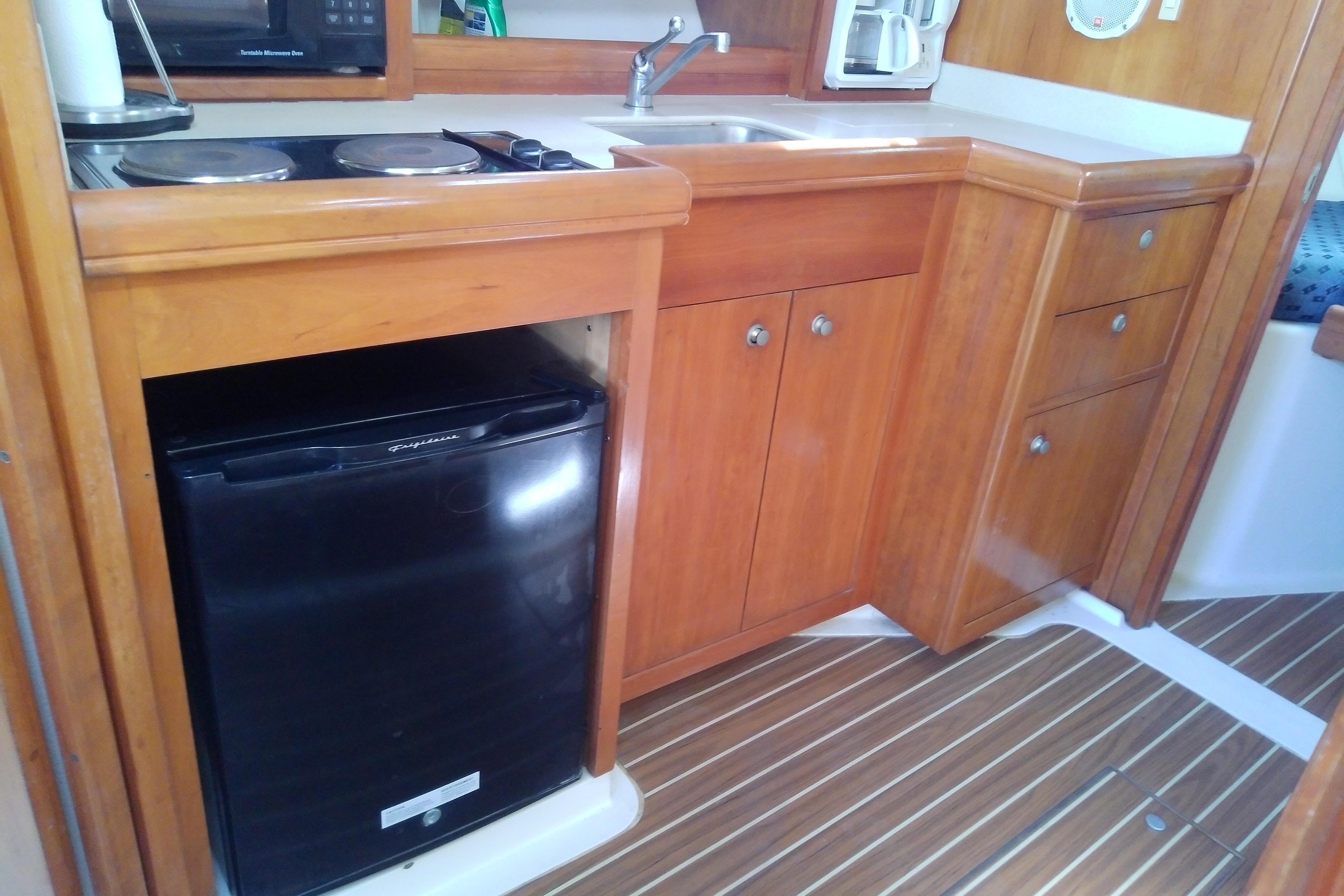 - Small Galley w/ Refrigerator/Freezer, Princess Two Burner Electric Stove, GE Microwave, Black and Decker Coffee Maker, Stainless Steel Freshwater Sink and Ample Storage