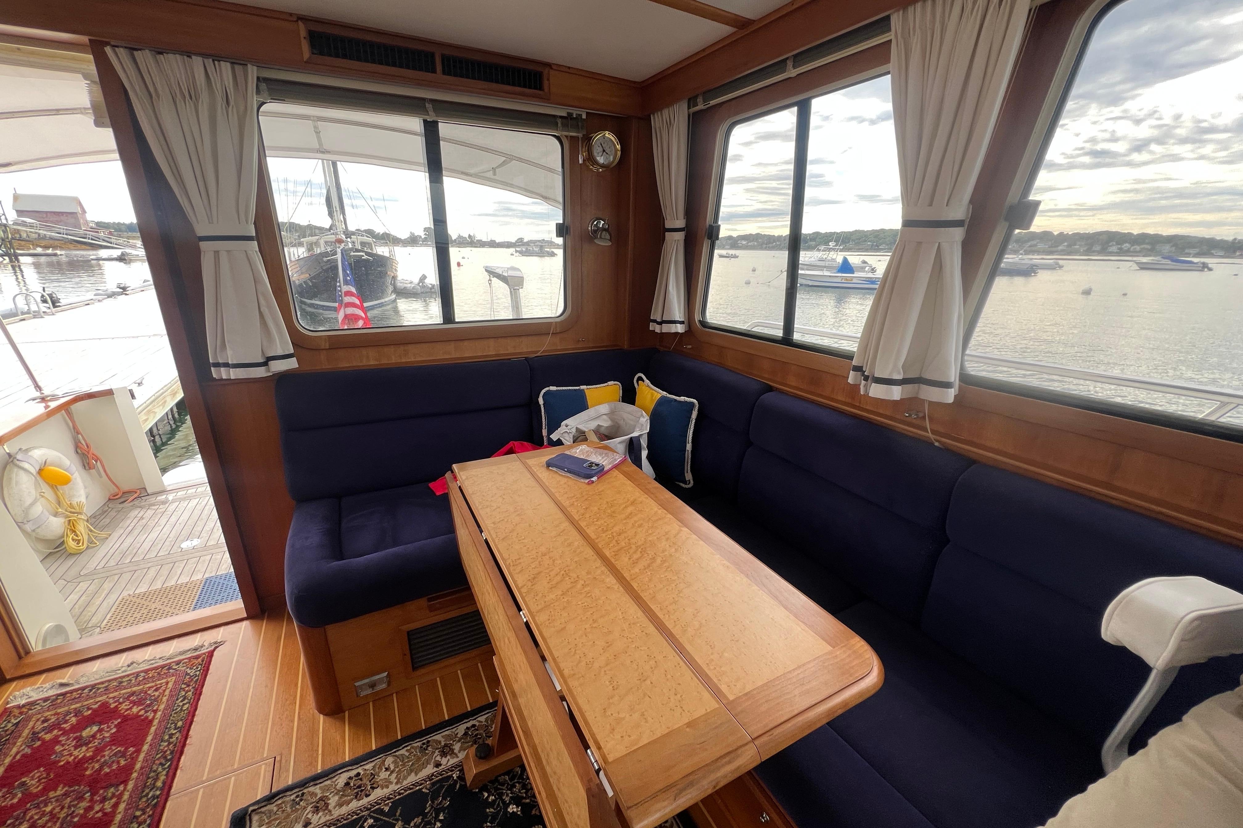- Aft and to port is a comfortable L-shaped settee with a drop leaf table.