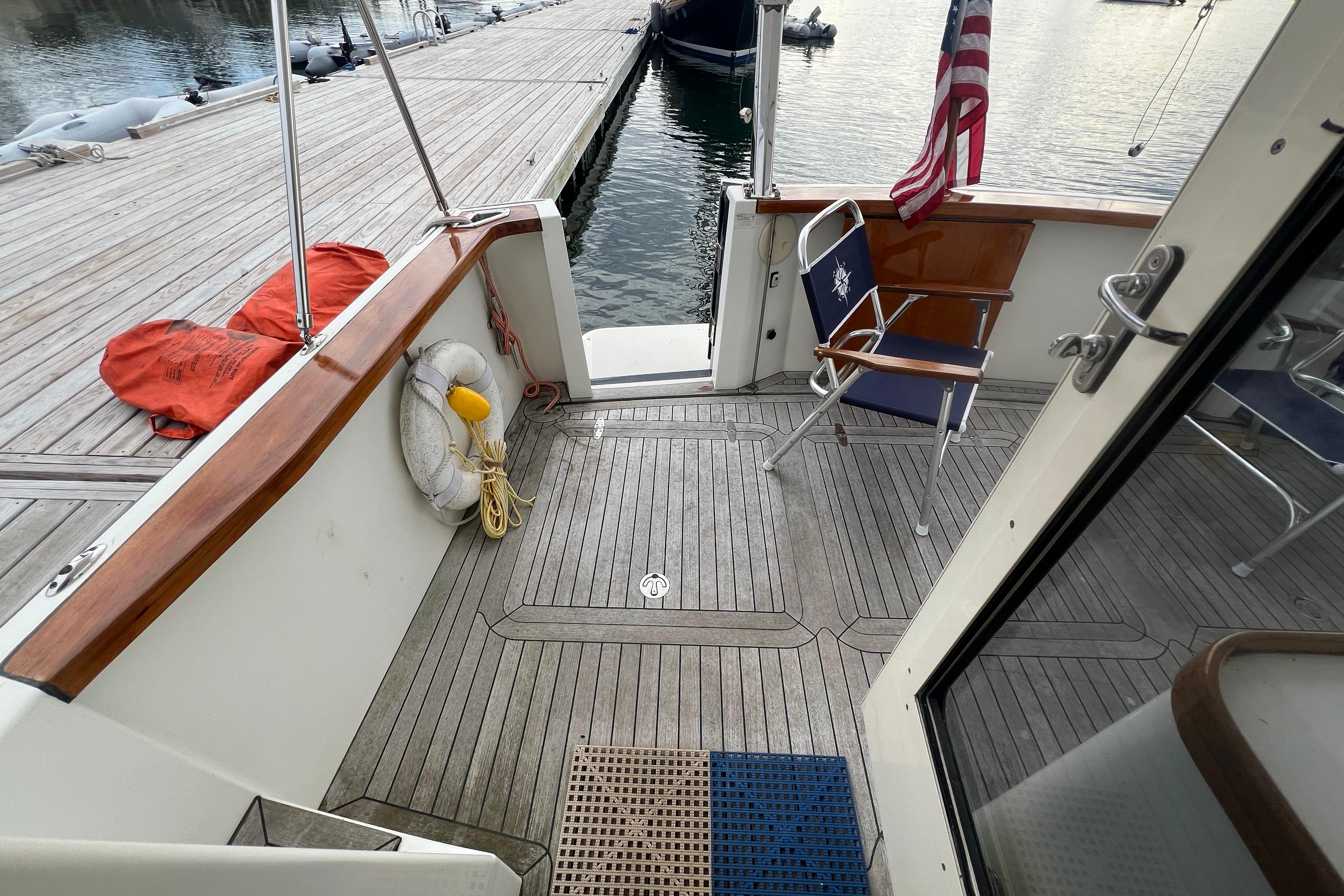 - Three steps up is the spacious main salon, with helm door to starboard.