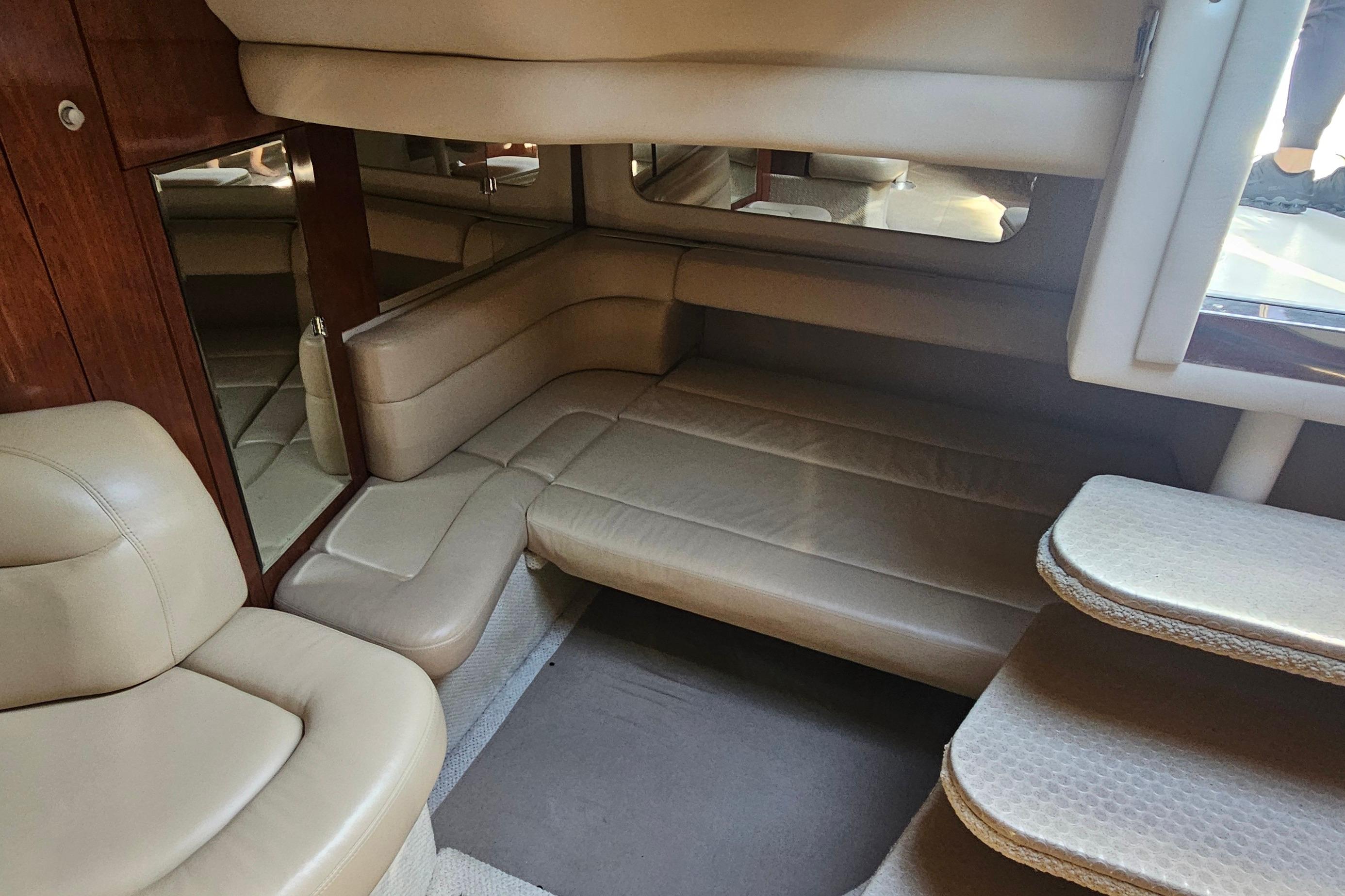 Step aboard and you’ll find a spacious cockpit designed for entertaining, complete with wraparound seating, a wet bar, and easy access to the swim platform. Below deck, the Sundancer offers a refined interior with rich wood cabinetry, a fully equipped galley, and comfortable accommodations for overnight stays.