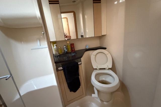 The mid berth to port sleeps two as does the master forward, and both the guest and master heads have vacu-flush toilets, vanity sinks and shower stalls