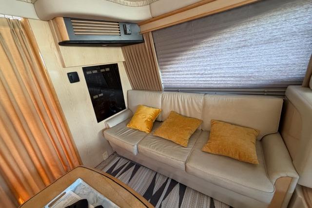 A big, solid and spacious express bridge cruising motor yacht in very good condition, which offers plenty of room up in the flybridge with co-captain chairs and a dinette/settee with wrap-around seating for at least a half dozen, enabling most or all of the guests to accompany the captain and enjoy the view.