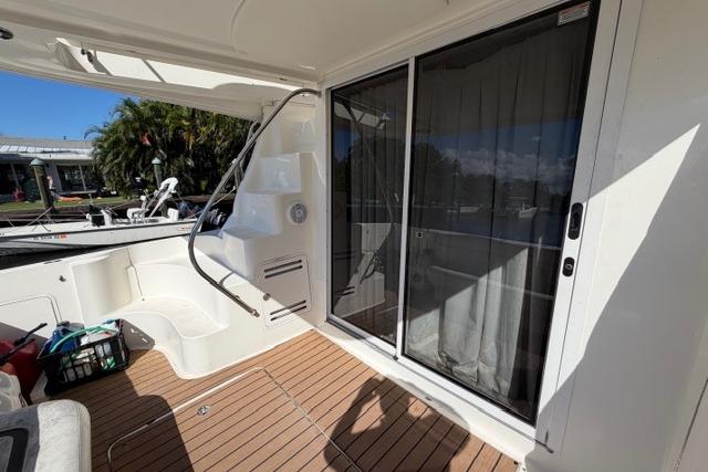 The cockpit has a walk-through transom door for boarding via the swim platform, molded staircases to the flybridge and the foredeck, room for several deck chairs, and a day-hatch for quick and easy access to the machinery space below.