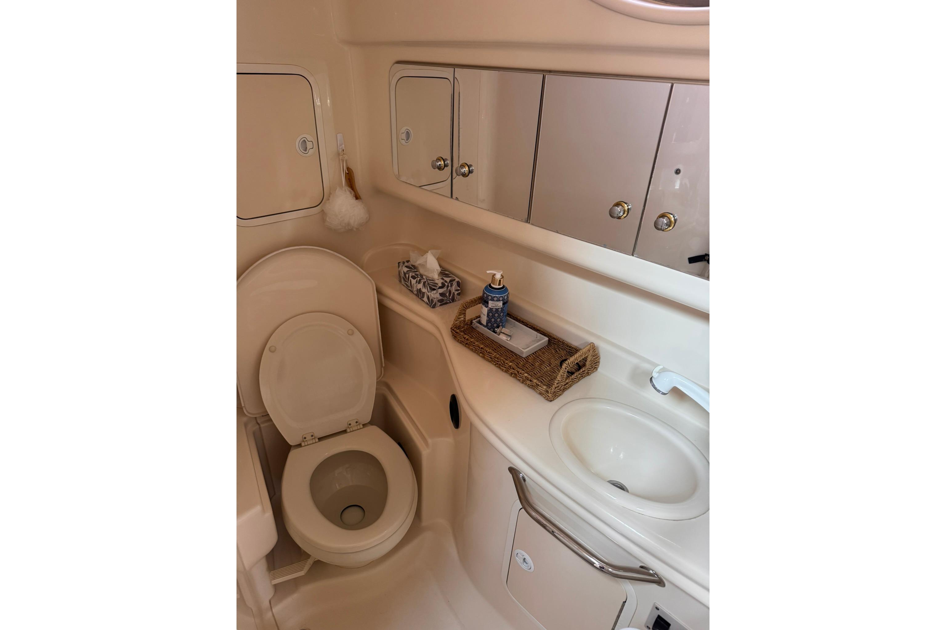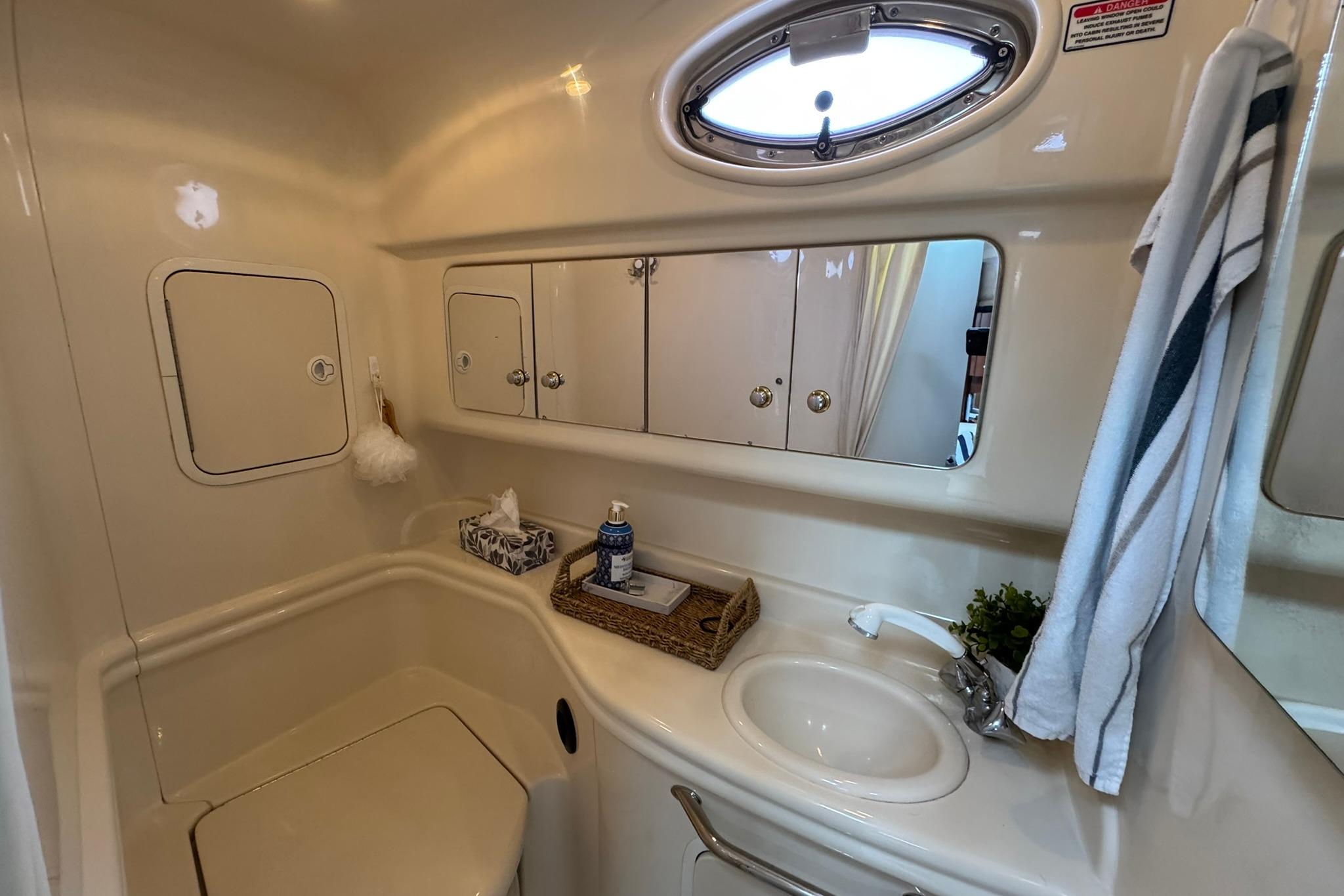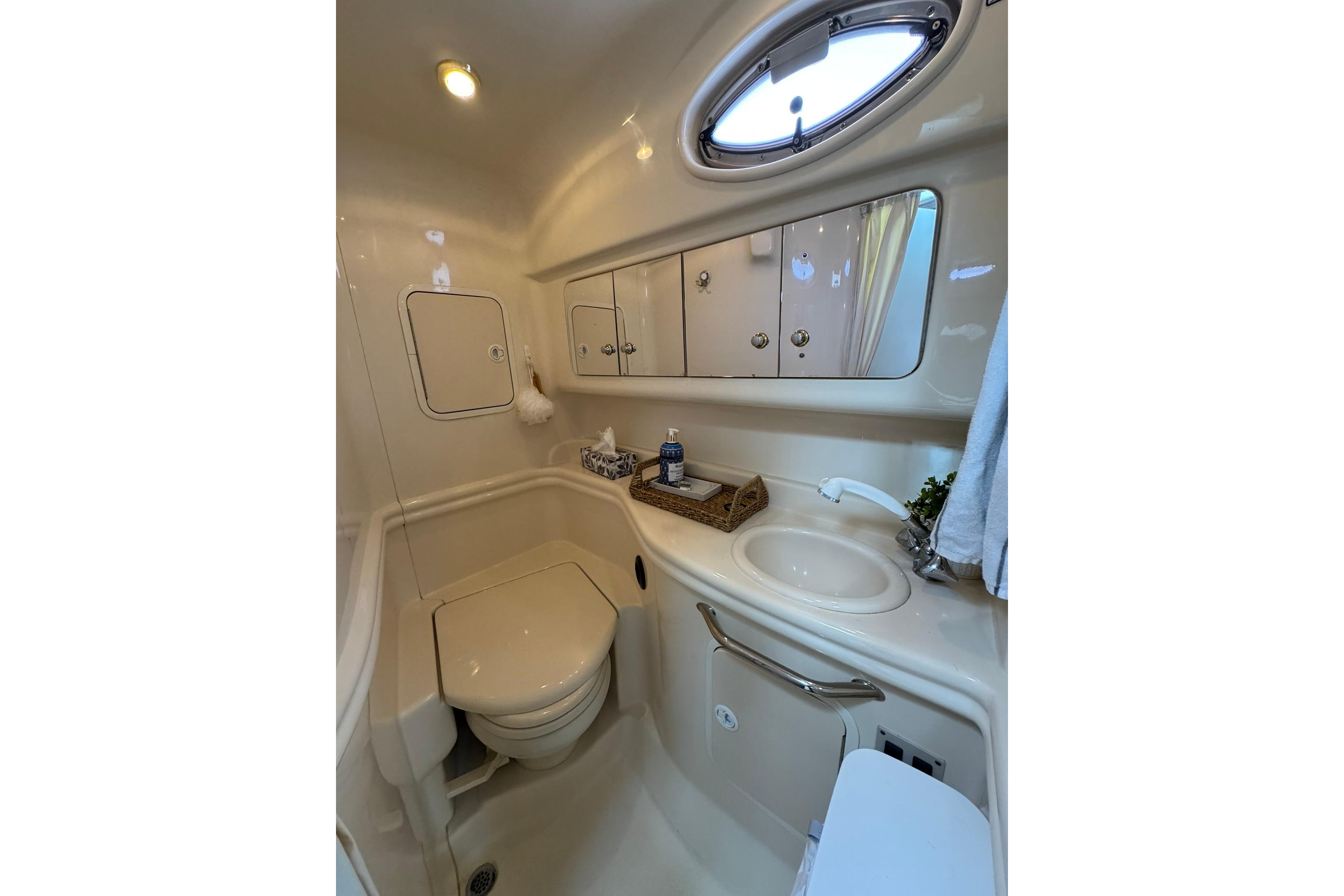 There is one head with macerator and overboard discharge. There is a sink, vanity and shower.