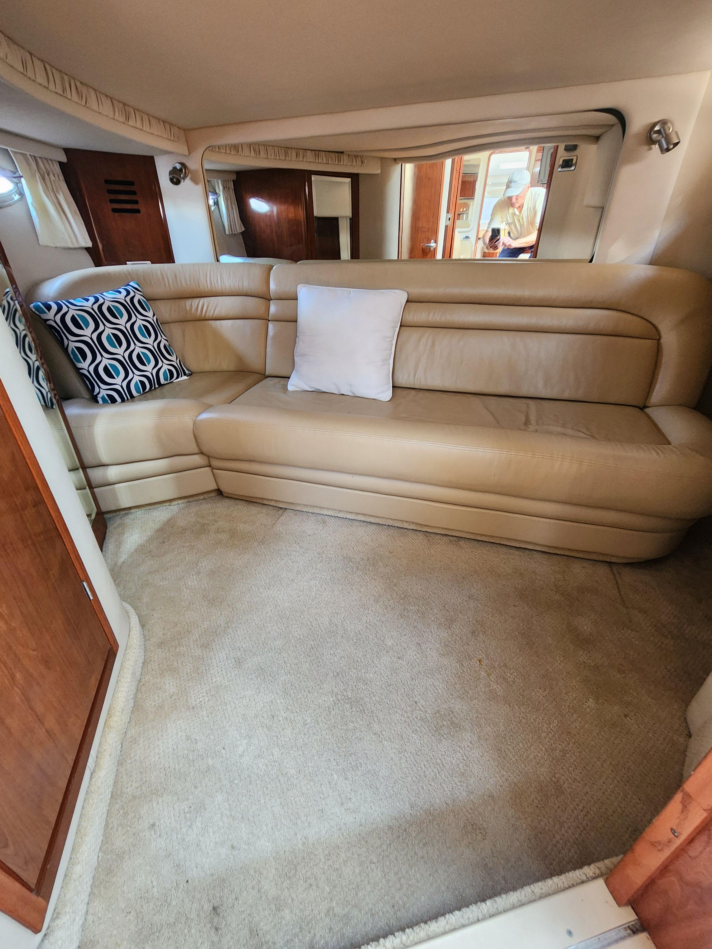 The interior is finished to a high standard with a cherry cabin sole; Ultra-Leather upholstery; marine coil mattress in the master stateroom; vinyl headliners; and high-gloss wood cabinetry.