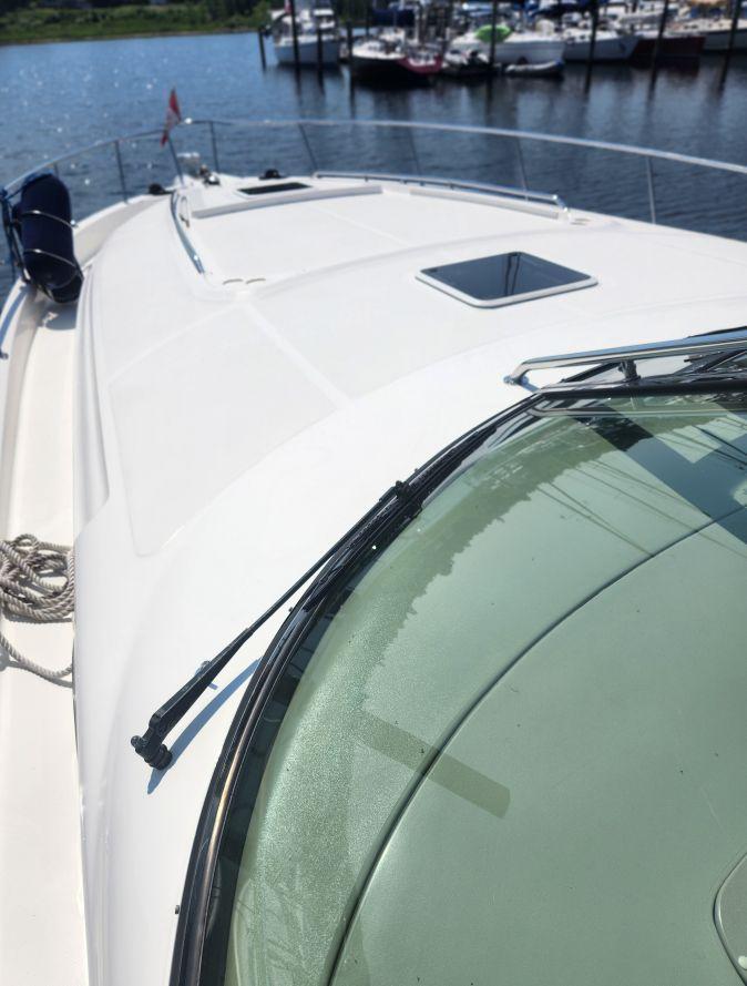 Flag blue fiberglass hull; White deck and deck-house with White boottop, Black bottom paint; Sea Dek non-skid (2023); electric/hydraulic dinghy Freedom Lift on the swim platform; Cockpit hard-Top; Full Cockpit Enclosure (2024); Vetus bow-thruster; stainless steel railing from the cockpit forward; 2 hatches; 10 opening ports w/ screens.