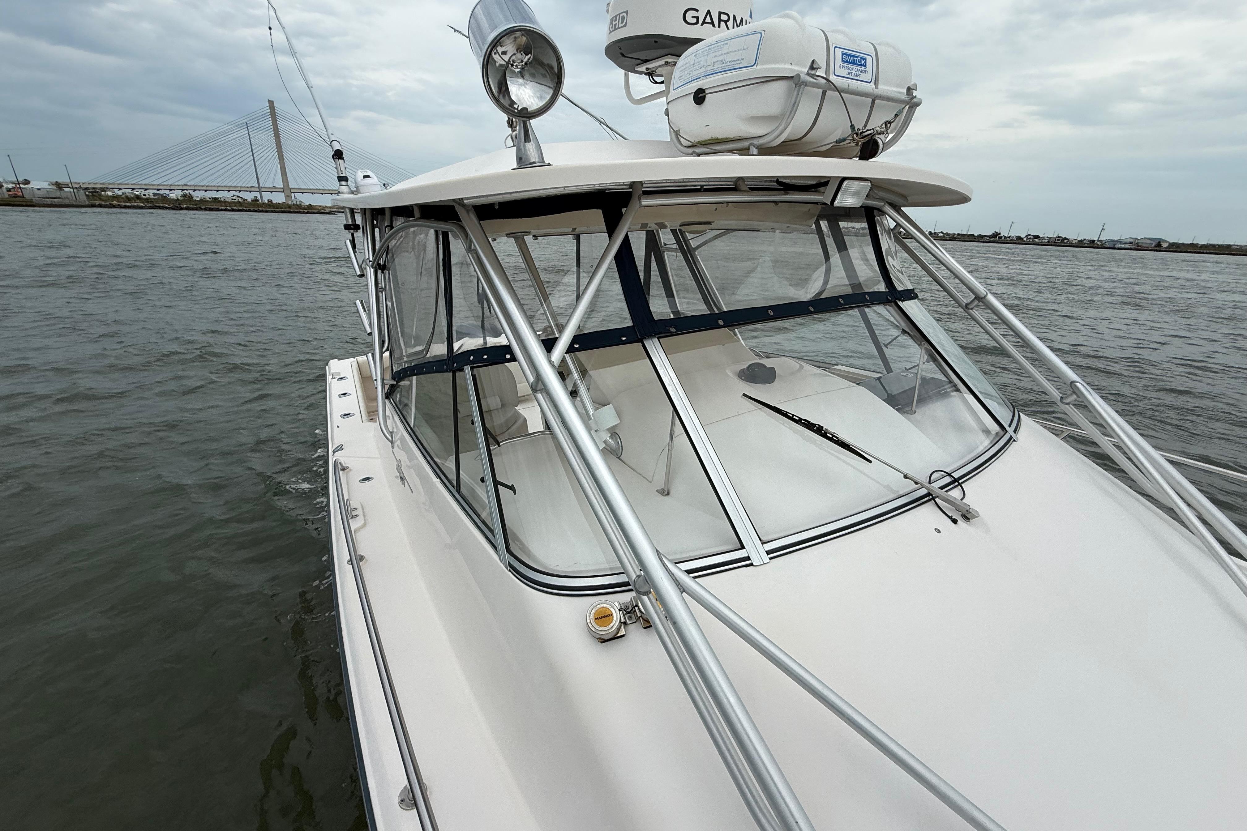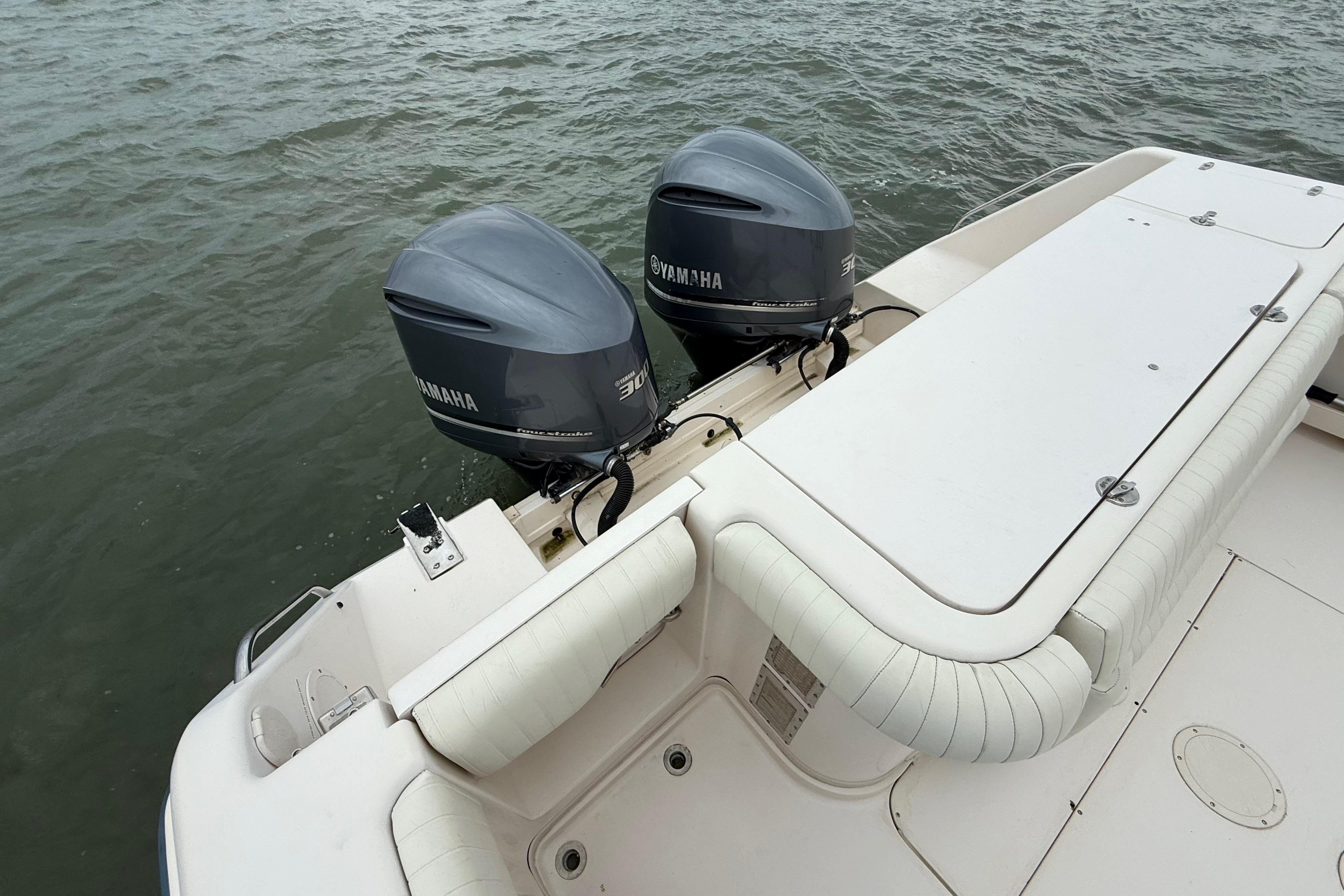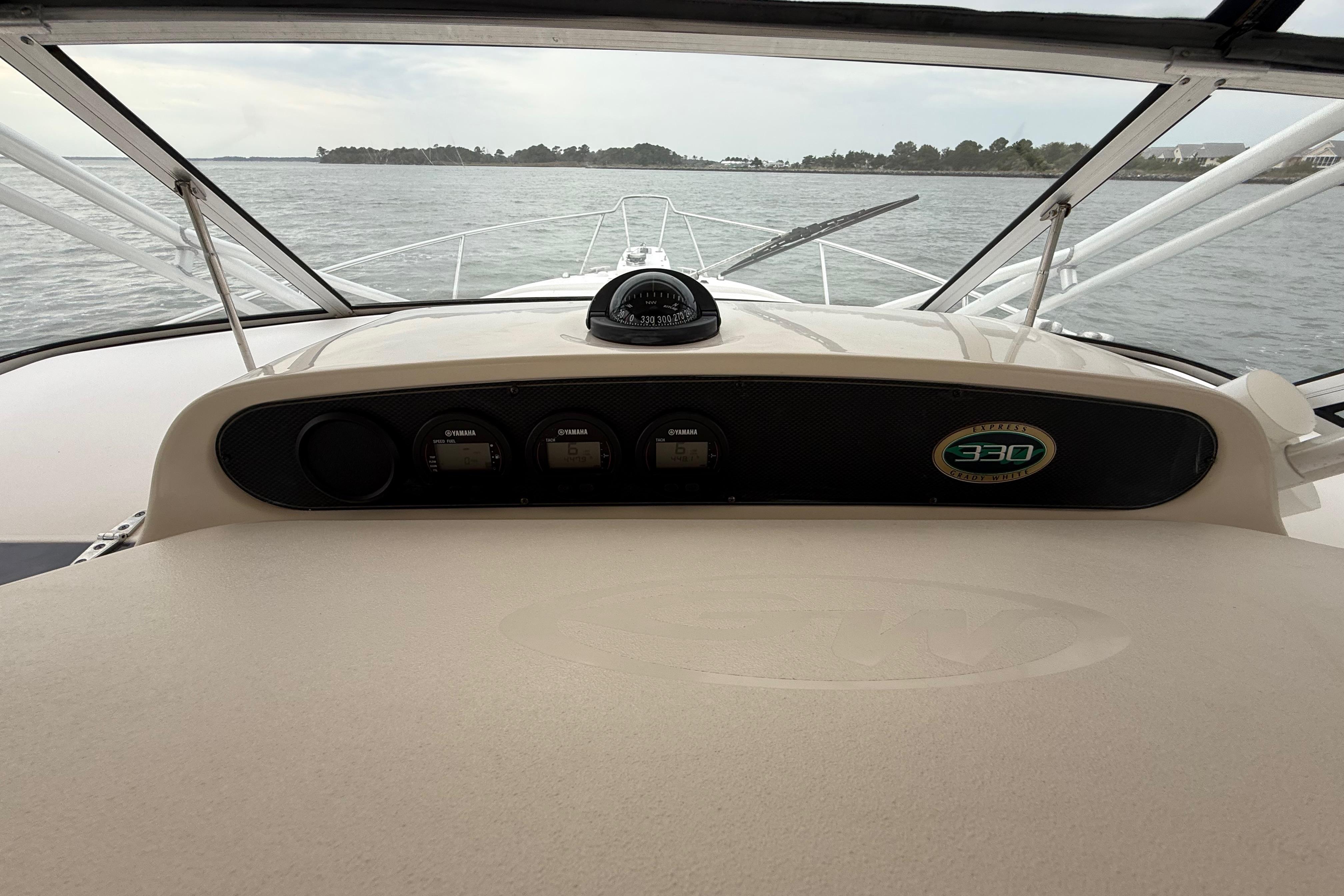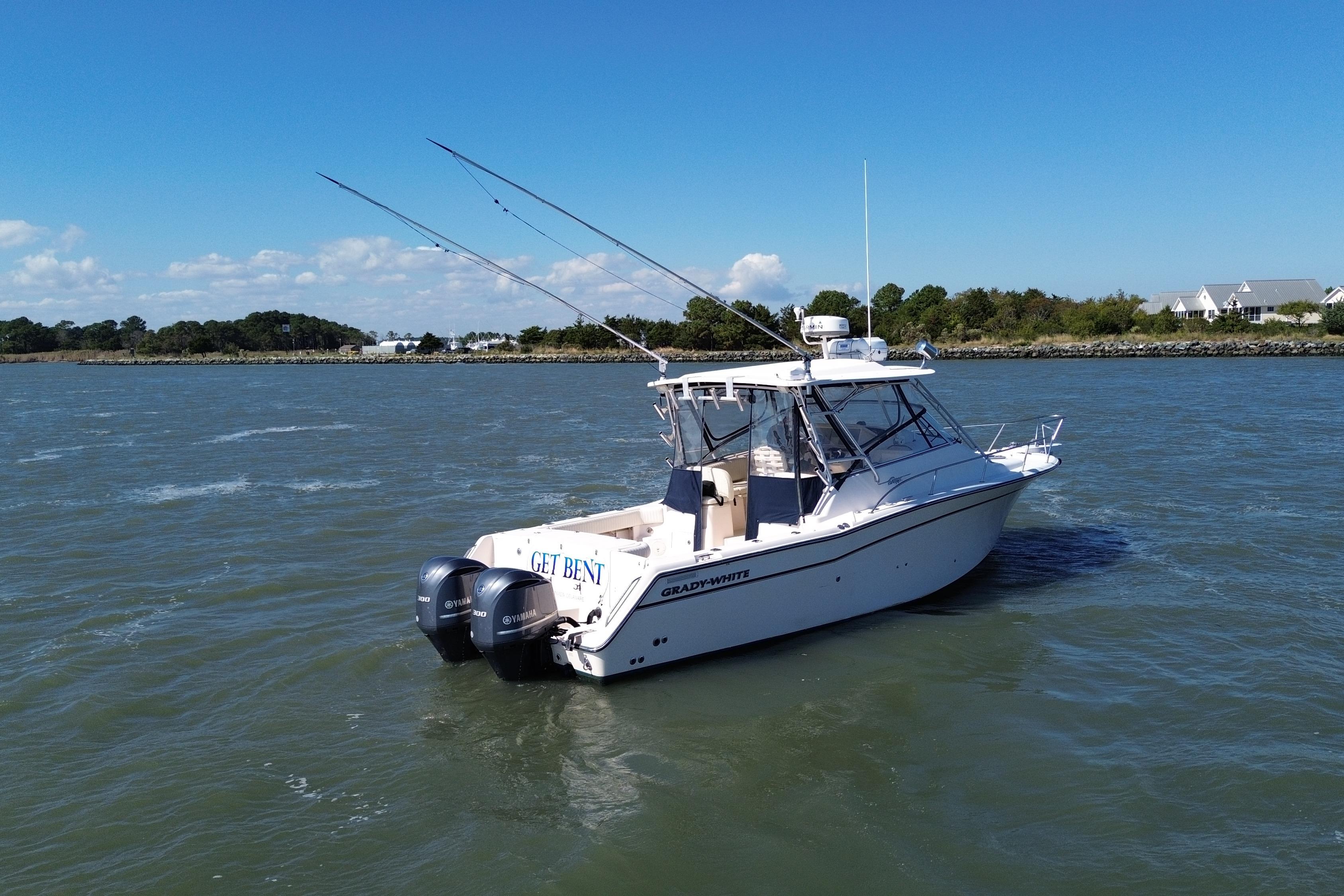 Introducing the " Get Bent" 2005 Grady-White Express 330, a stunning saltwater fishing vessel that combines performance and comfort. This boat boasts a sleek fiberglass hull designed in the innovative Sea-V2™ shape, ensuring stability and agility on the water. Powered by twin Yamaha 300 hp outboard engines, each with only 450 hours of use.