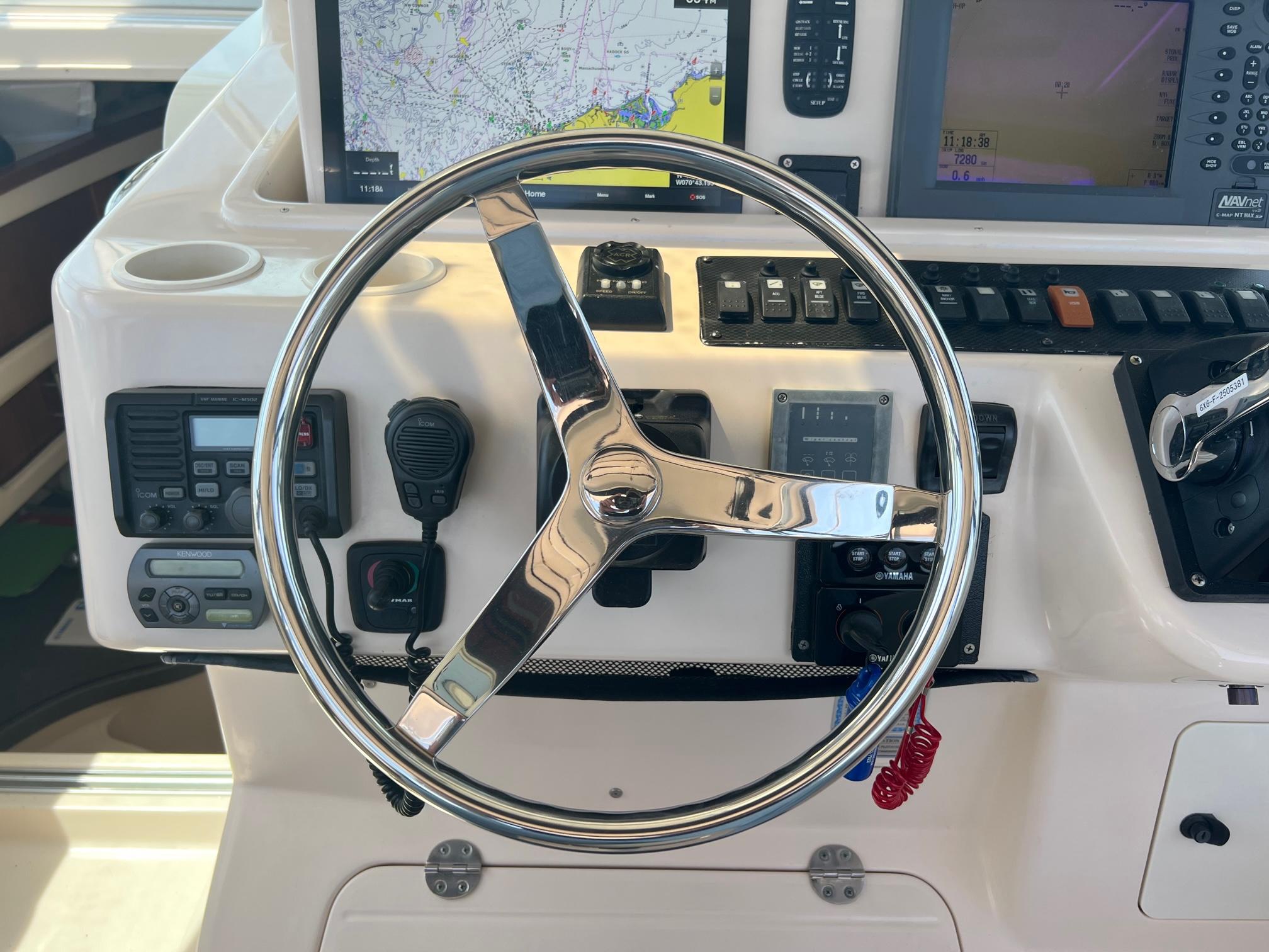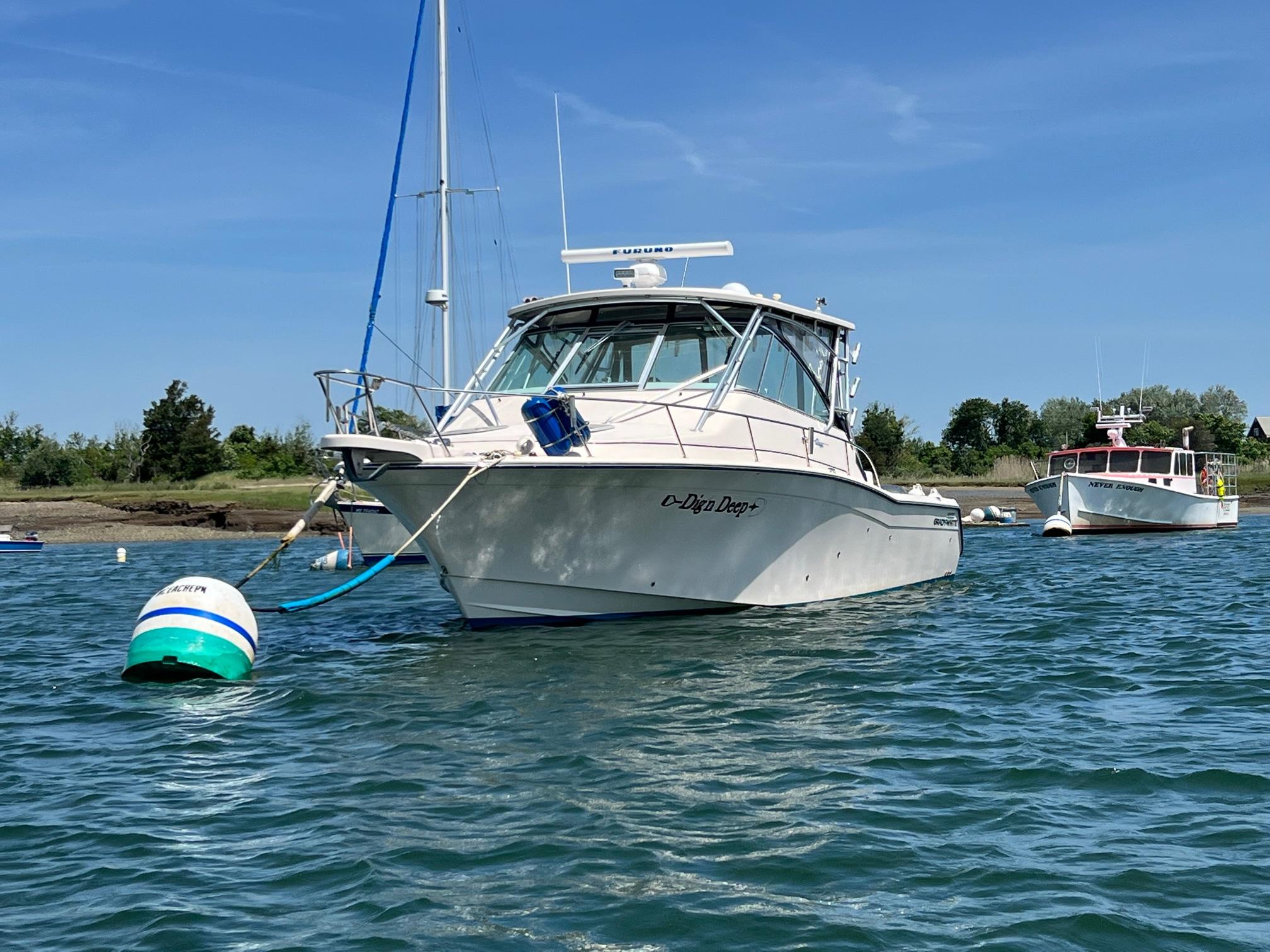 She has a large open cabin with additional aft cabin, full galley, dinette, enclosed head, hotwater. One of the best designed and comfortable boats in Grady's line up.