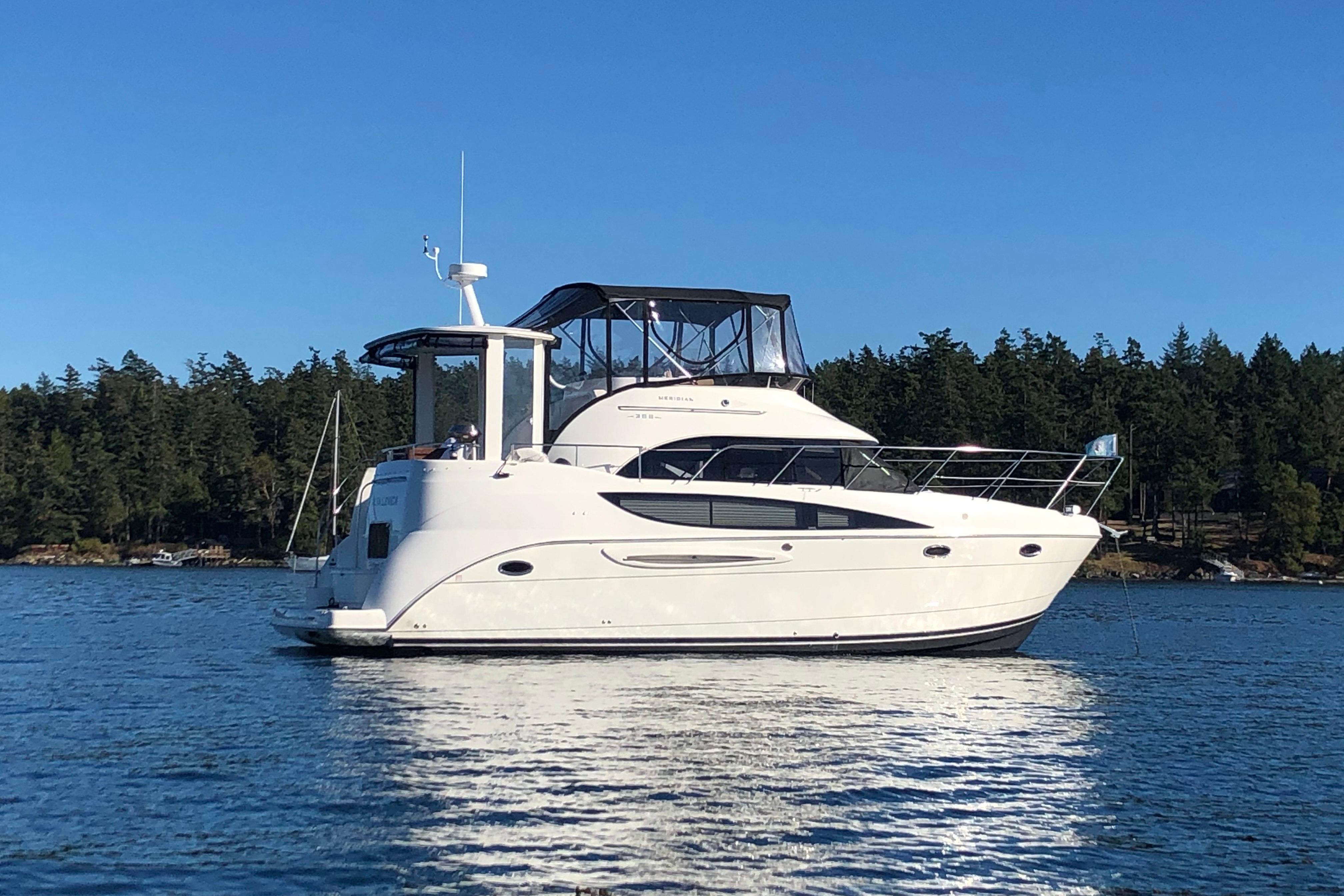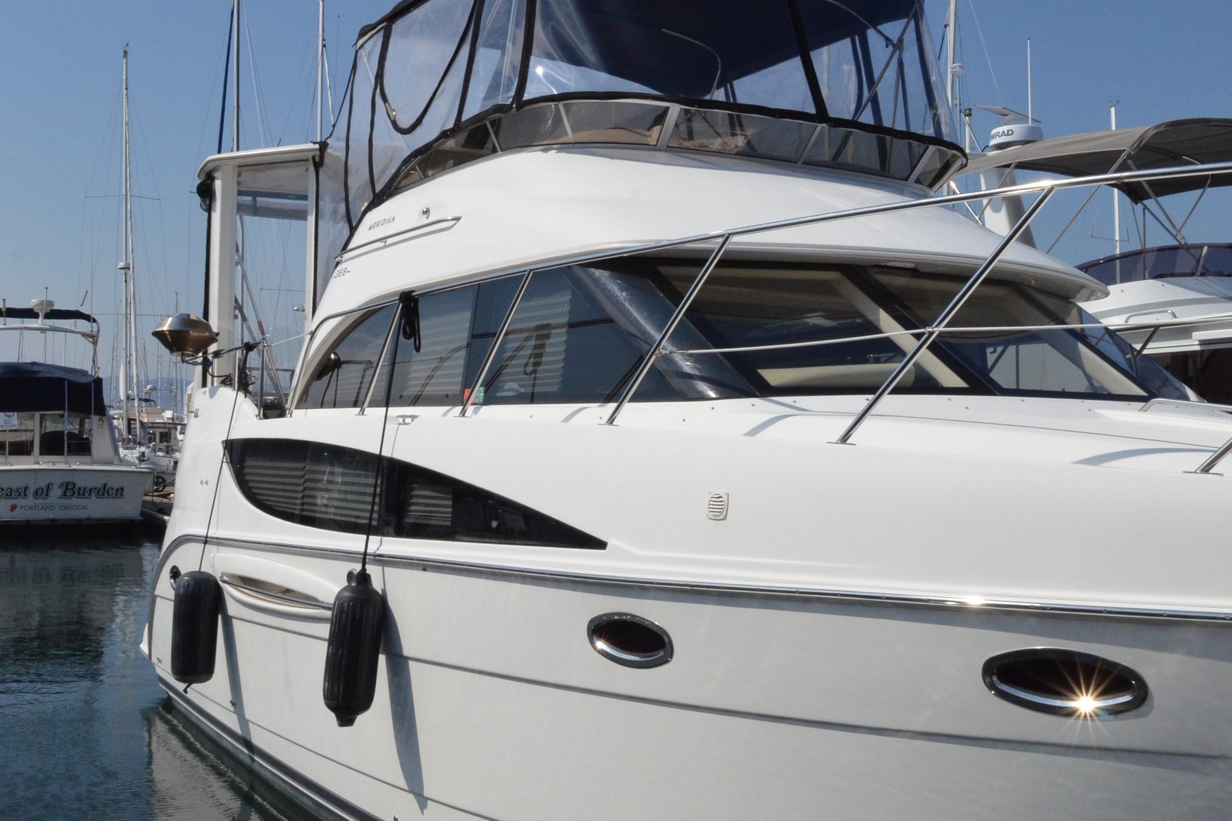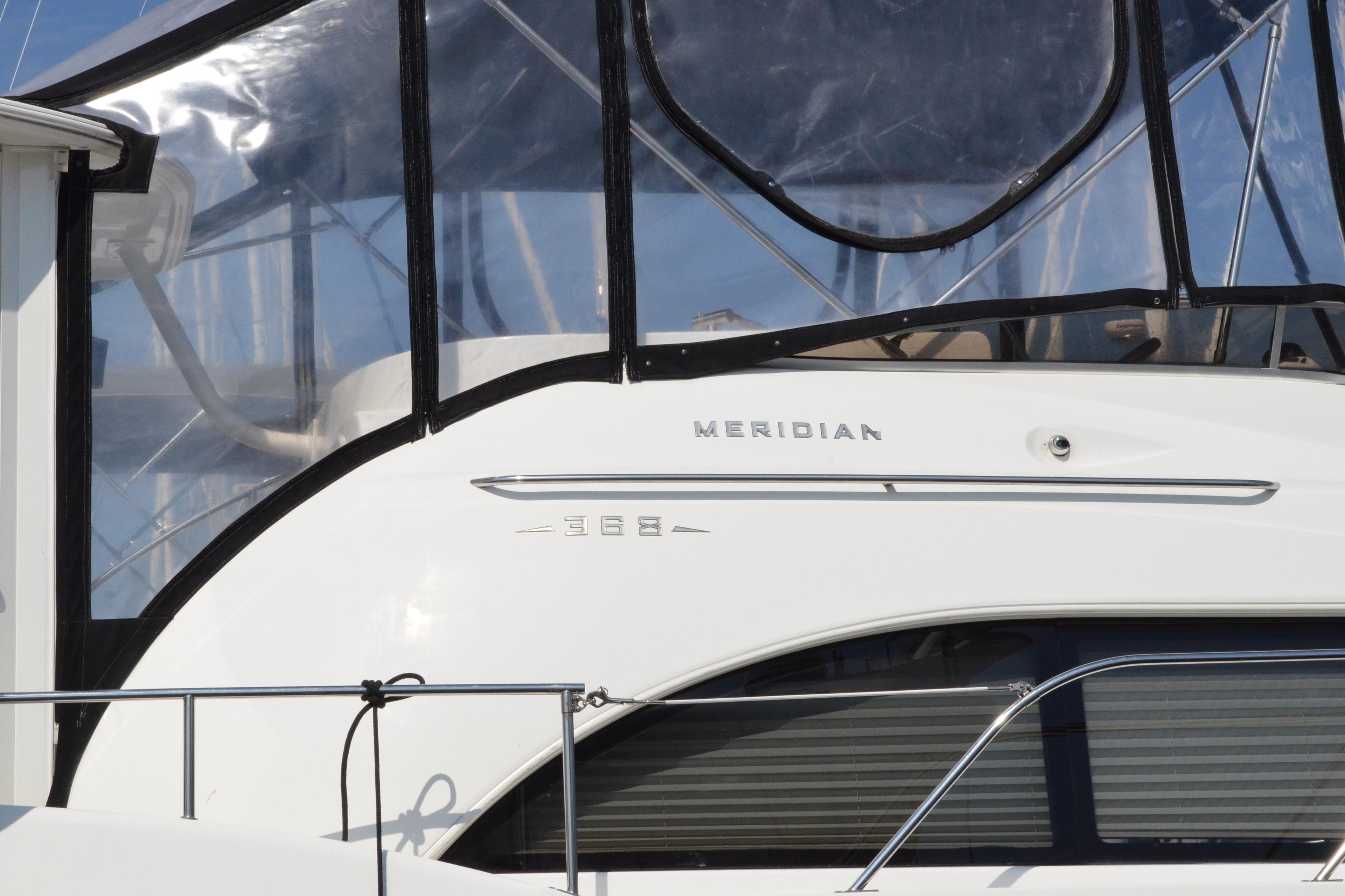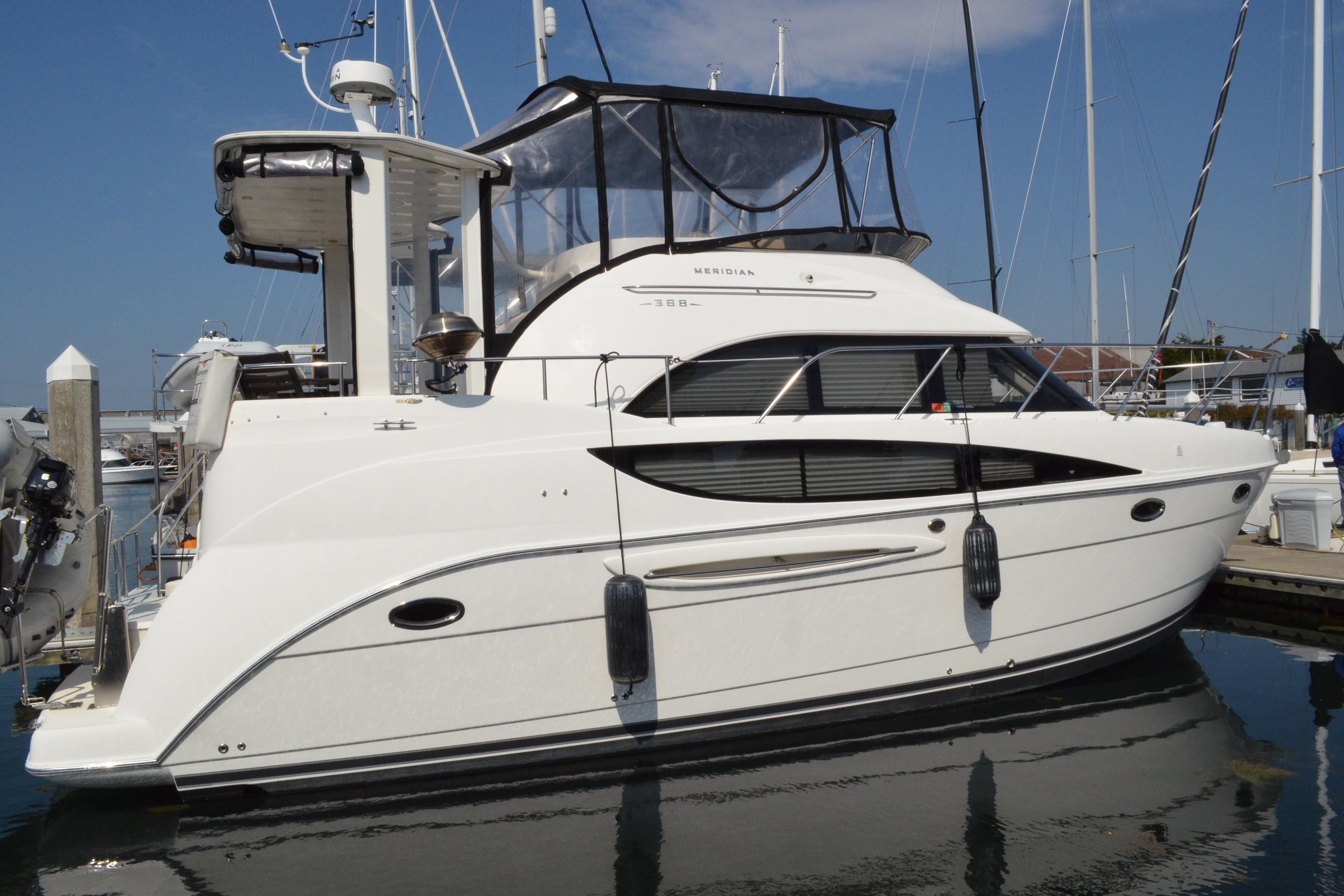 The Meridian 368 is a midrange cruiser with all the amenities of a larger cruising yacht in an efficient layout. This yacht features an aft, full-size master stateroom with queen-size berth and forward guest stateroom with large island berth. She also has two large heads with separate showers and private access to the staterooms. And her galley is well-appointed with a refrigerator/freezer, recessed two-burner cooktop and good storage space. Twin Cummins diesels and an Onan generator provide reliable power underway or at anchor. Three zones of reverse cycle heat and air-conditioning, a Weaver davit with a Highfield dinghy, propane BBQ, all the conveniences you would expect.