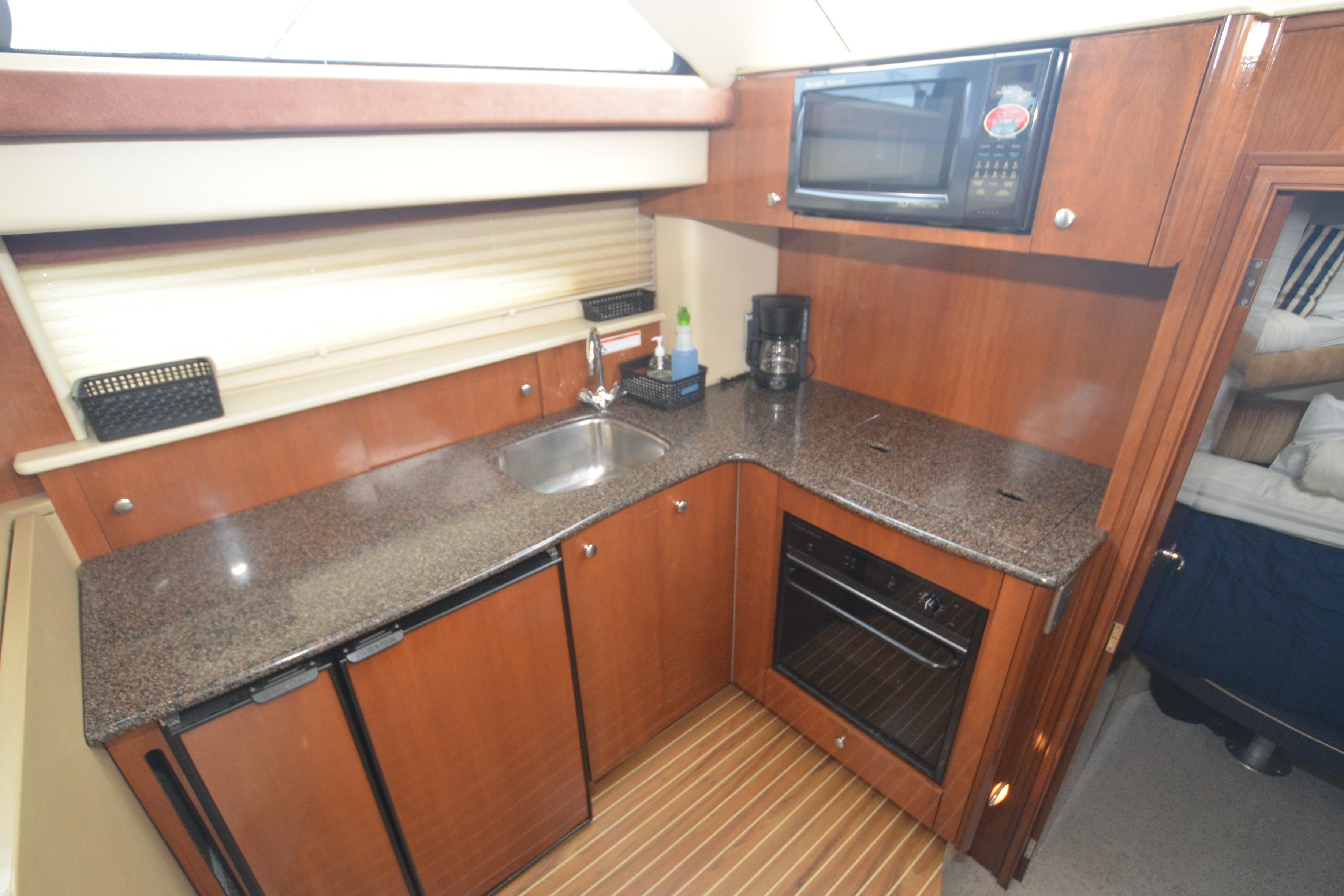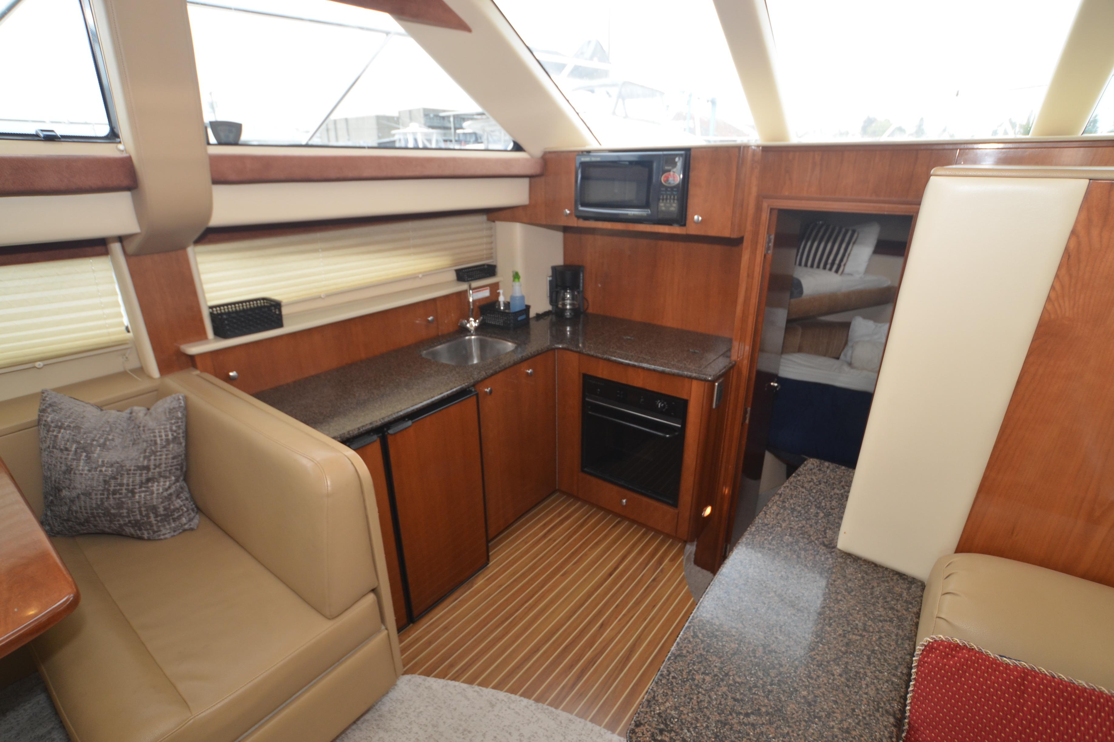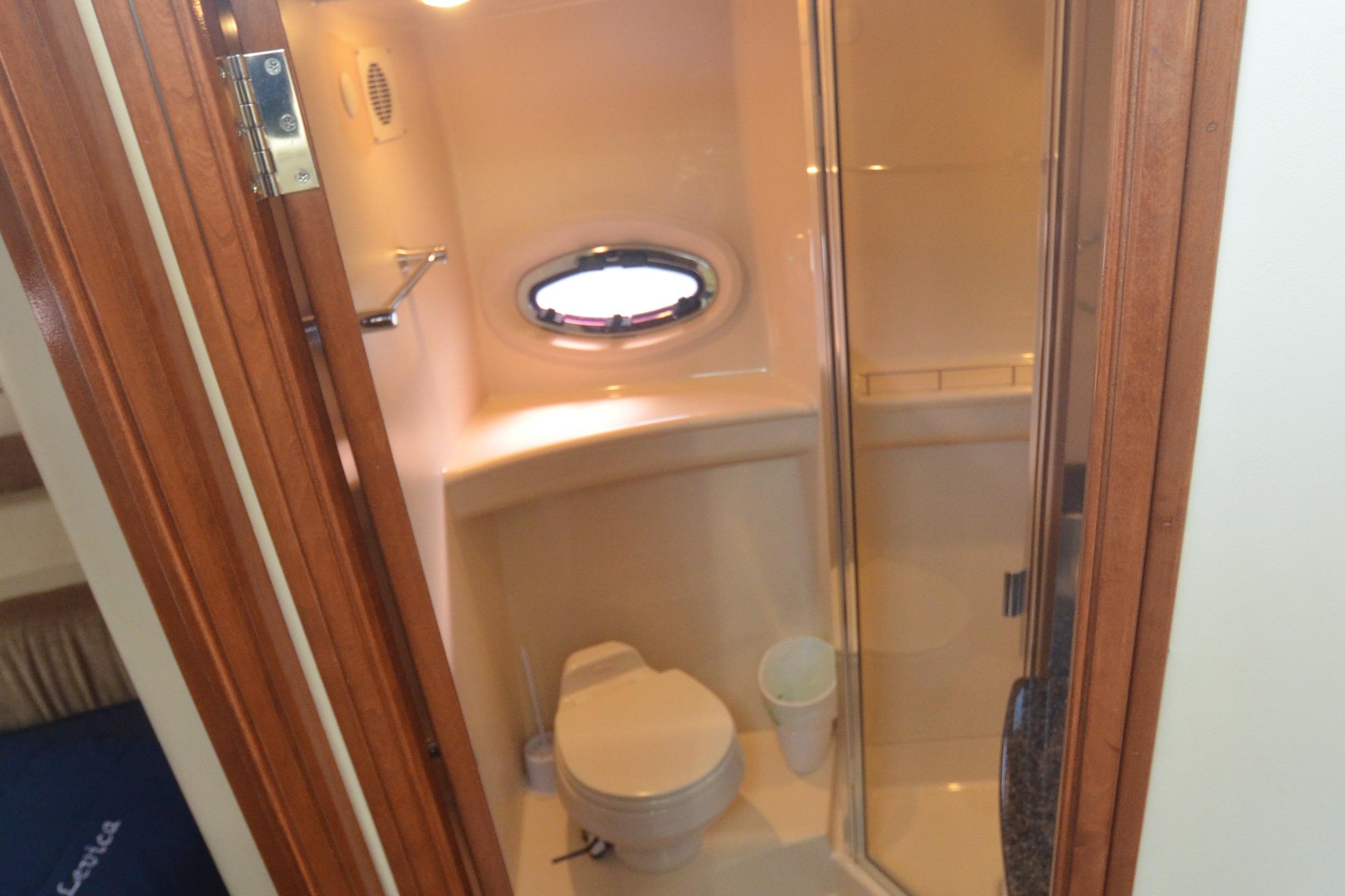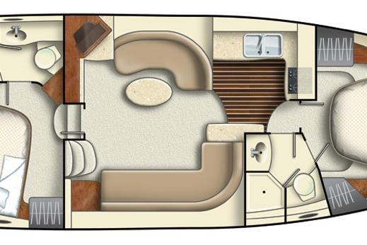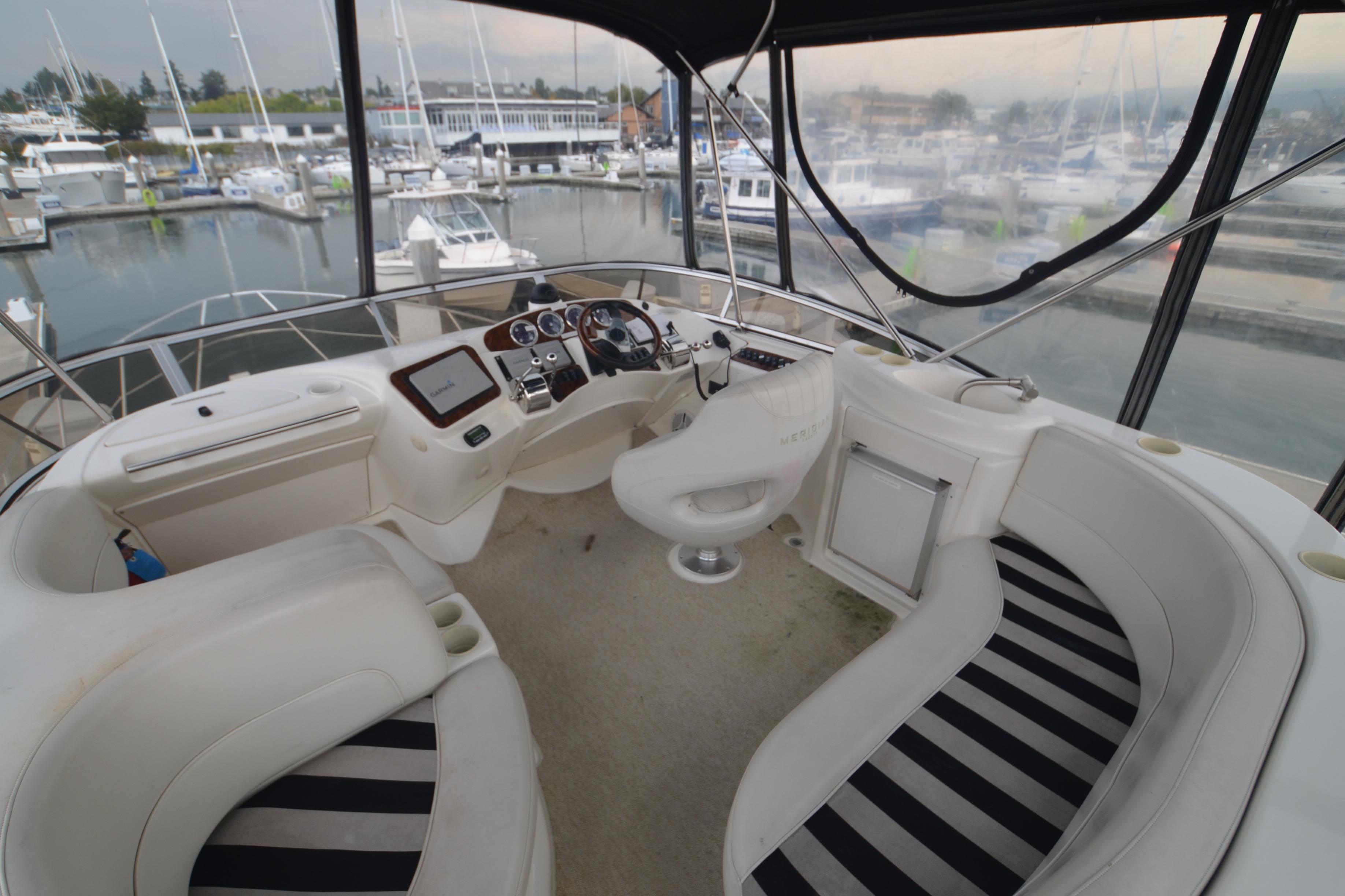 The Meridian 368 is a midrange cruiser with all the amenities of a larger cruising yacht in an efficient layout. This yacht features an aft, full-size master stateroom with queen-size berth and forward guest stateroom with large island berth. She also has two large heads with separate showers and private access to the staterooms. And her galley is well-appointed with a refrigerator/freezer, recessed two-burner cooktop and good storage space. Twin Cummins diesels and an Onan generator provide reliable power underway or at anchor. Three zones of reverse cycle heat and air-conditioning, a Weaver davit with a Highfield dinghy, propane BBQ, all the conveniences you would expect.