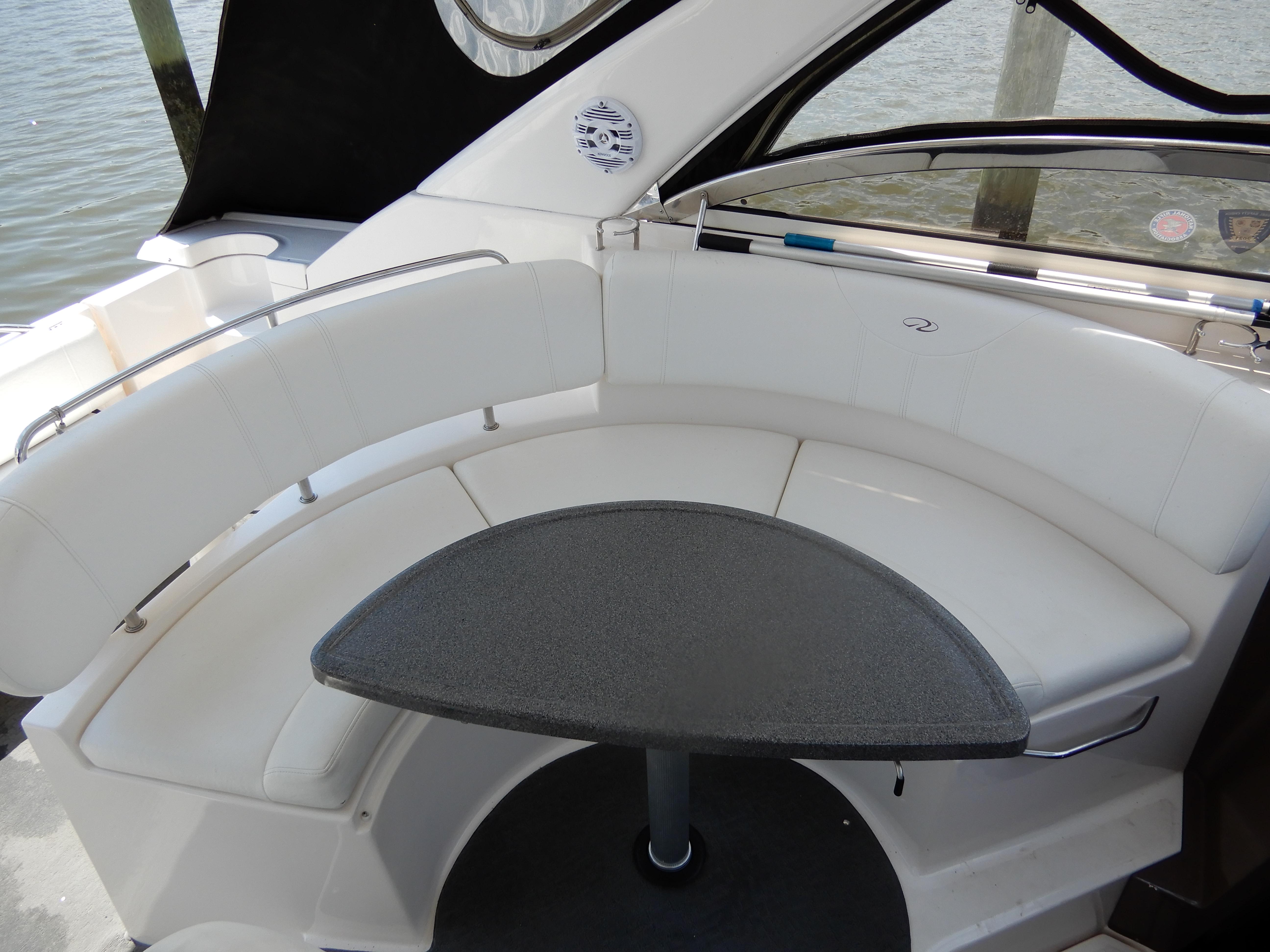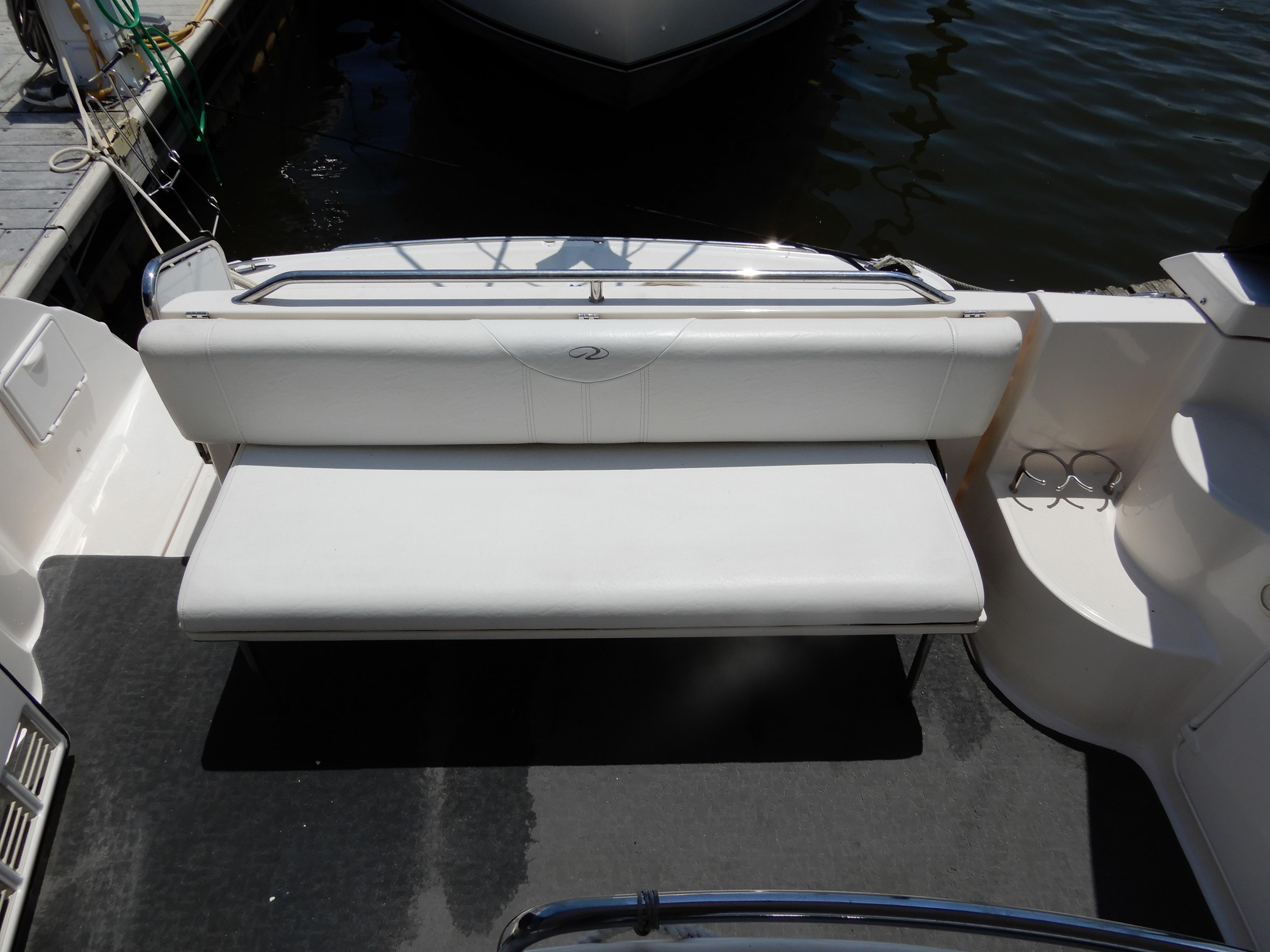 On deck, there is a fridge with Ice maker, ample seating, walk through windshield, full canvas, GPS, and death sounder, on the bow there is a lounger with cushions, and windlass.