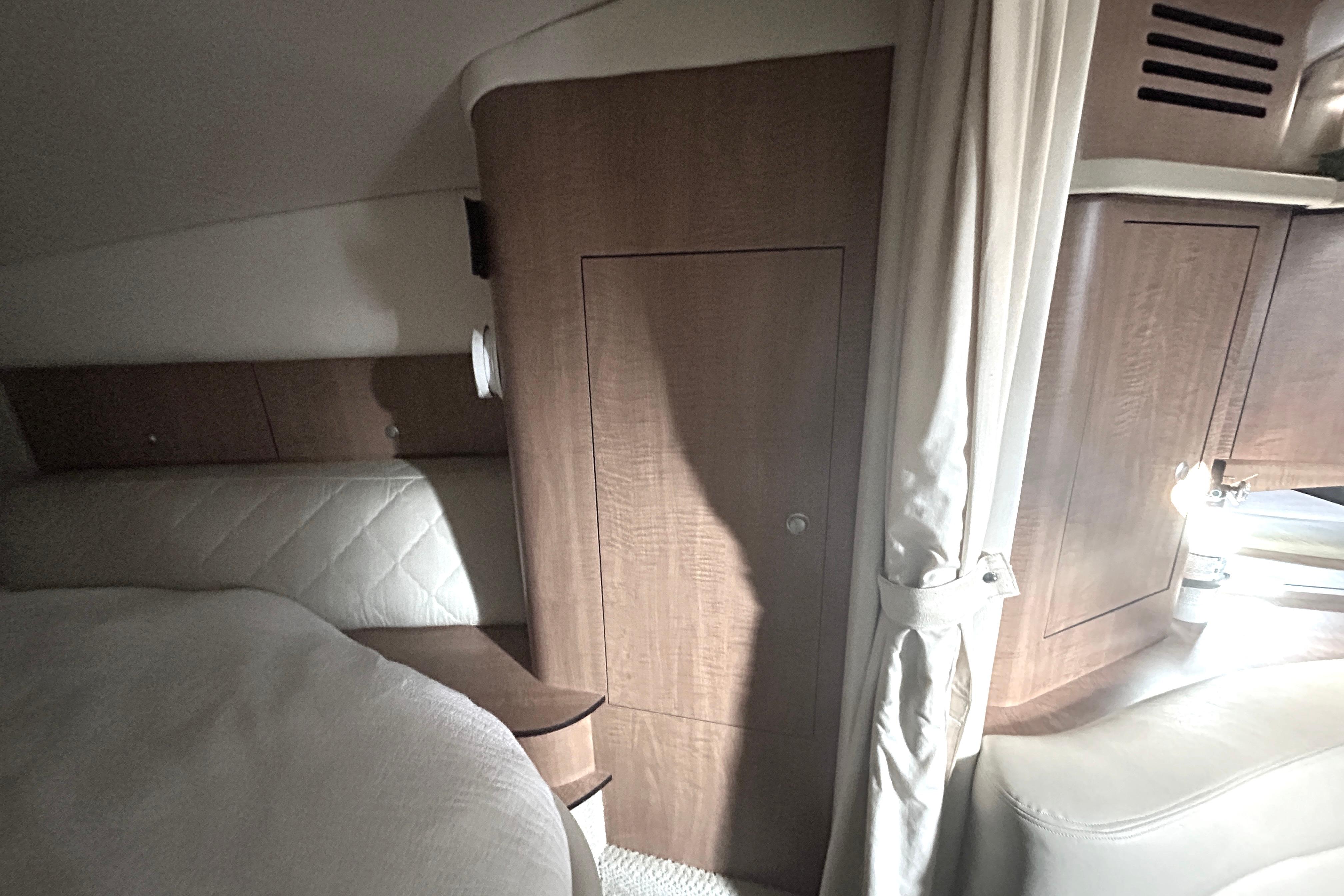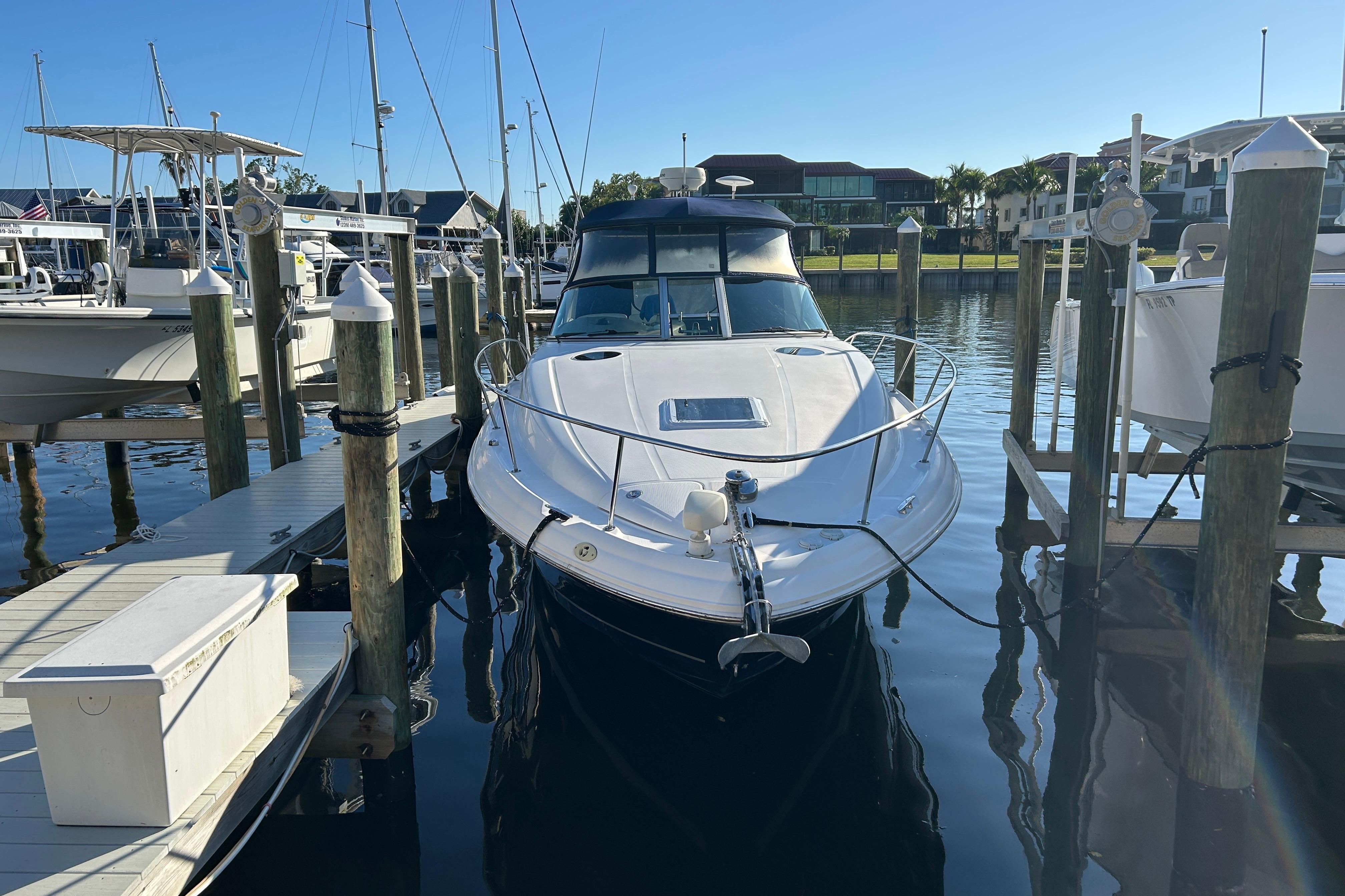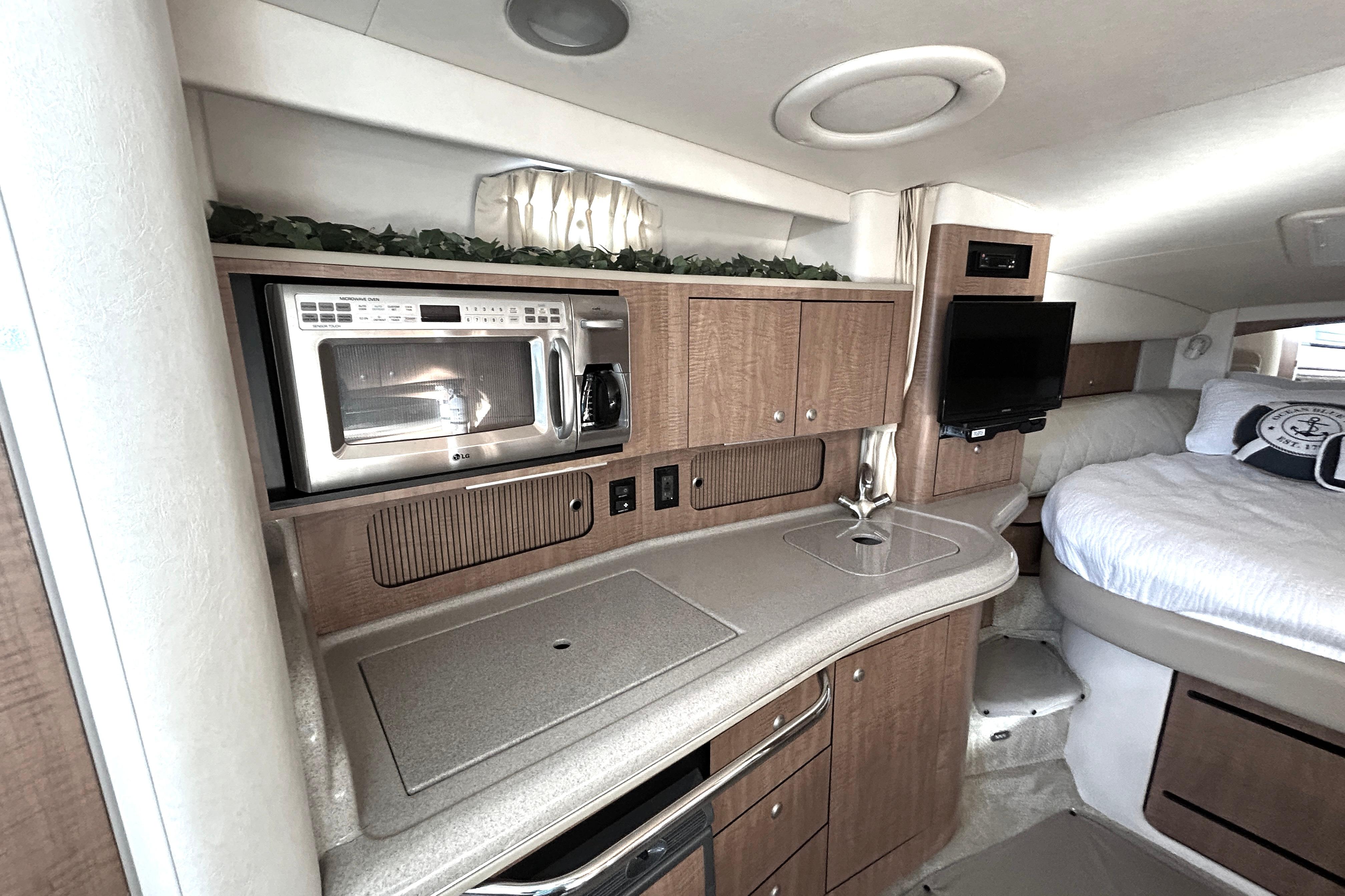 There's nothing quite like the exhilarating profile of this sleek 320 Sundancer. Its dramatic lines and bold colors make everything else look like it's sitting still. Exciting features include cockpit wet bar with Corian counter, extra-wide bench-style helm seating with two flip-up thigh-rise bolsters, optional underwater swim platform lighting, premium cabin surround sound, and lots more.