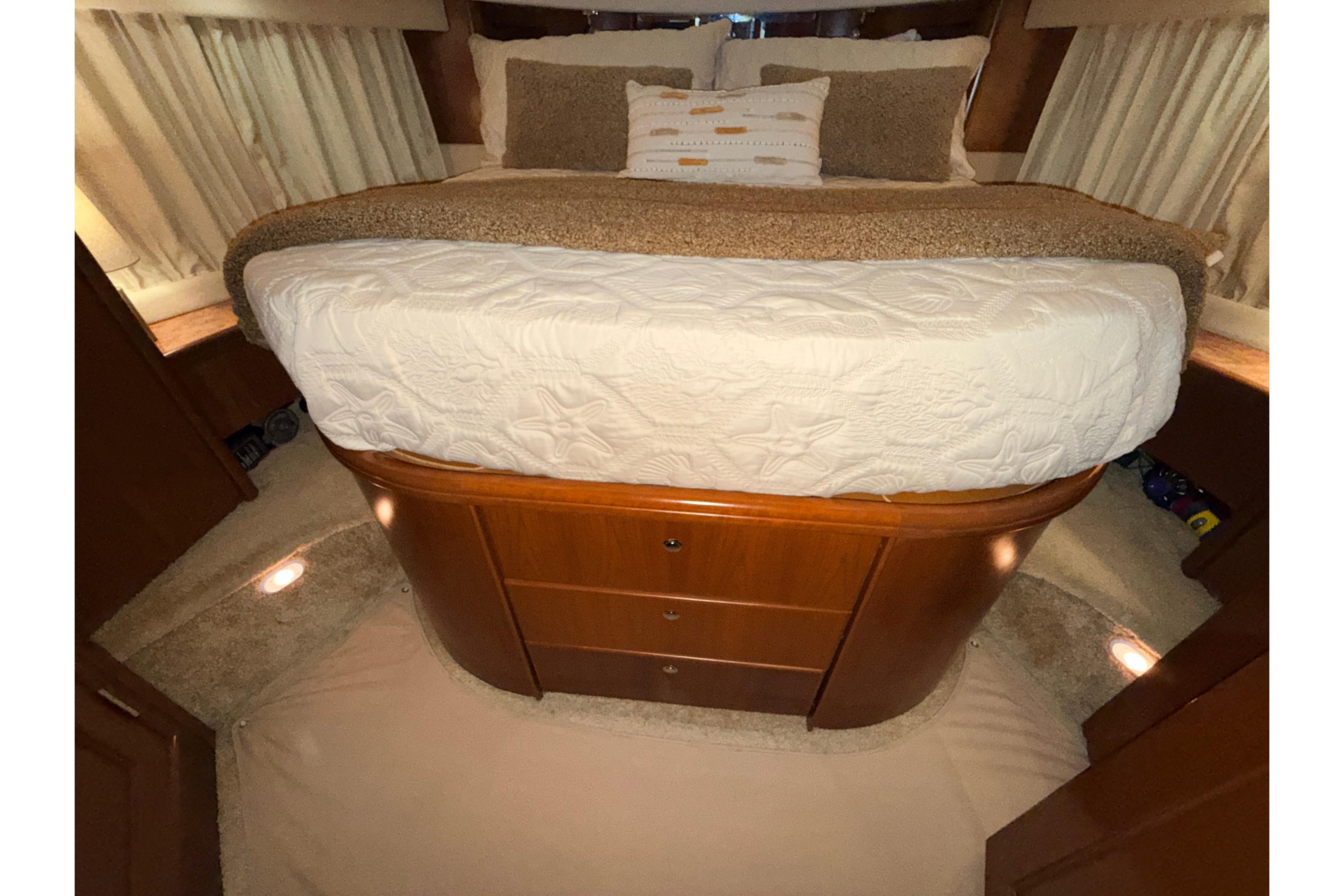 The forward master stateroom features a queen bed and plentiful storage in multiple drawers and lockers. The 2nd stateroom also features a queen bed but easily converts to two singles for guest flexibility.