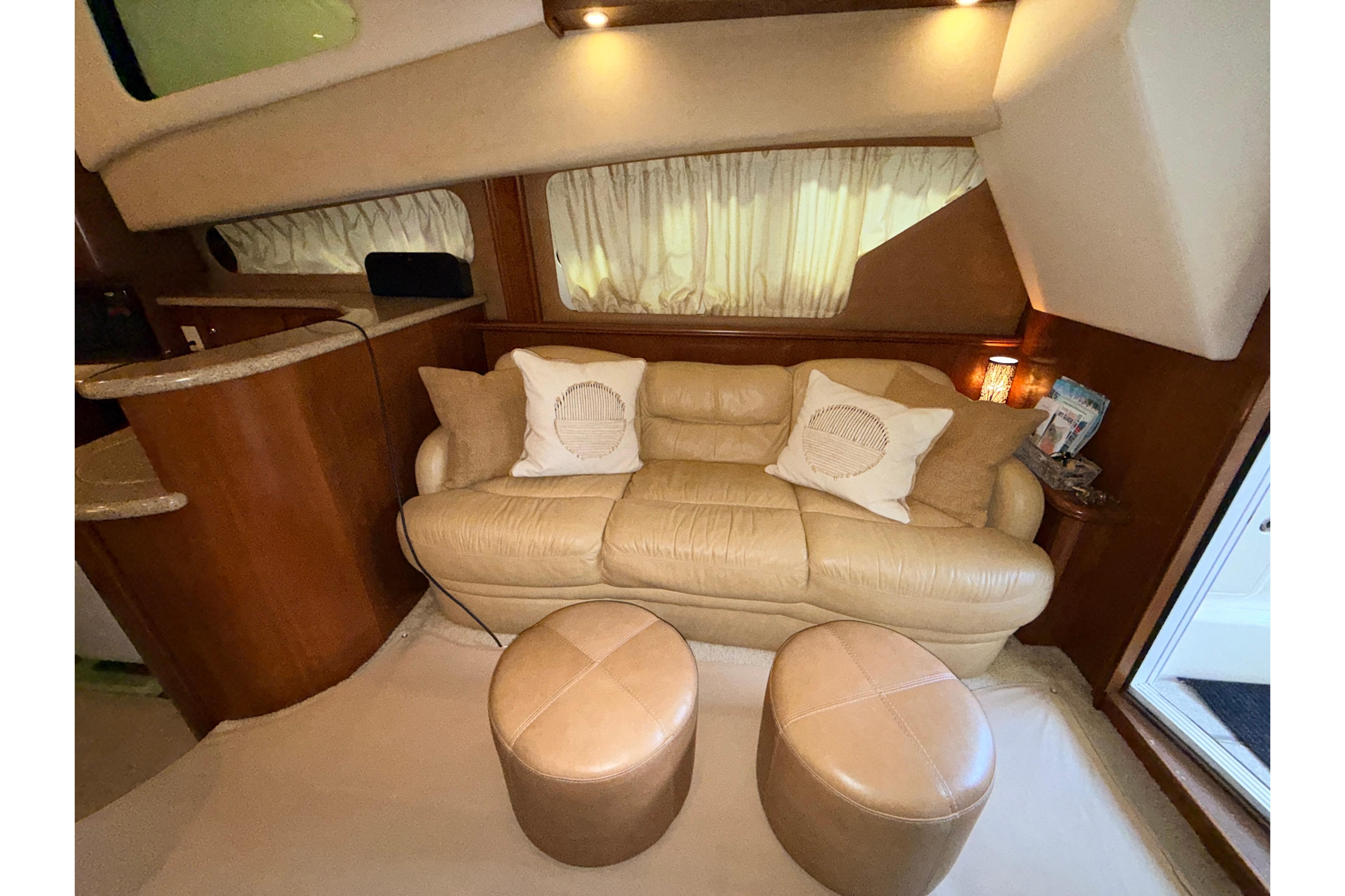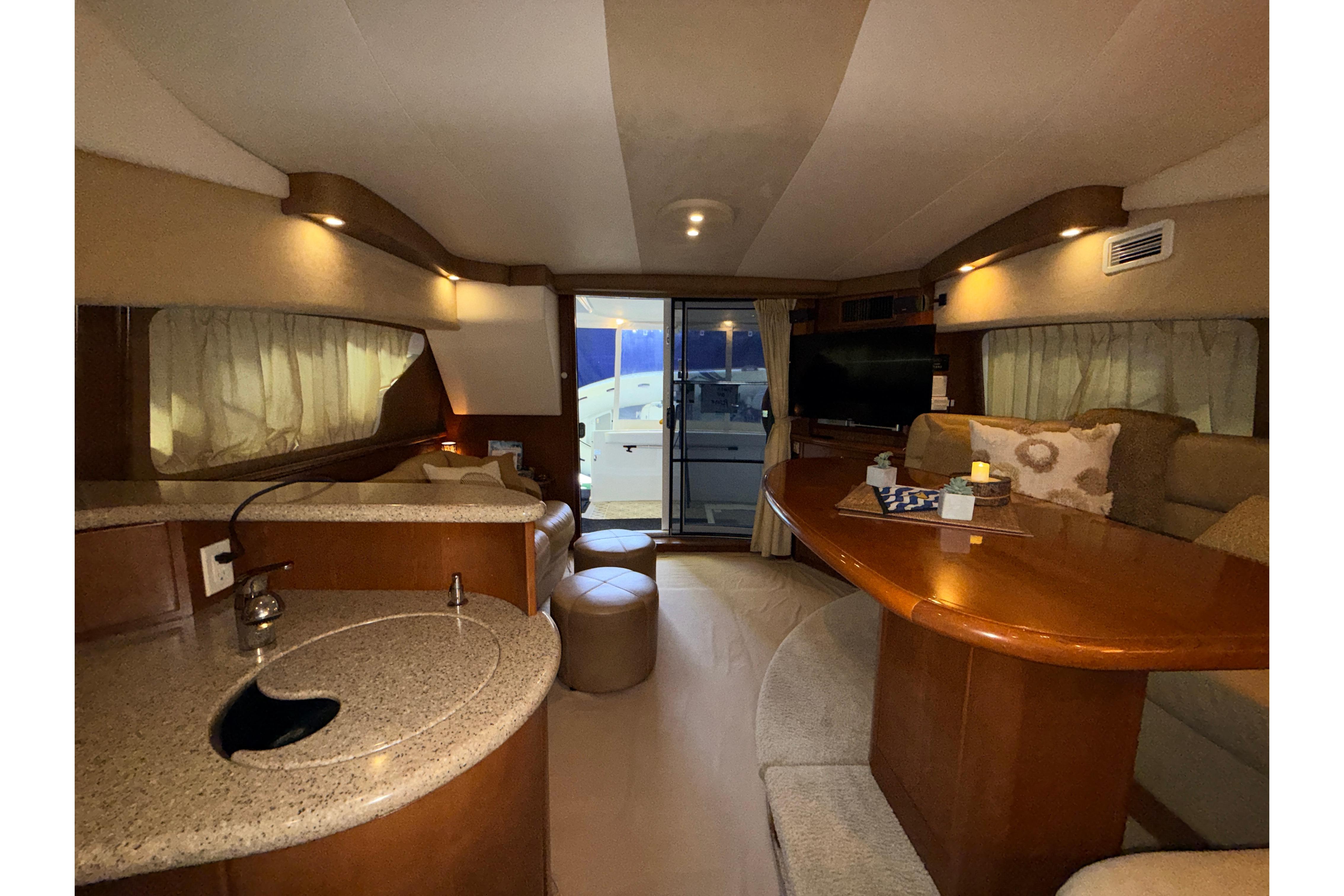 Guests will be surprised by the 38 Sport Bridge’s spaciousness as they enter through the stylishly curved door into a luxurious cherry-accented salon. This bright and airy space with 6'6" ceilings and large opening and screened windows is much larger than expected due to the 14’4” beam and unique design. To starboard is an electric convertible Ultraleather sofa, with 2 matching foot rests, that provides comfortable seating to enjoy the large salon TV (new) with Bose sound system and converts to a double bed when extra guests overnight. To port is the raised settee and high-gloss table. The open concept galley has everything needed for preparing great meals and is considerate of the chef that wants to still be part of the action.